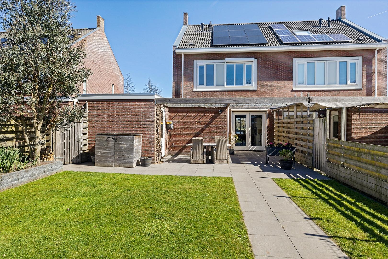 De achtertuin is een van de sterke punten van deze woning: verrassend diep, verzorgd aangelegd en gelegen op het westen, waardoor je hier volop geniet van de middag- en avondzon. In de tuin staat een vrijstaand, geïsoleerd tuinhuis met elektra en wateraansluiting — ideaal als hobbyruimte of werkplek.
