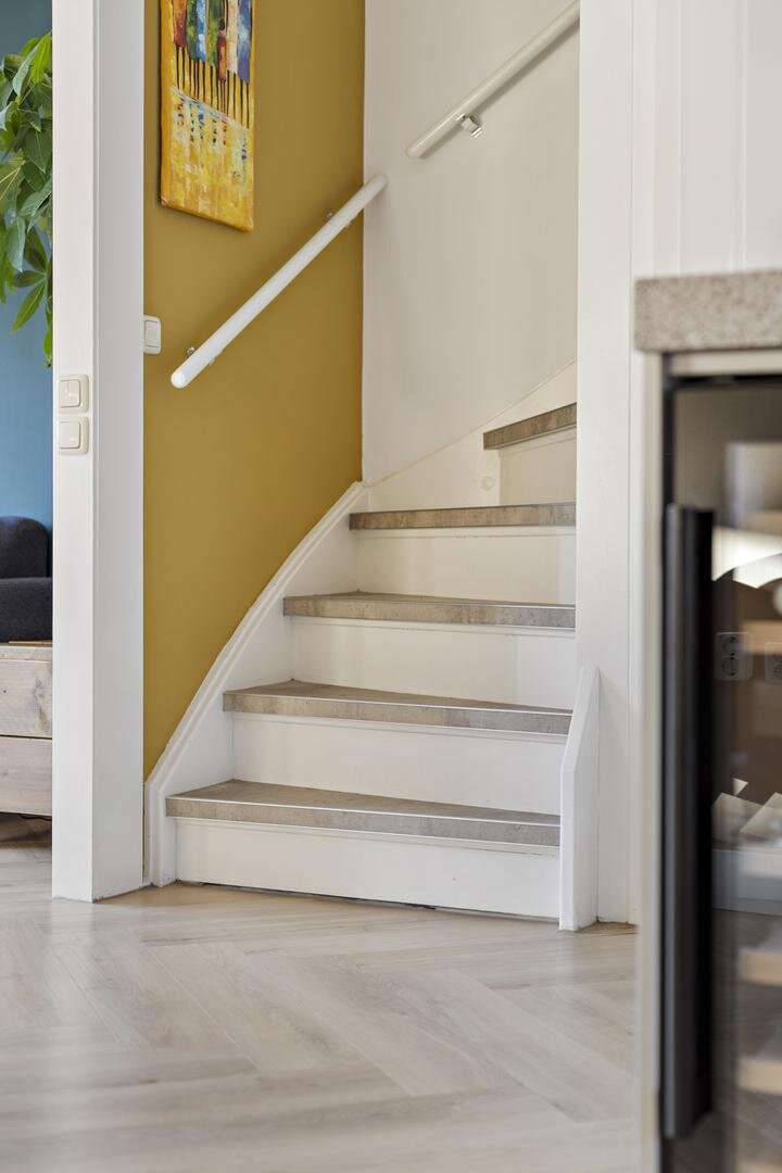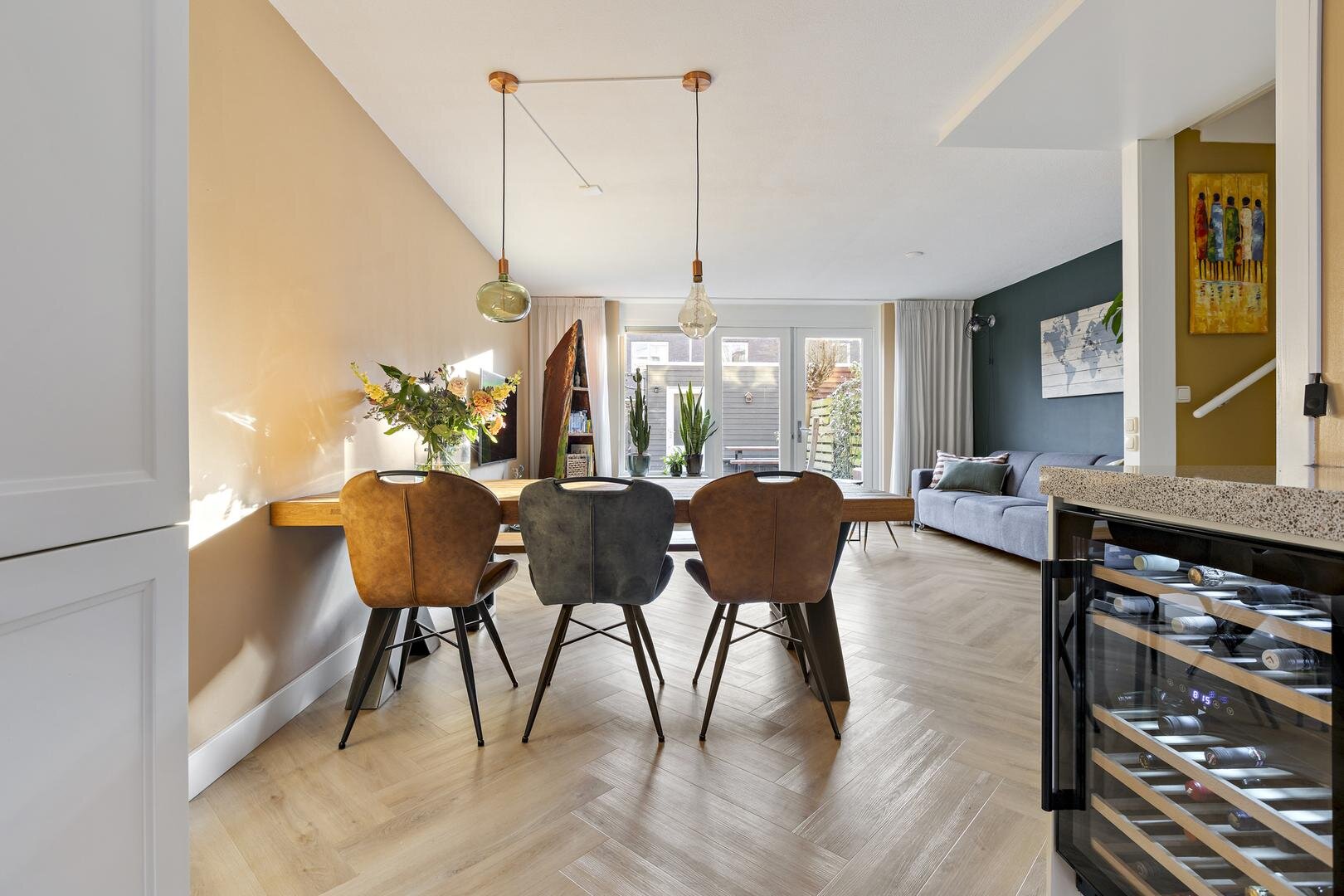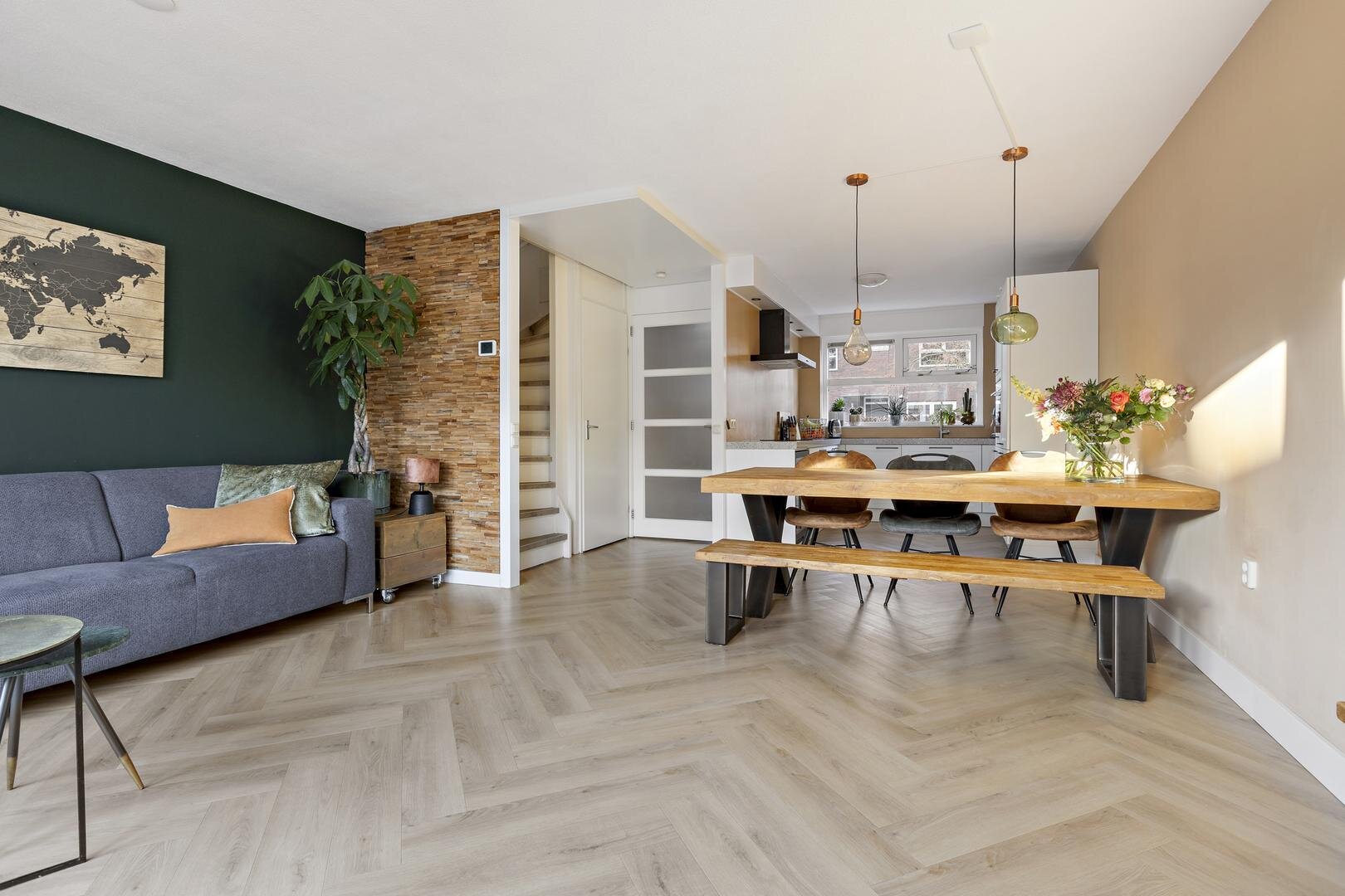 Begane grond: entree/hal, toiletruimte, lichte en tuingerichte woonkamer van ca. 27 m² met openslaande deuren naar de achtertuin. De woonkamer voelt extra ruimtelijk doordat een stuk van de hal bij de woonkamer is getrokken. De open keuken van ca. 8 m² is voorzien van een luxe keukenopstelling met inductiekookplaat, afzuigkap, combi-oven, koel-vriescombinatie, vaatwasser en wijnkoeler.