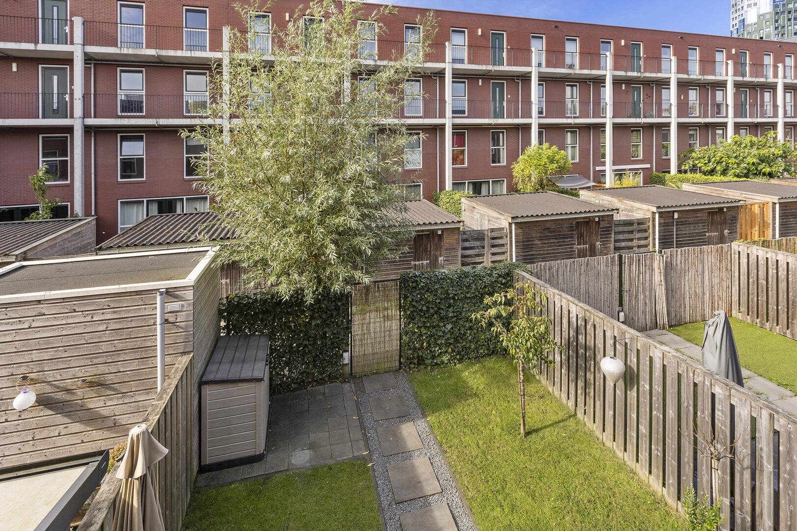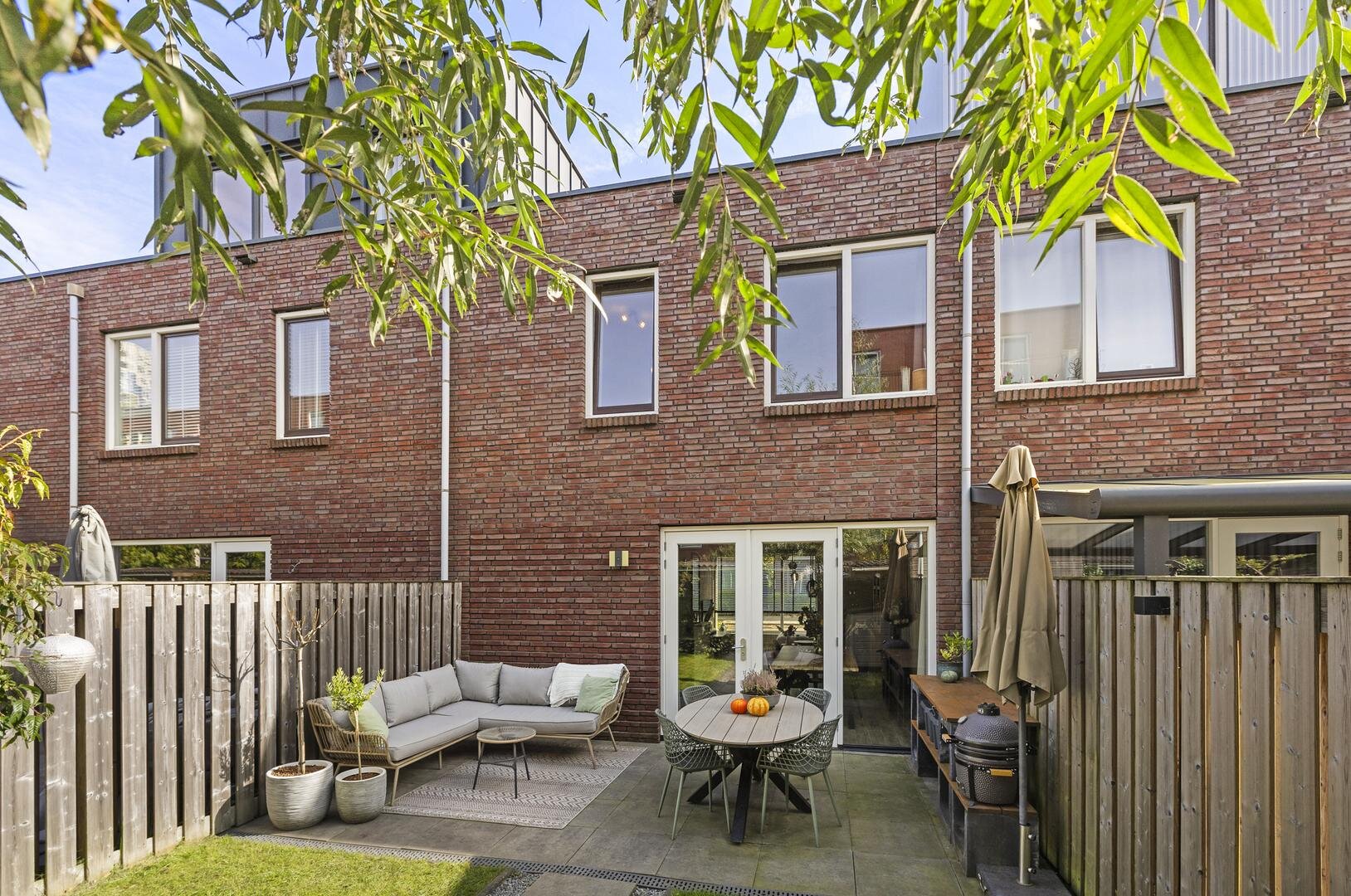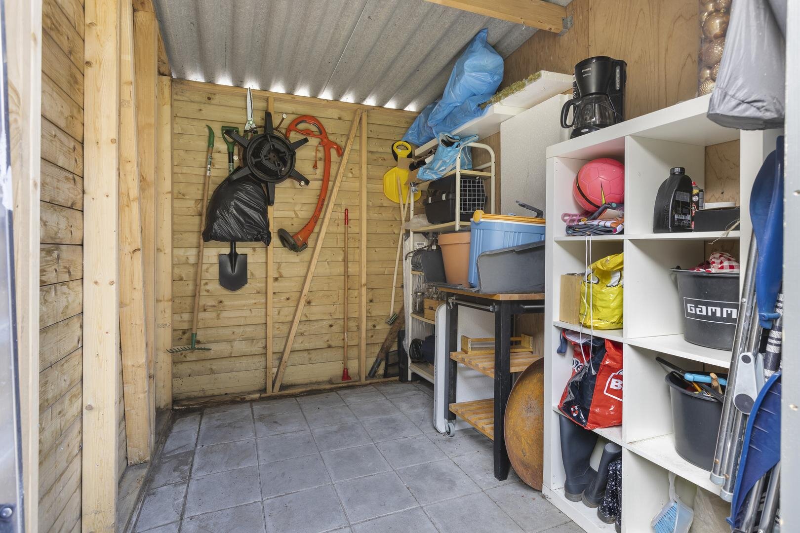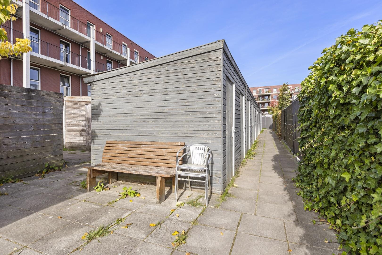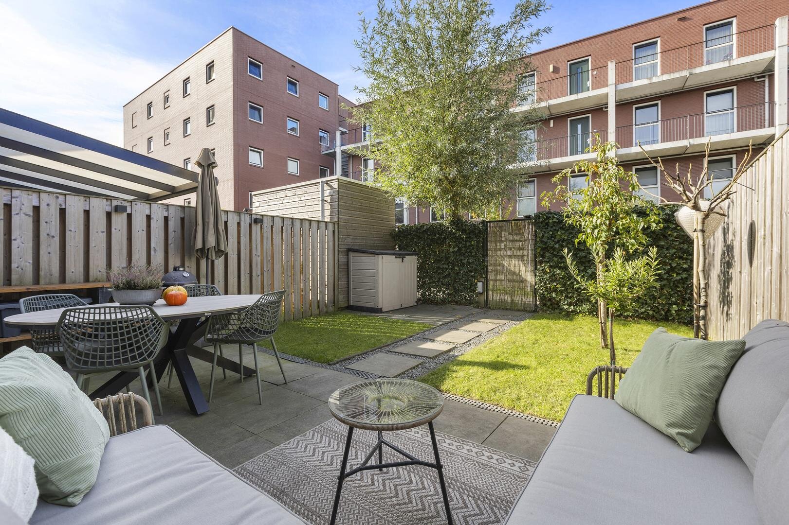 Netjes aangelegde tuin met terras, gelegen op het noordwesten, waar je tot laat op de dag kunt genieten van de zon. Via de achter gelegen brandgang (afsluitbaar) is de houten berging bereikbaar.