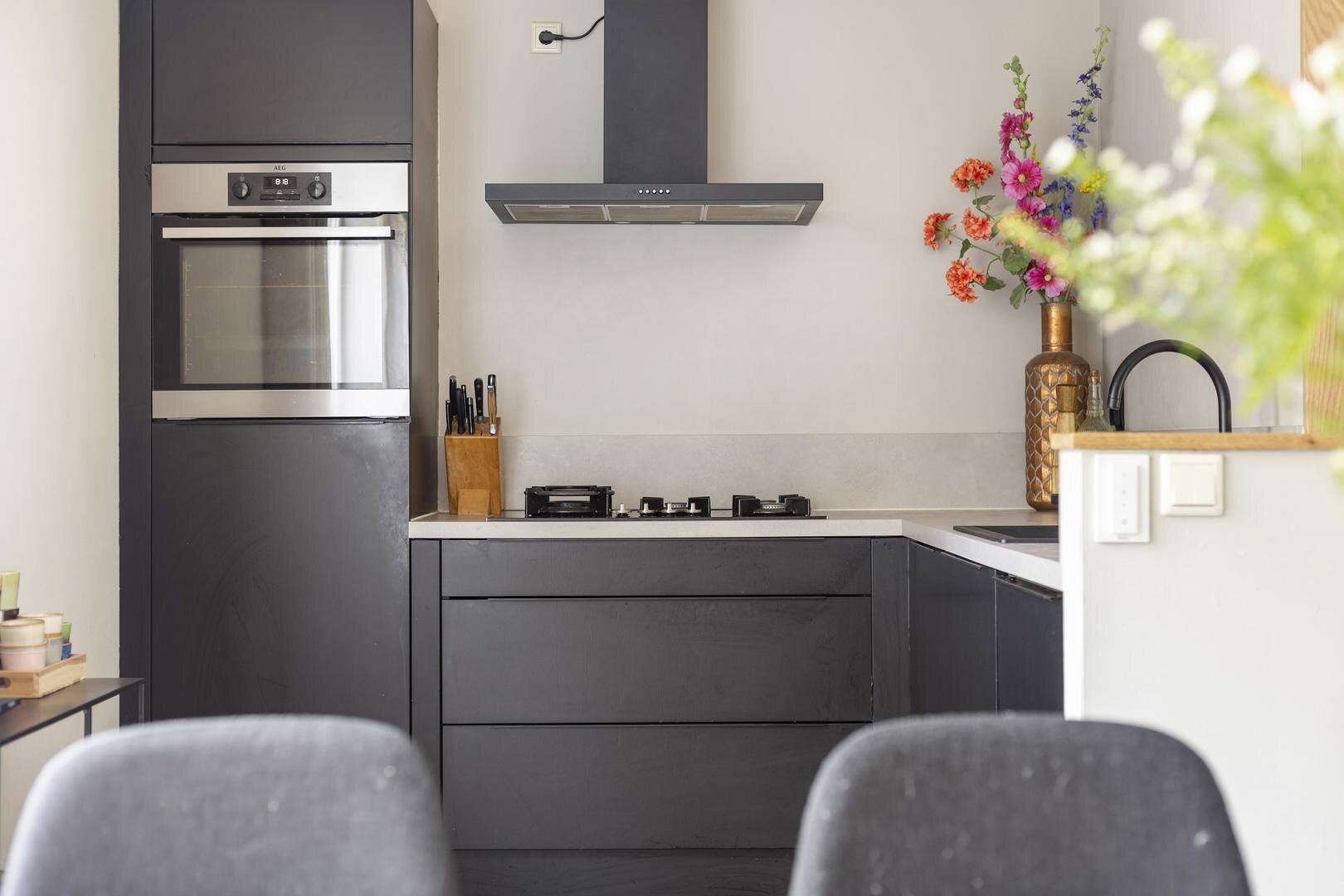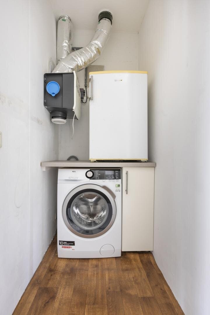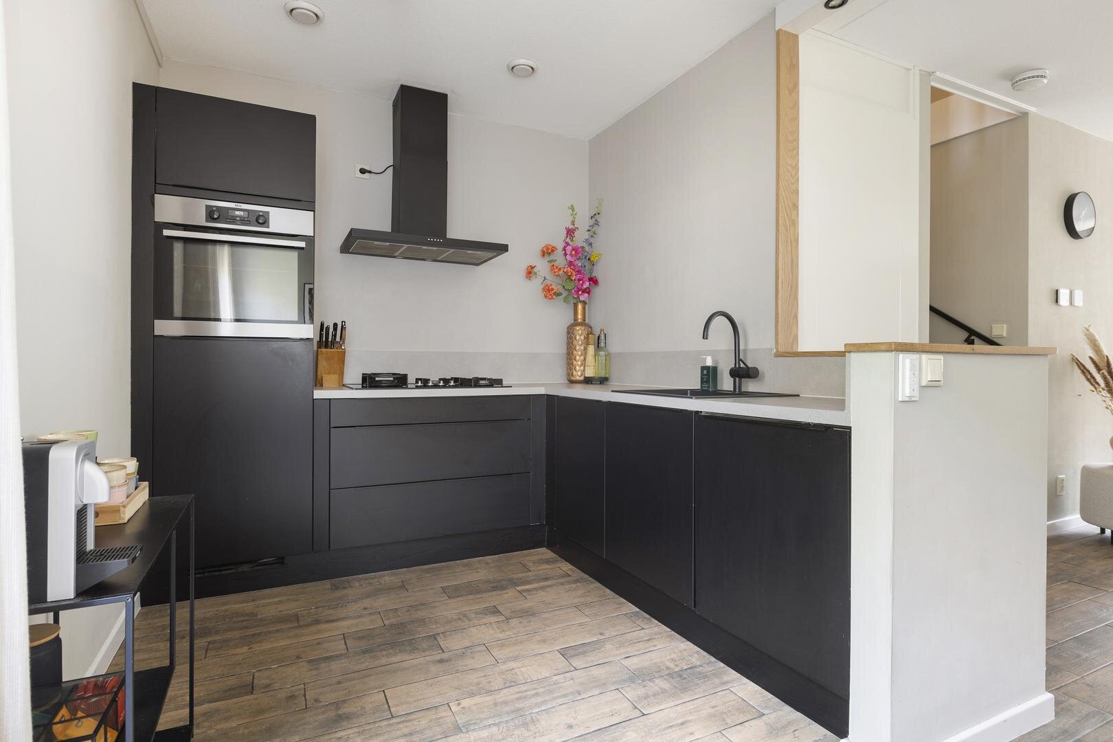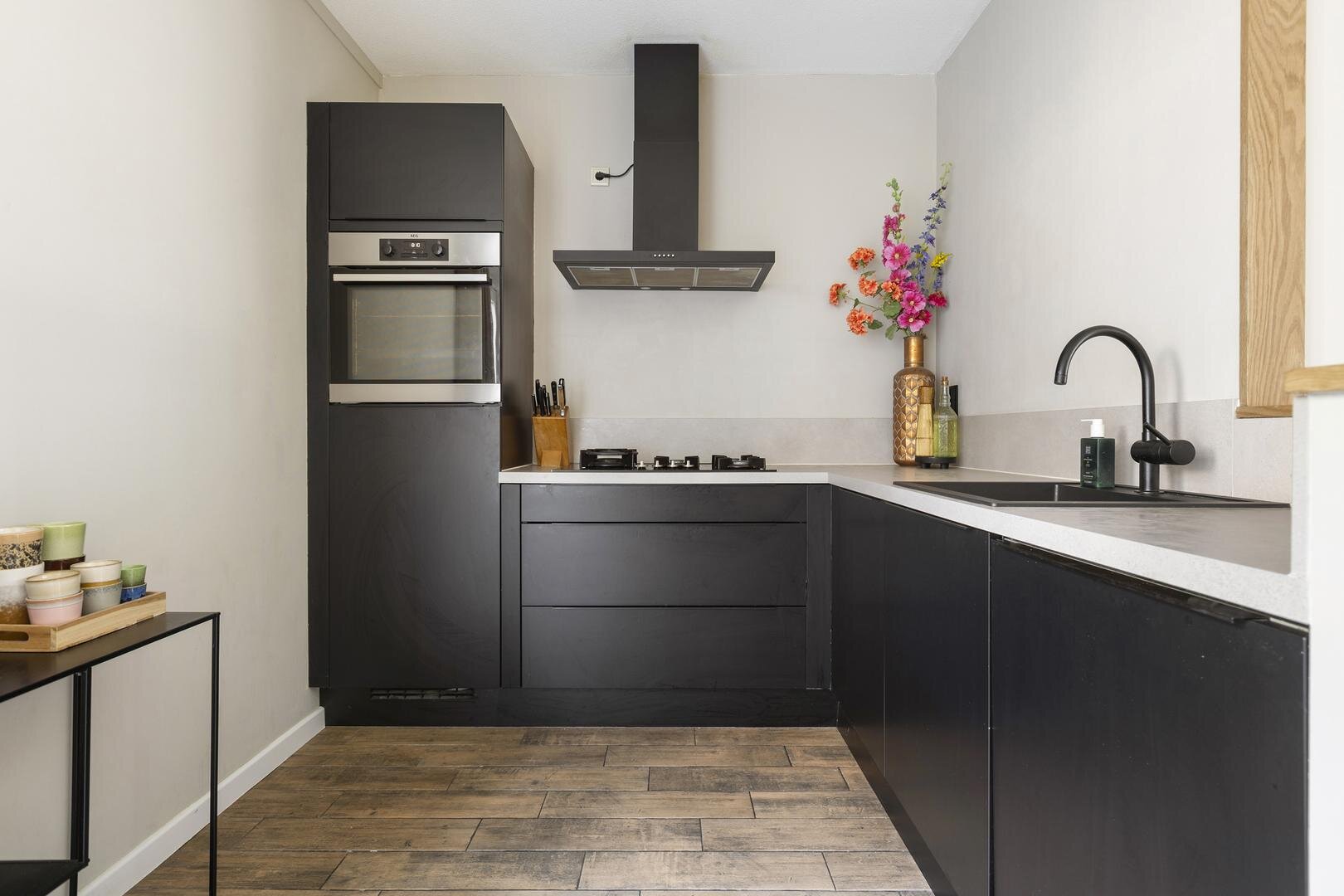 Begane grond: entree/hal, toiletruimte, woonkamer van ca. 32 m² met vaste kast met cv-opstelling en deur naar de achtertuin. De open keuken (ca. 6 m²) is voorzien van een moderne keukenopstelling met een 4-pits gaskookplaat, afzuigkap, oven, koelkast en vaatwasser.
