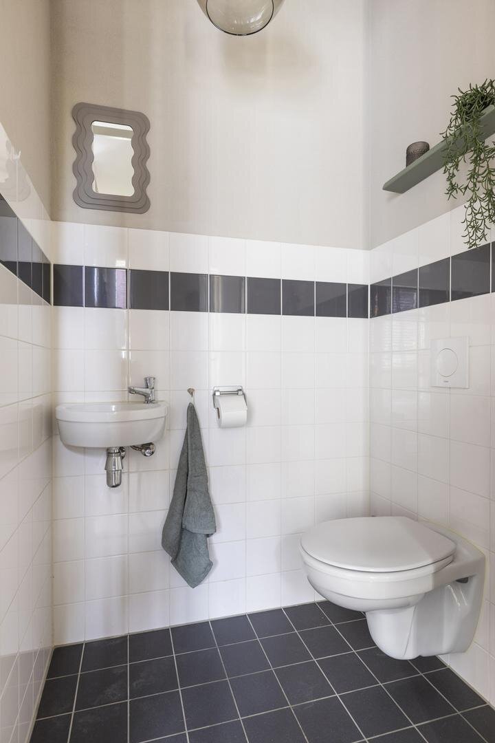 Eerste verdieping: overloop, kast met wasmachineaansluiting, drie slaapkamers van ca. 15, 8 en 8 m² en een badkamer van ca. 6 m² met douche, wastafel en toilet.