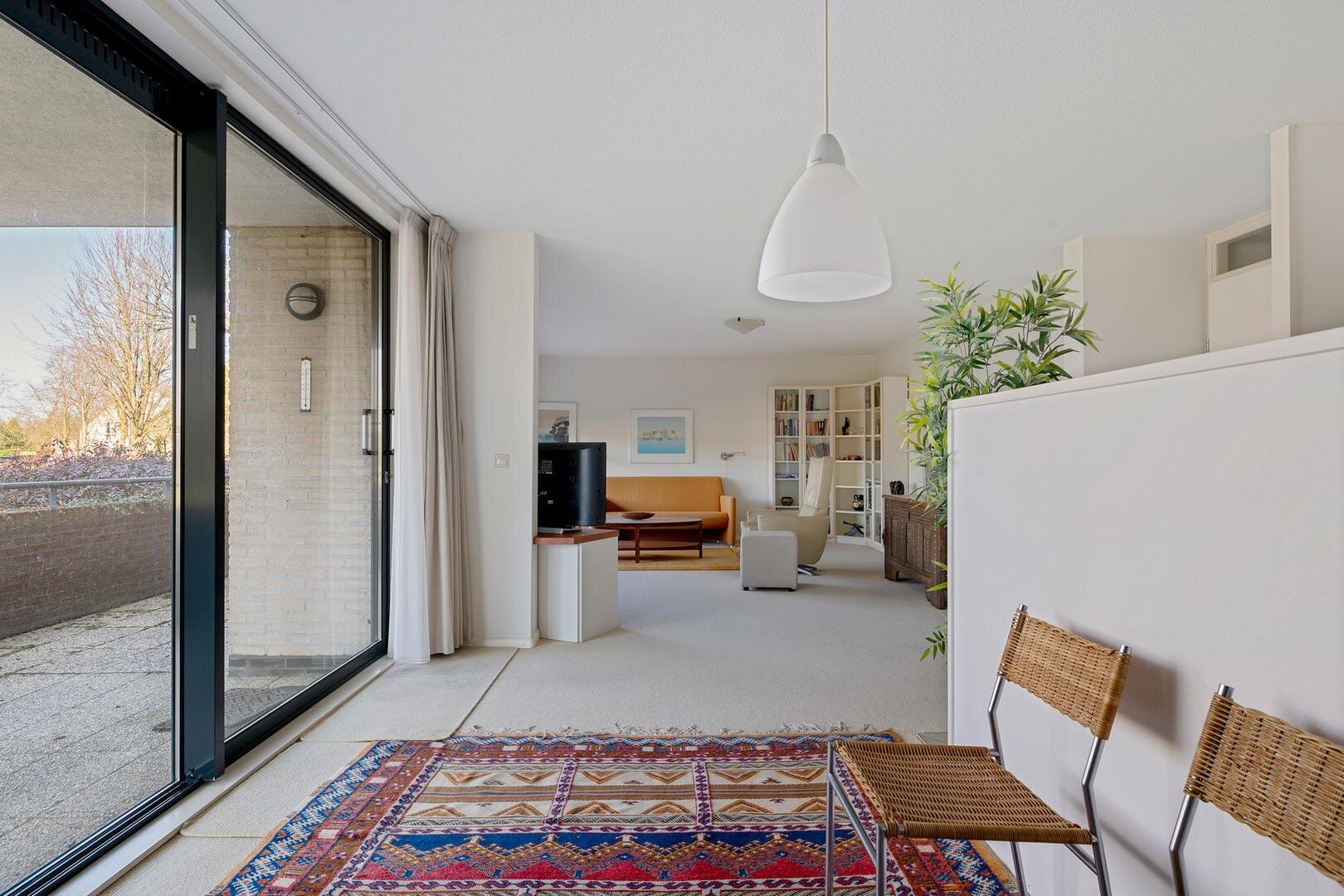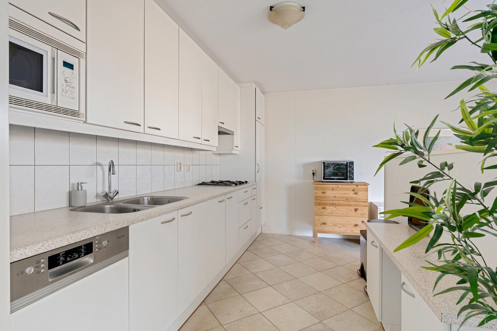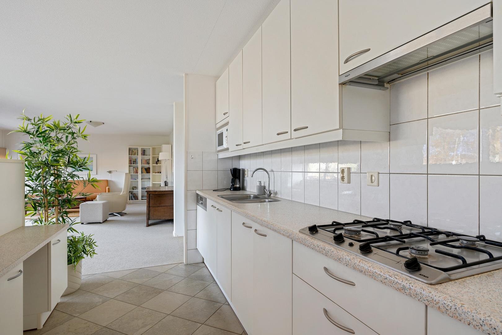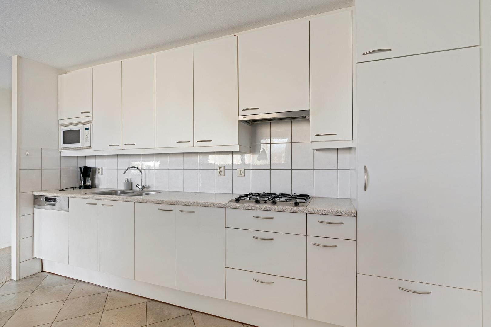 De royale woonkamer vormt het centrale leefgedeelte van het appartement en biedt volop ruimte voor een comfortabele zithoek. Dankzij de grote raampartijen valt er prettig daglicht naar binnen en ontstaat er een aangename leefruimte. Vanuit de woonkamer is tevens het riant terras bereikbaar, waar je heerlijk buiten kunt zitten. Aansluitend bevindt zich de eetkamer, die een prettige verbinding vormt tussen de woonkamer en de keuken en voldoende ruimte biedt voor een ruime eettafel. De keuken is eenvoudig uitgevoerd en voorzien van een koelkast, een 4-pits gasstel en een vaatwasser.