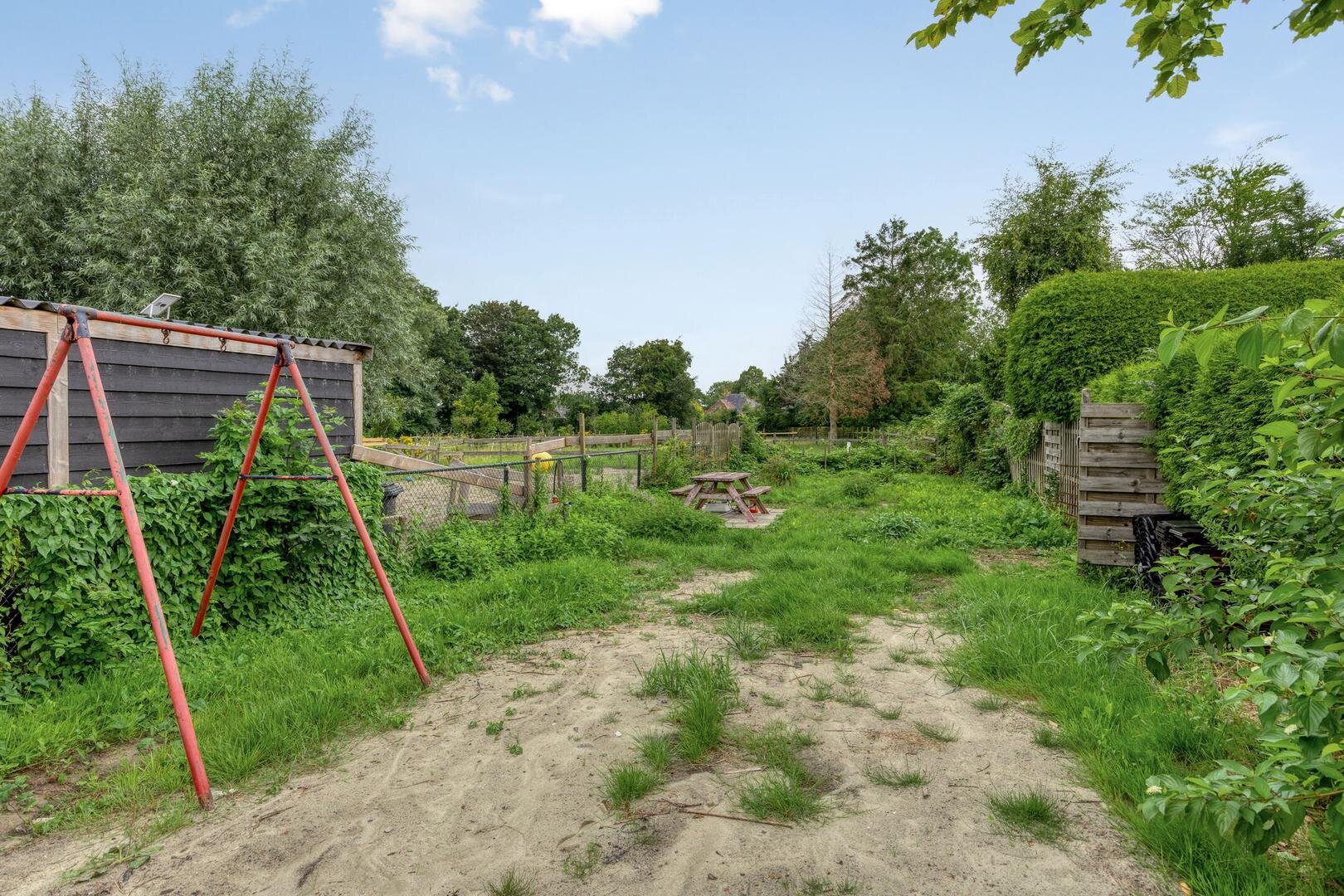 De diepe achtertuin — in totaal circa 50 meter — ligt op het noorden en biedt volop mogelijkheden voor een eigen invulling. Of je nu droomt van een veranda, siertuin, vijver, terras of veel groen: de ruimte is er. Een bestaande berkenboom fungeert direct als natuurlijke parasol. Parkeren kan op eigen terrein, achterin grenst het perceel aan een groene strook met bomen en weilanden en heb je vrij uitzicht op de molen van Loppersum. Een unieke, rustgevende plek om te ontspannen of te spelen.
