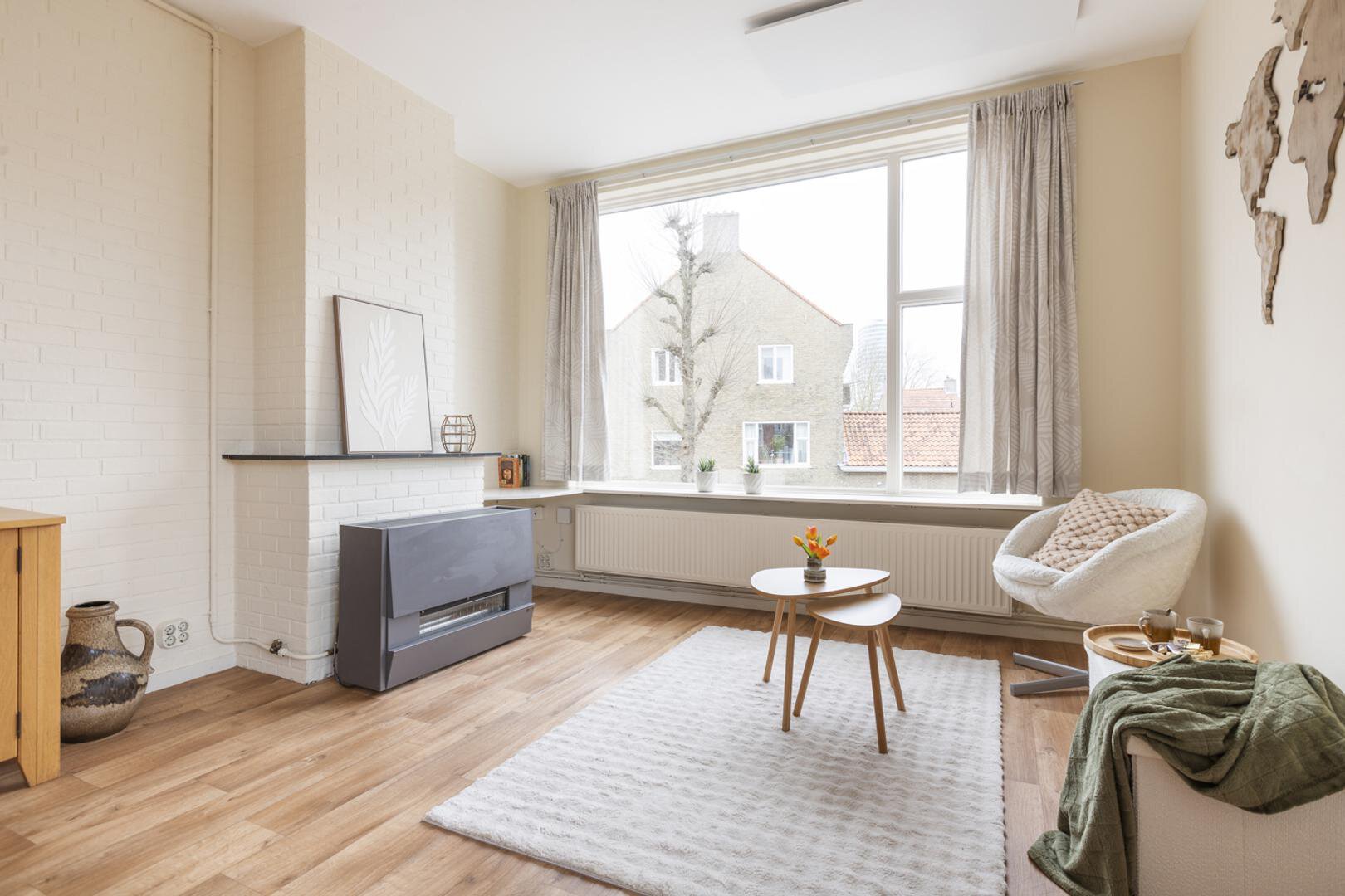 Eerste verdieping: entree appartement, hal met vaste kast, toiletruimte, lichte woonkamer van ca. 18 m² met mooie raampartijen en een schouw. De gesloten keuken heeft een nette keukenopstelling met 4-pits gaskookplaat, wasmachineaansluiting en elektrische boiler. Vanuit hier bereik je het balkon, waar je nog lekker in de avondzon kunt zitten. Het appartement heeft twee slaapkamers van ca. 12 en 9 m² en een nette badkamer met douche en wastafel.