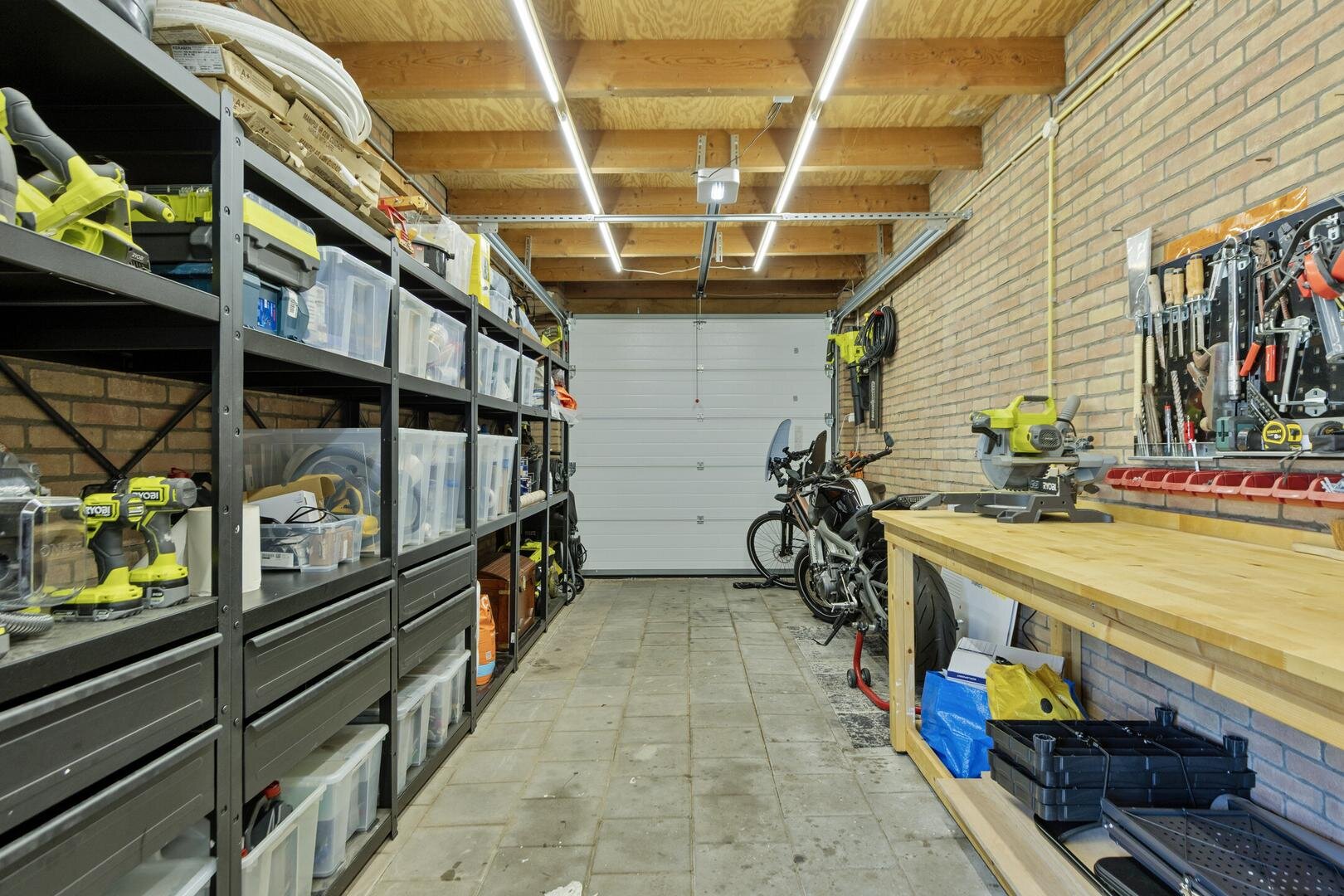 Aangebouwde garage van circa 29 m² en een berging. De oprit biedt ruimte voor meerdere auto’s op eigen terrein.