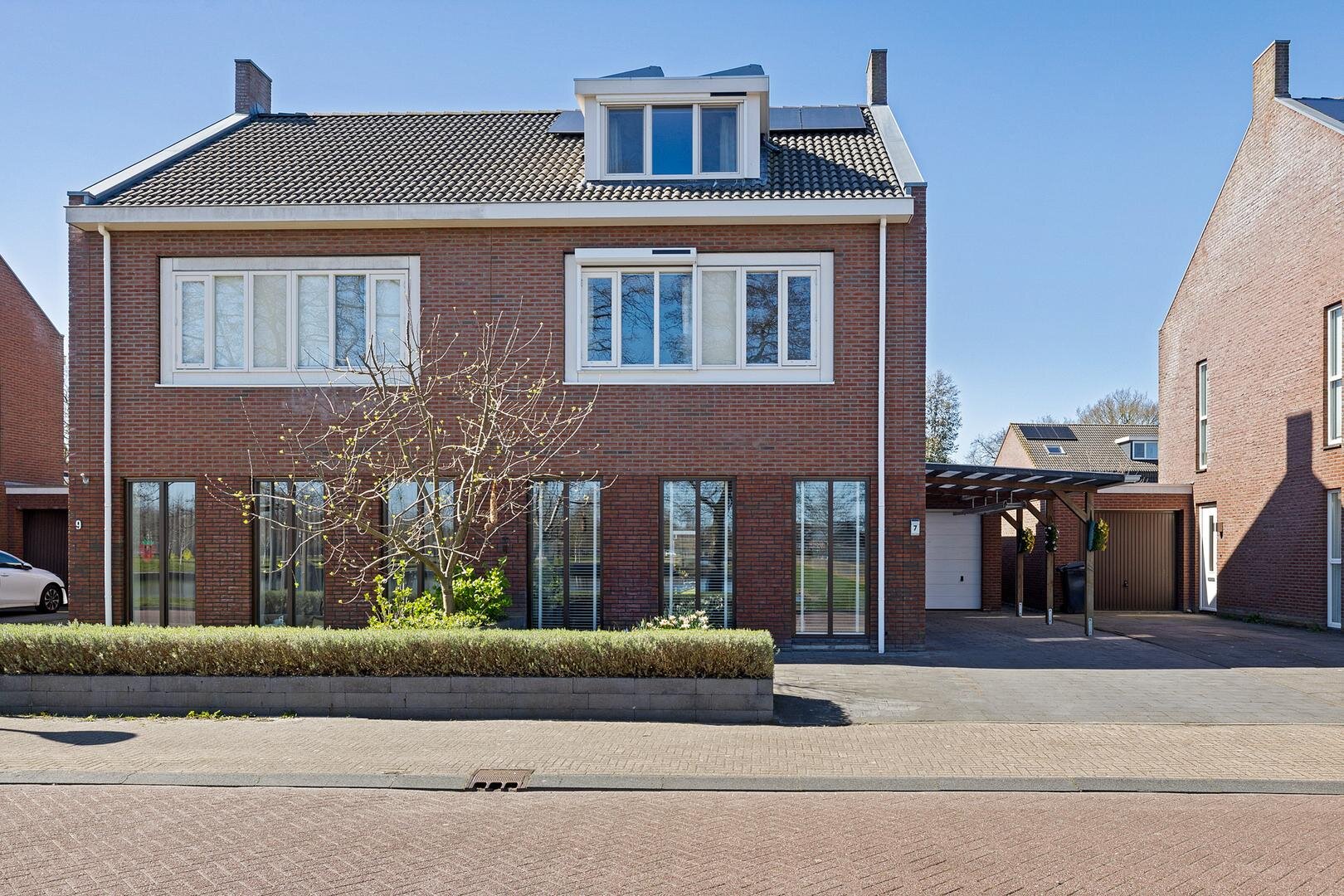 Aan de voorzijde beschik je over parkeergelegenheid op eigen terrein, met een carport en toegang tot de garage.
