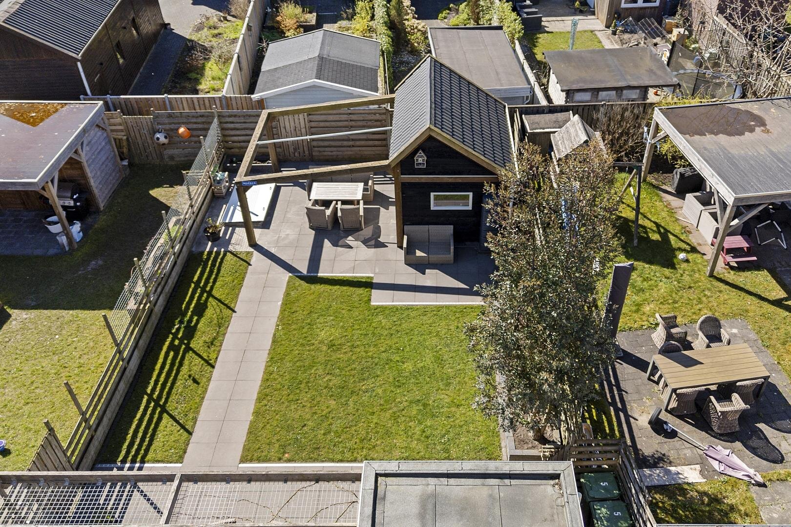 De achtertuin is een van de sterke punten van deze woning: verrassend diep, verzorgd aangelegd en gelegen op het westen, waardoor je hier volop geniet van de middag- en avondzon. In de tuin staat een vrijstaand, geïsoleerd tuinhuis met elektra en wateraansluiting — ideaal als hobbyruimte of werkplek.