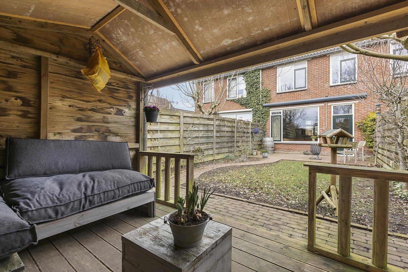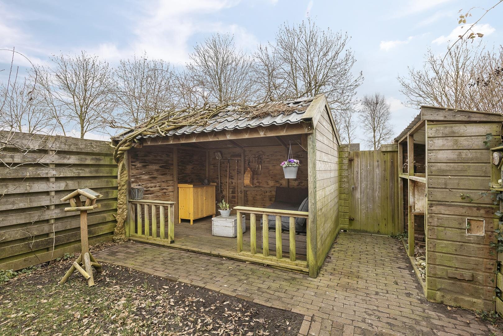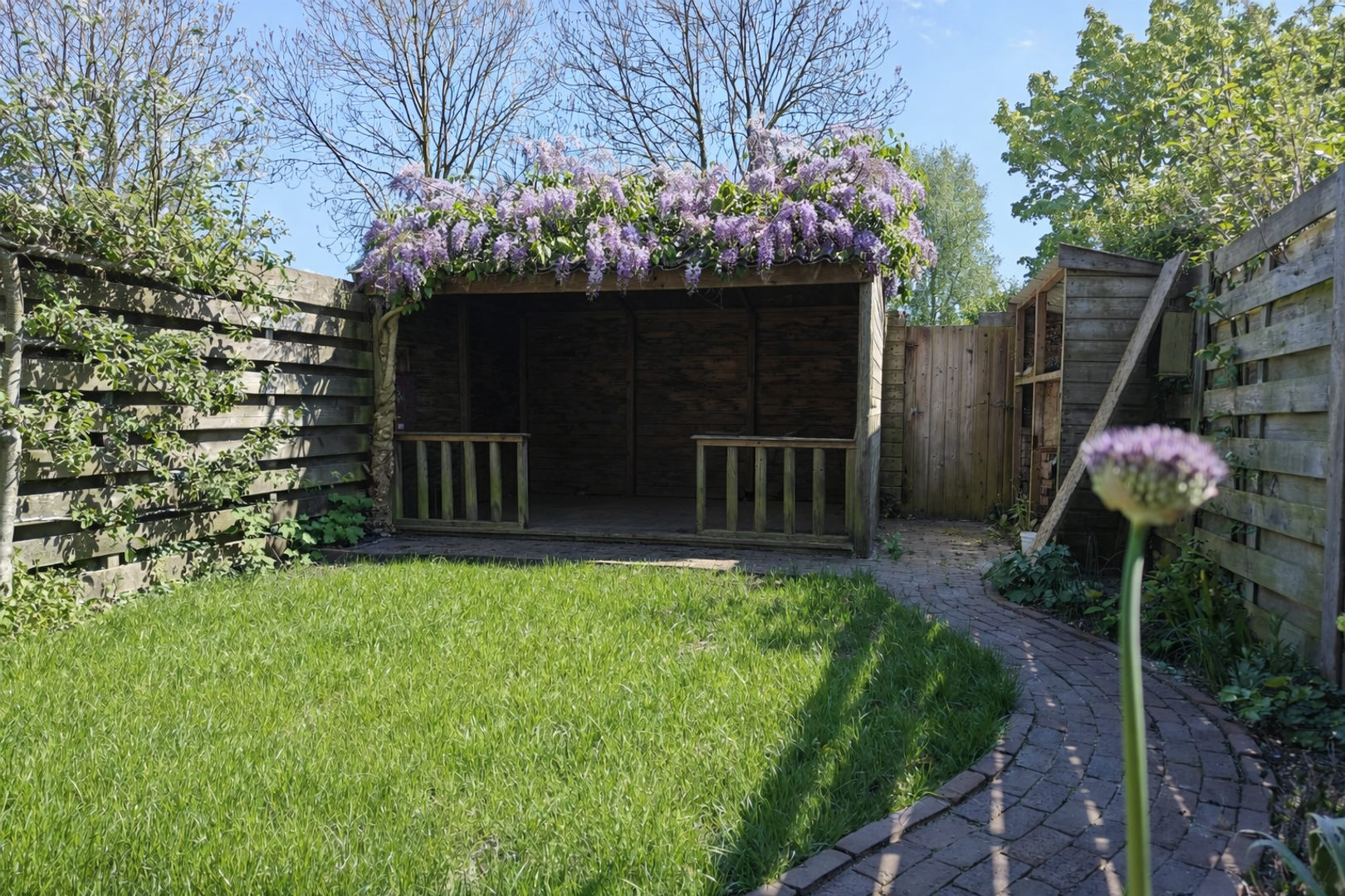 De nette achtertuin heeft een goede combinatie tussen groen en terras. De ligging is op het zuiden en dankzij de vrije ligging heb je hier veel privacy. Hier kun je optimaal genieten van het buitenleven, met de mogelijkheid om veel uren van de dag in de zon te zitten. Achterin de tuin staat een vrijstaande houten overkapping. Hierdoor heb je de mogelijkheid om in de schaduw te zitten. De voortuin is voorzien van een ruime oprit met carport en plek voor drie auto's.
