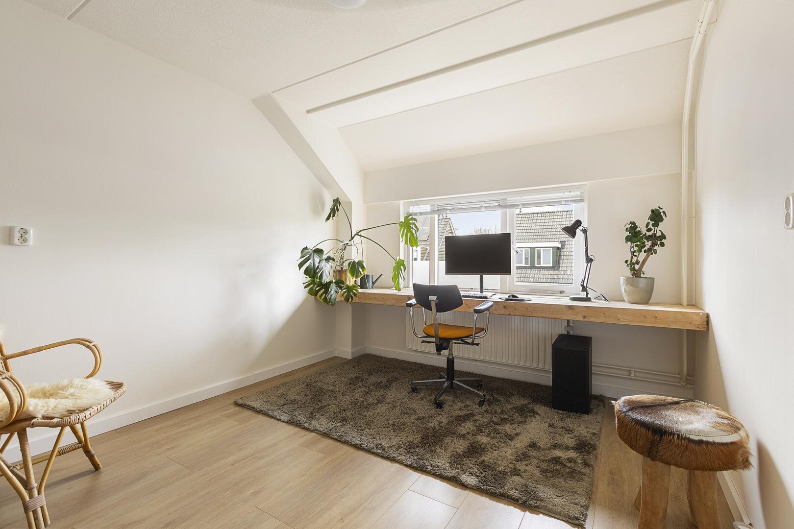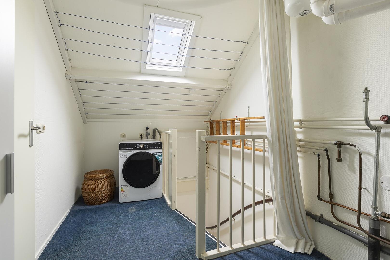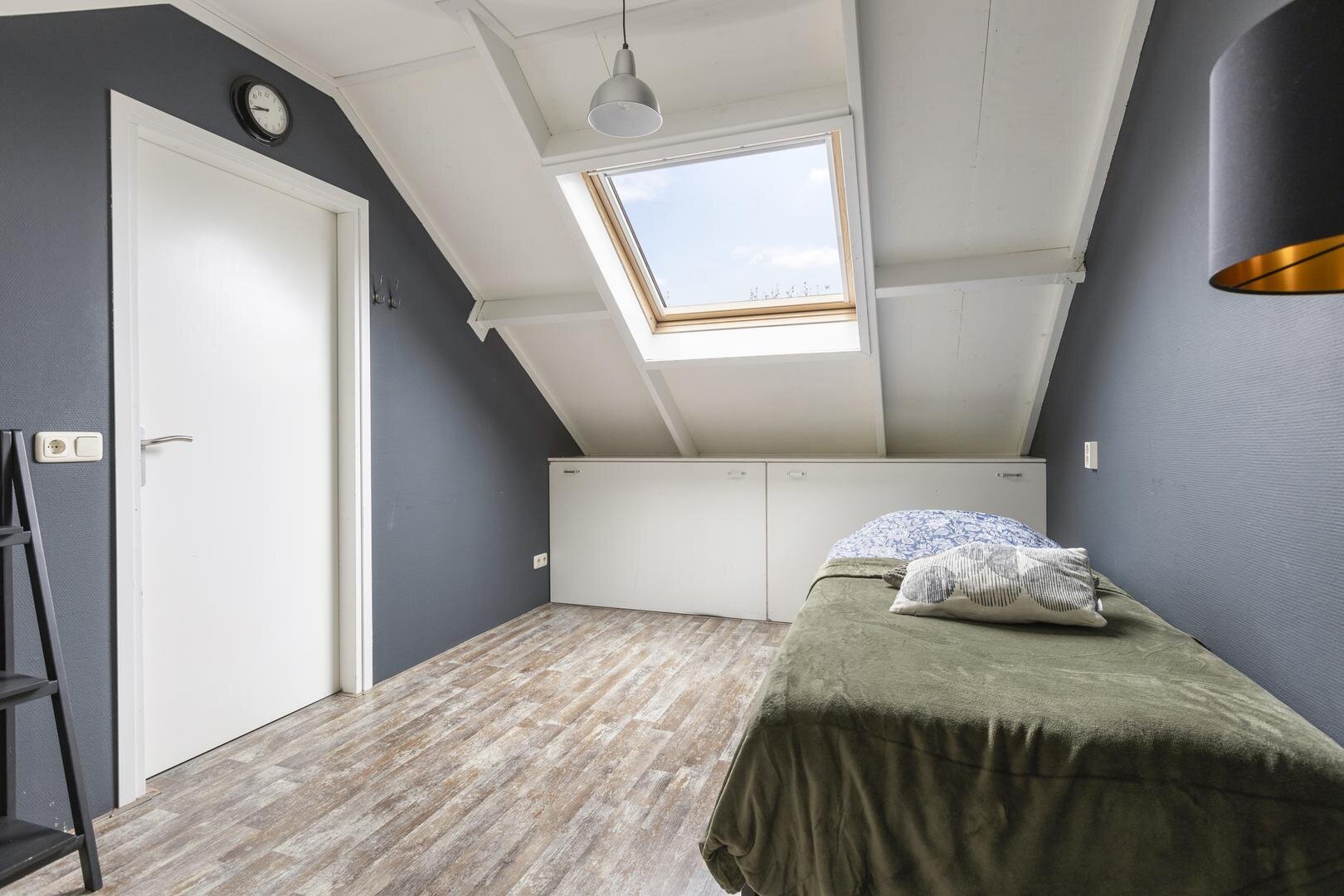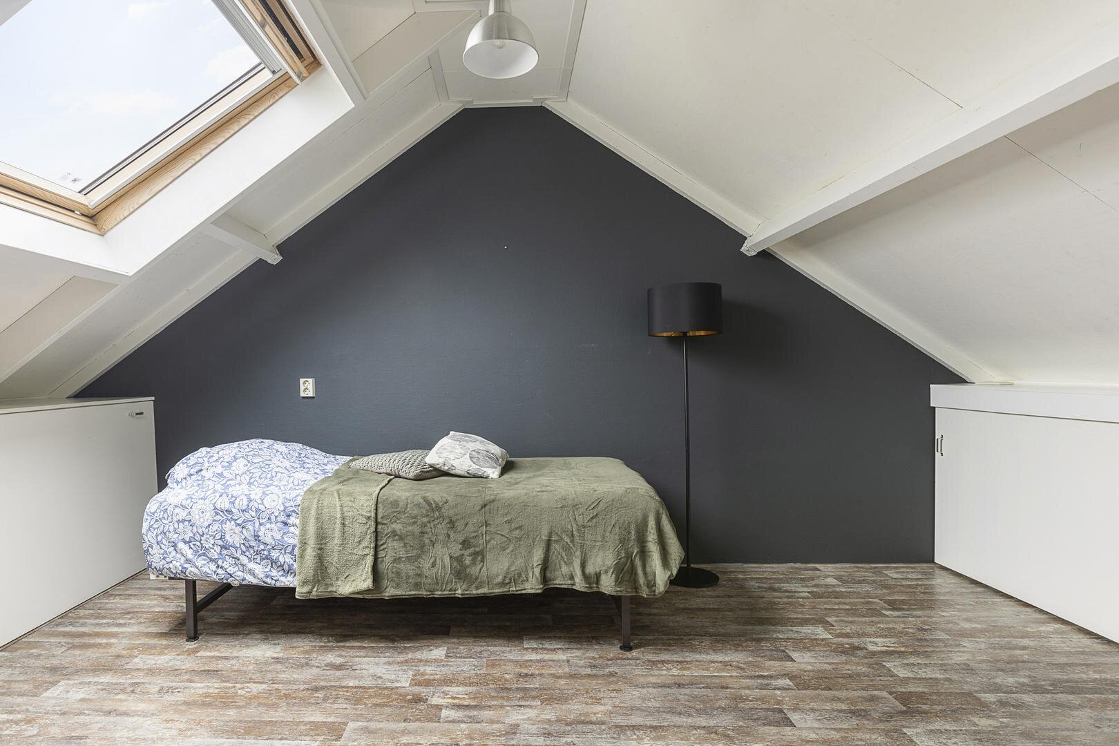 Tweede verdieping: overloop met cv-opstelling, slaapkamer van ca. 11 m². Op deze verdieping is veel bergruimte aanwezig achter de knieschotten.