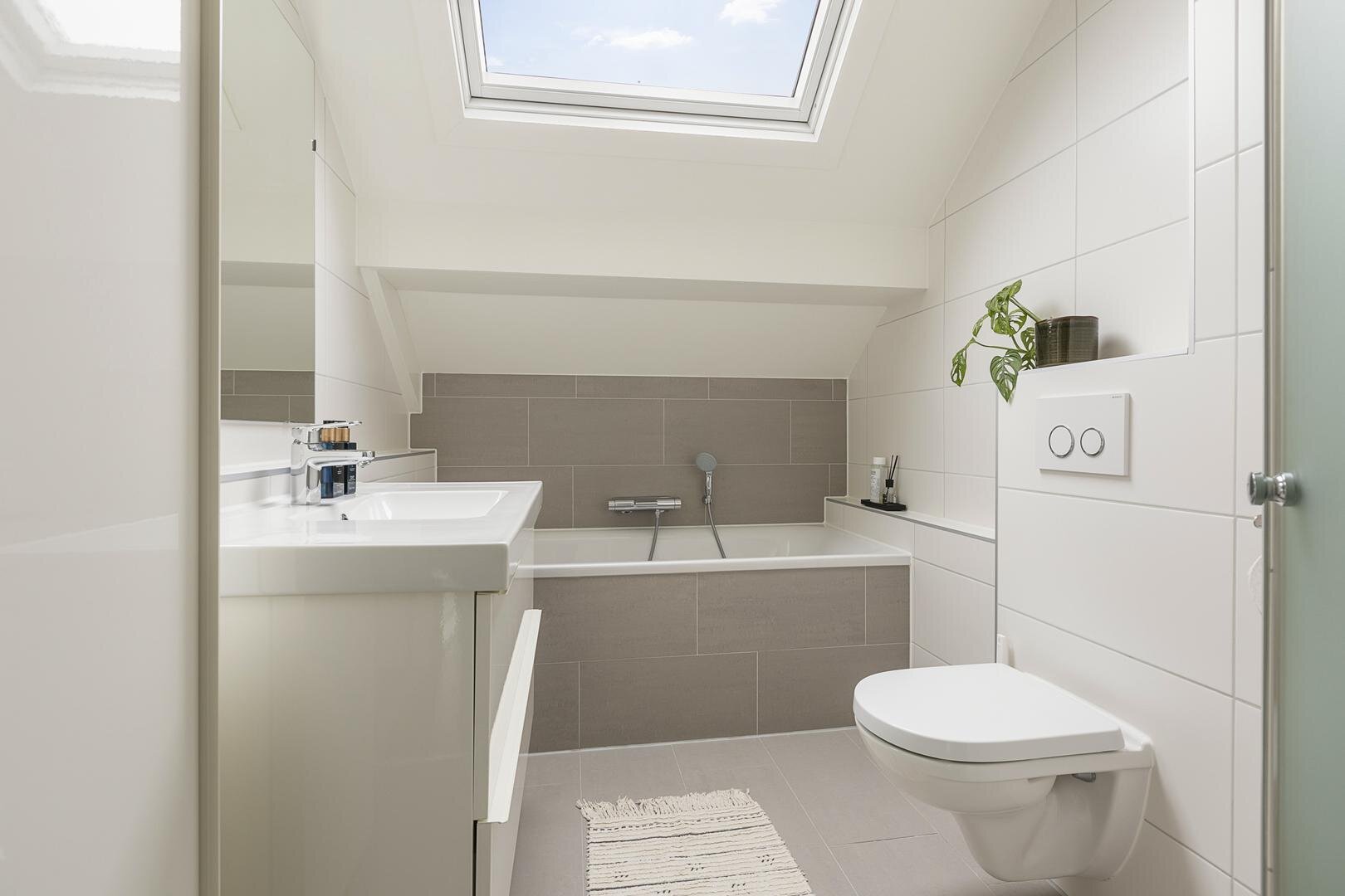 Eerste verdieping: overloop, drie slaapkamers van ca. 14, 11 en 7 m², moderne badkamer van ca. 7 m² met ligbad, inloopdouche, wastafelmeubel en tweede toilet. Dankzij een dakraam heeft de badkamer een mooie lichtinval.