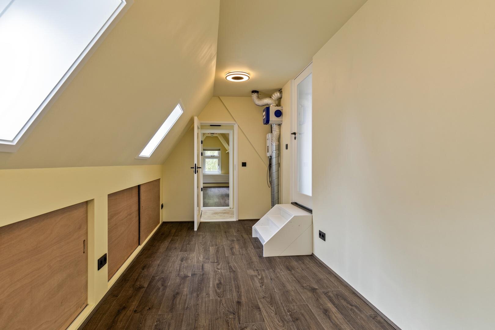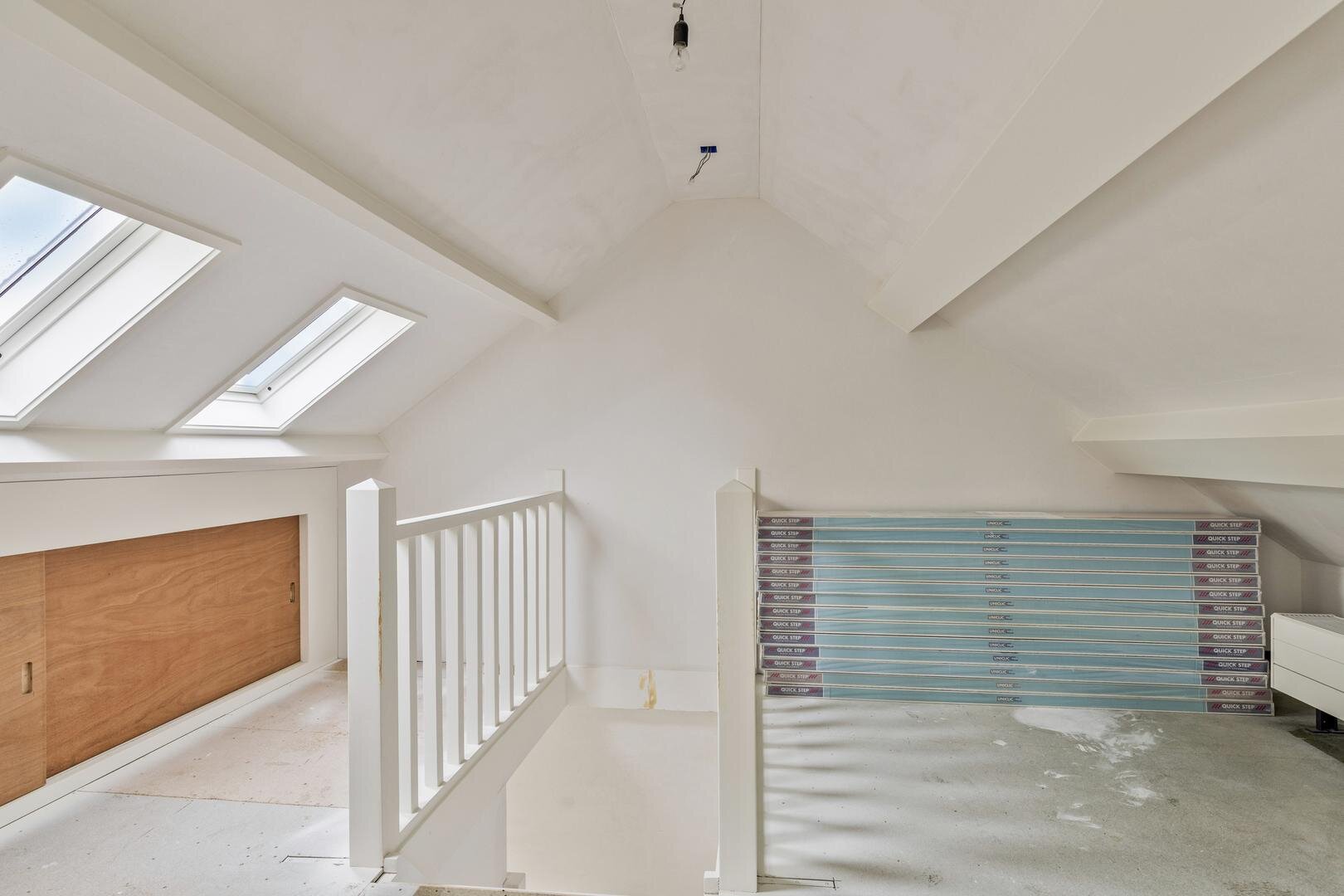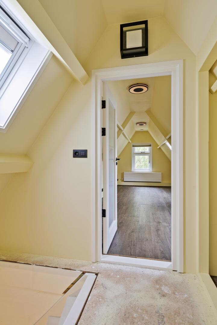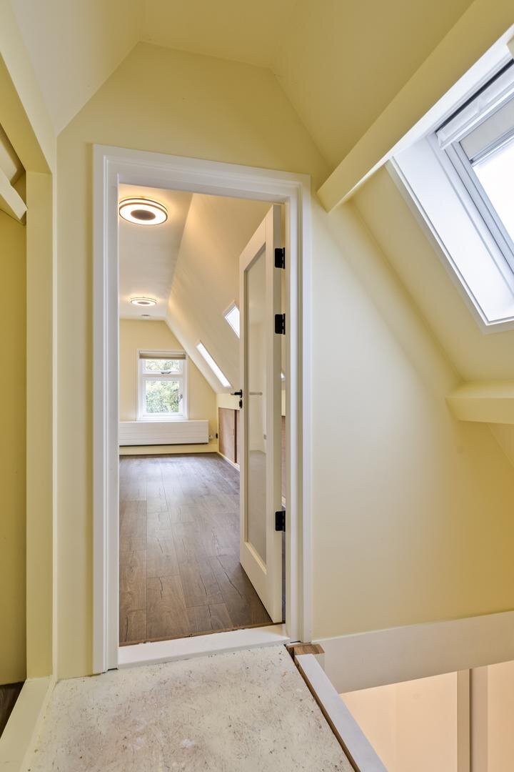 Tweede verdieping: via een vaste trap bereik je een verrassend ruime verdieping met een dakkapel over de volledige breedte. Dit zorgt voor veel daglicht op de overloop en een lichte slaapkamer van ca. 14 m².