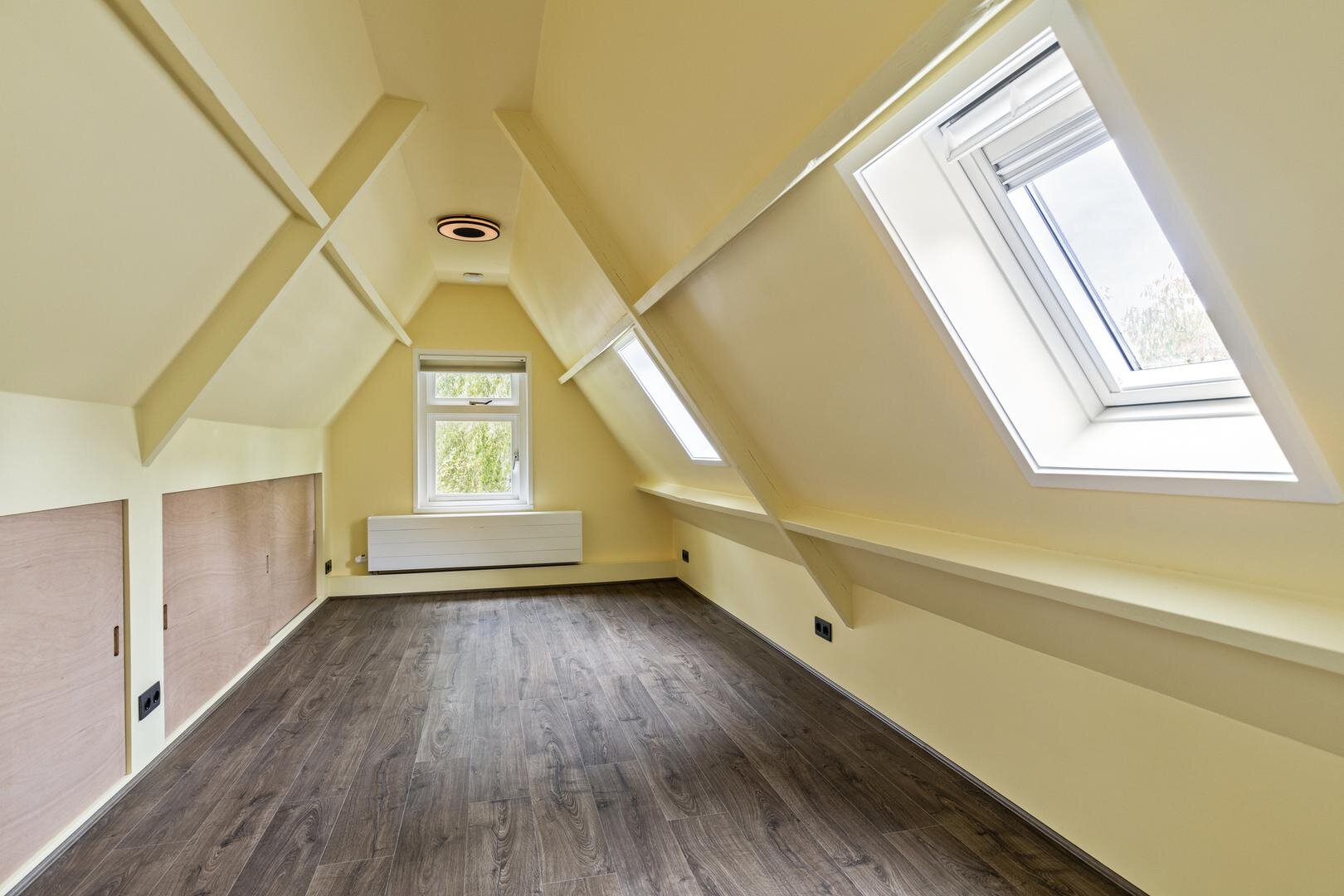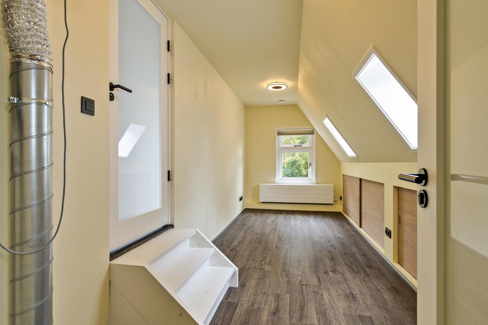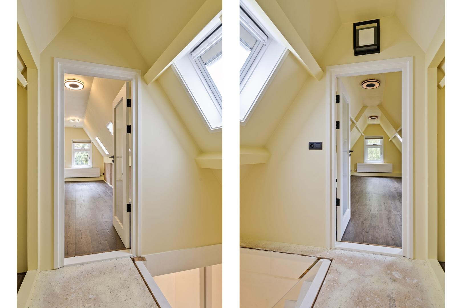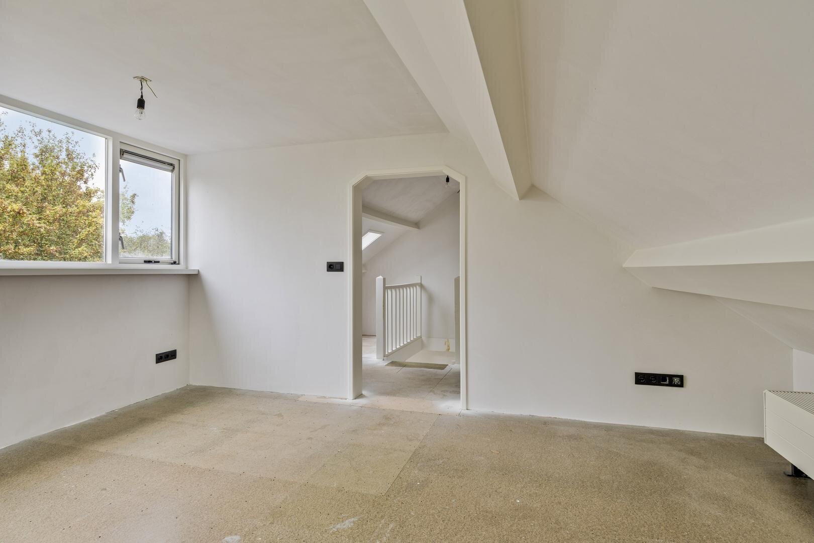 Tweede verdieping: via een vaste trap bereik je een verrassend ruime verdieping met een dakkapel over de volledige breedte. Dit zorgt voor veel daglicht op de overloop en een lichte slaapkamer van ca. 14 m².