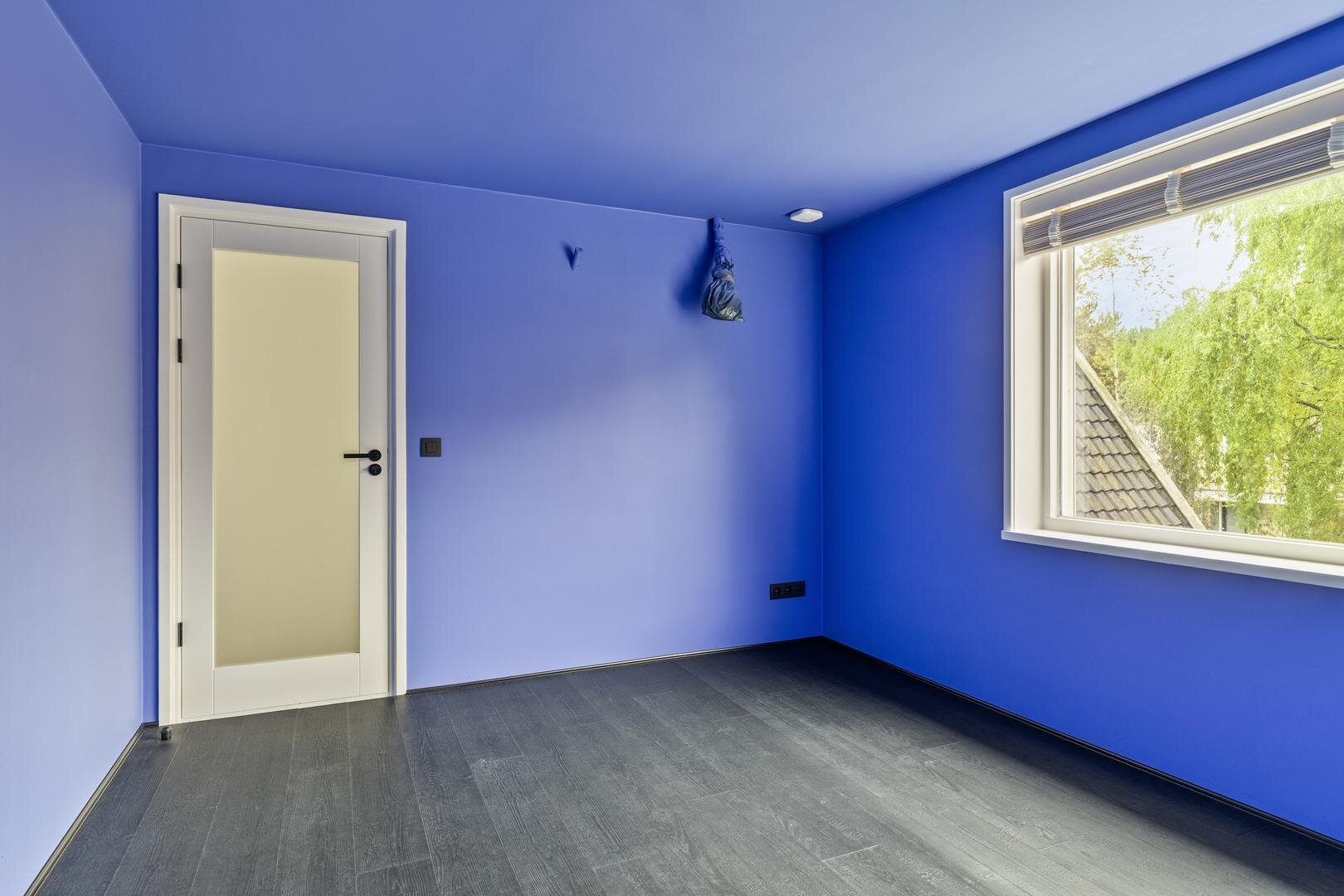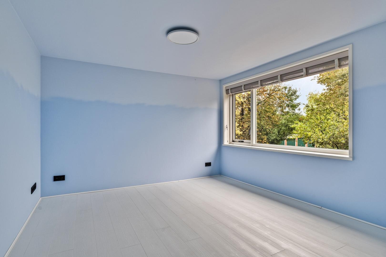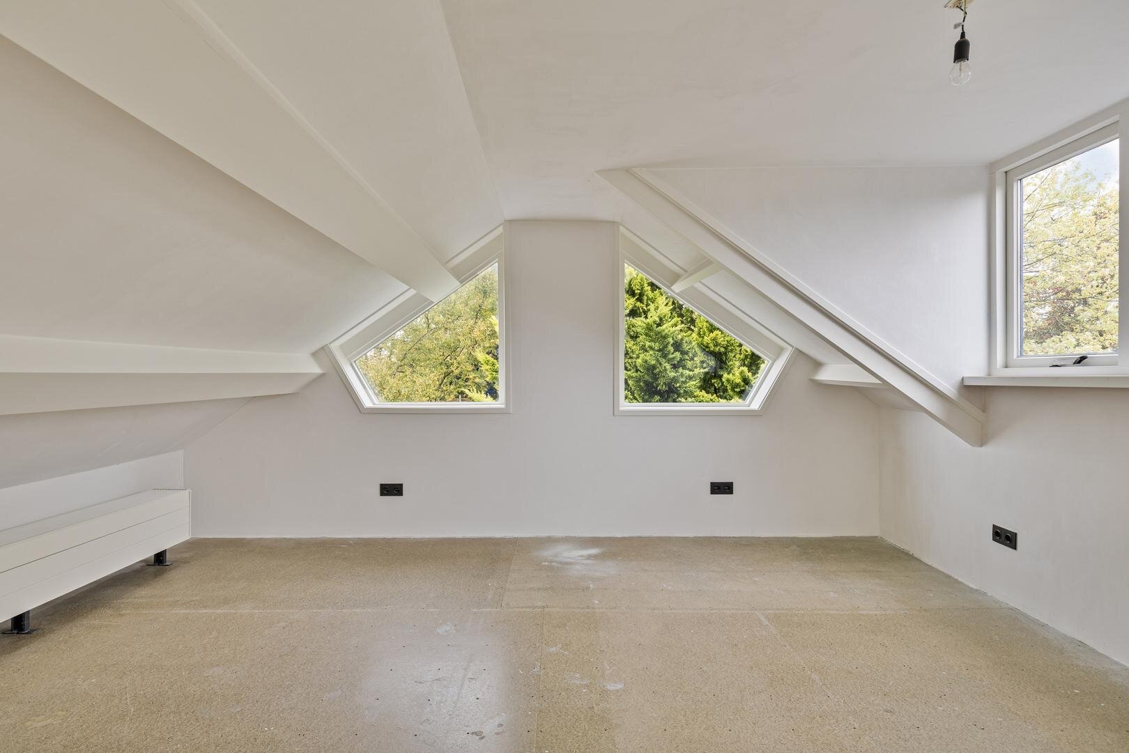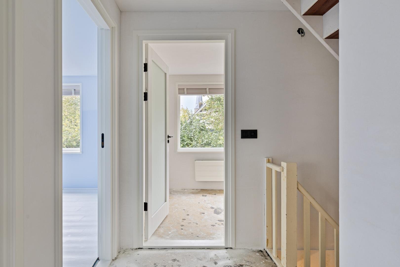 Tweede verdieping: via een vaste trap bereik je een verrassend ruime verdieping met een dakkapel over de volledige breedte. Dit zorgt voor veel daglicht op de overloop en een lichte slaapkamer van ca. 14 m².