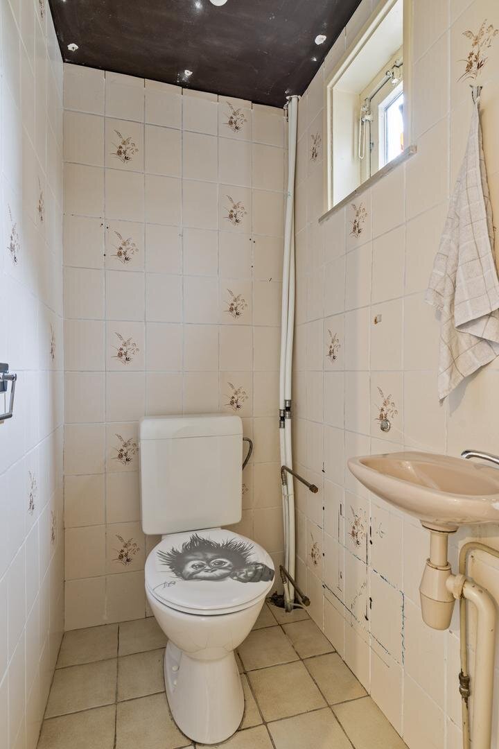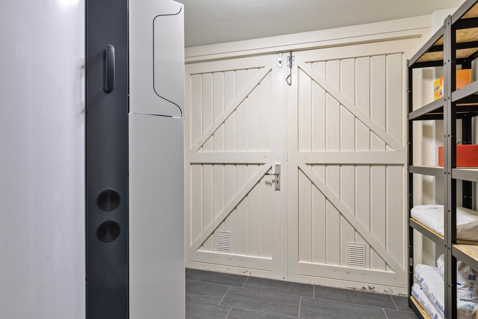 Vanuit de keuken is er toegang tot de achterhal/bijkeuken. Hier bevindt zich enerzijds een berging met cv-opstelling en openslaande deuren naar de oprit, en anderzijds een multifunctionele ruimte met toegang tot de tuin – ideaal als werk-, slaap- of speelkamer.
