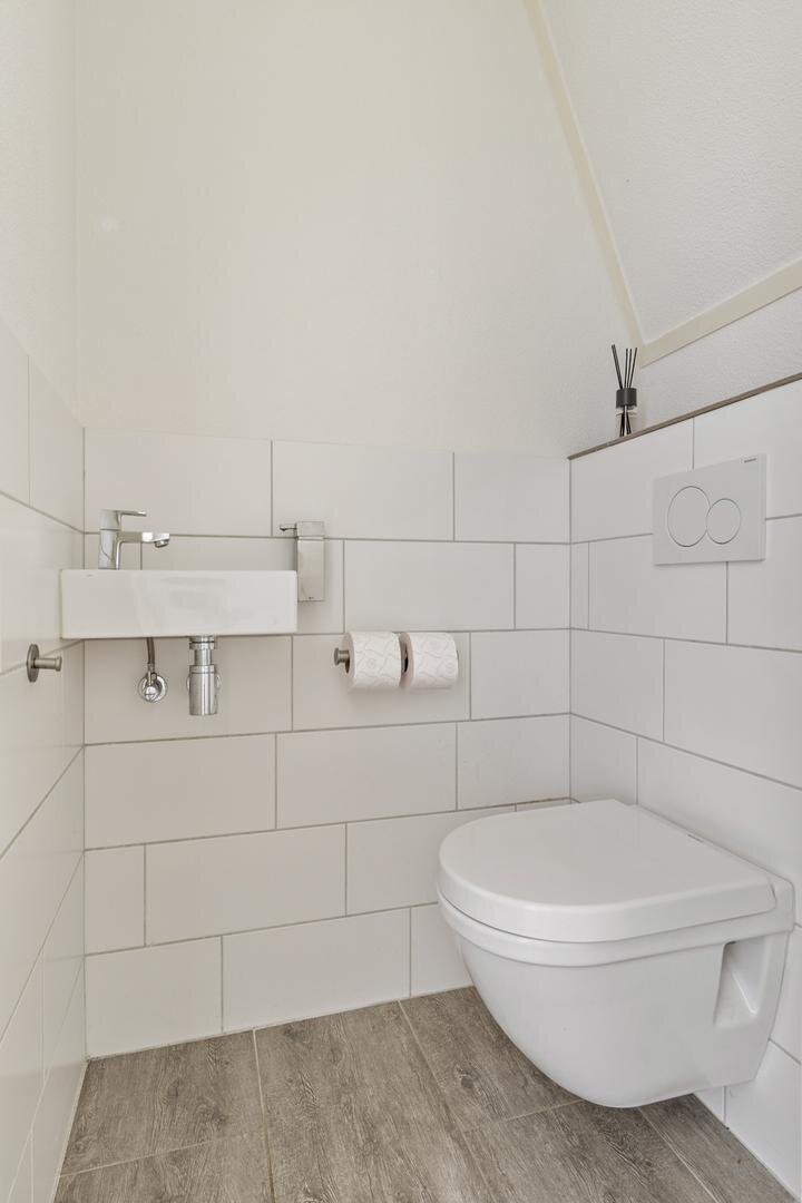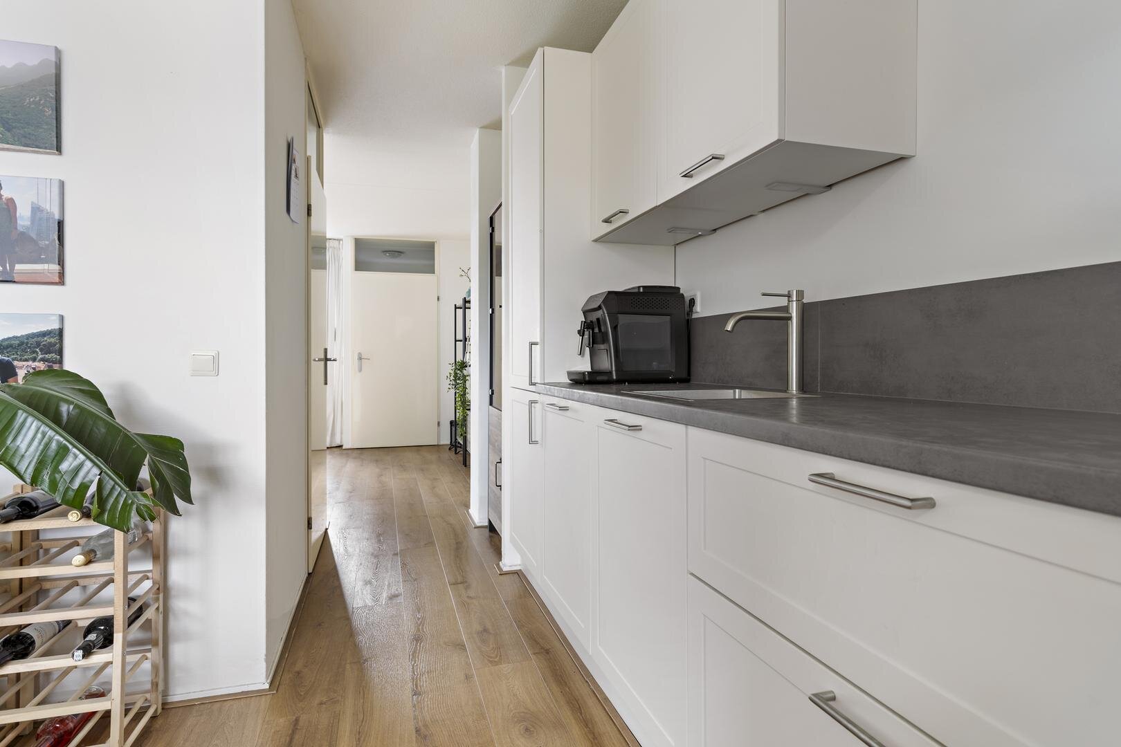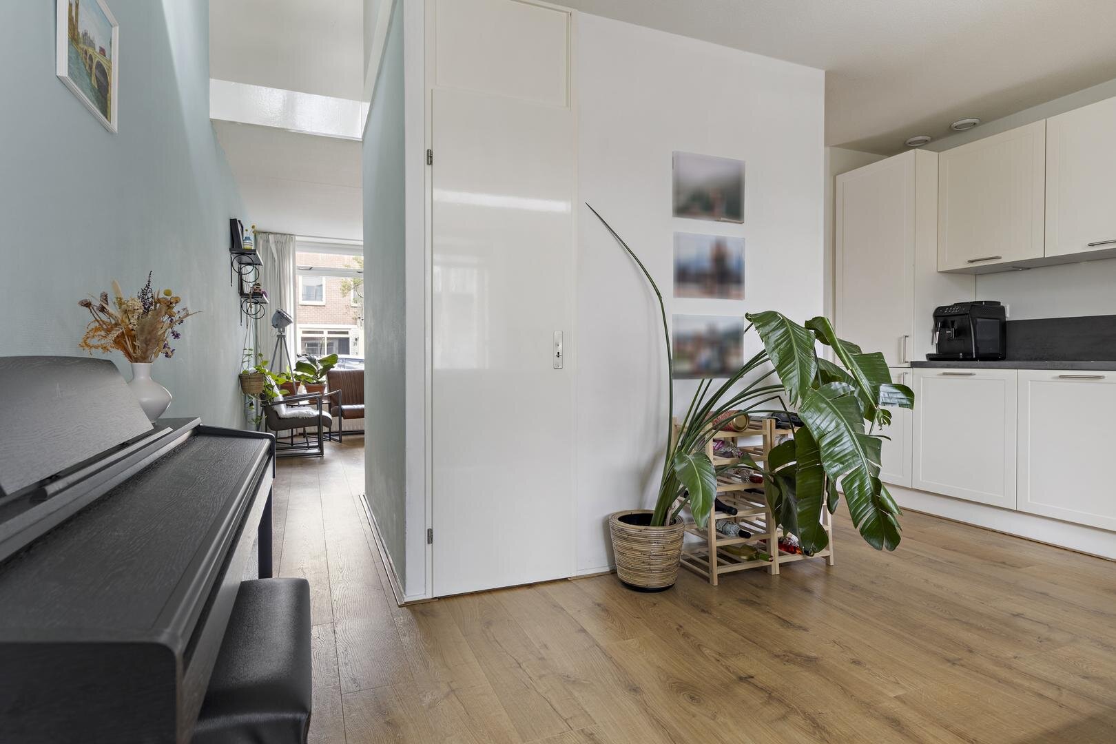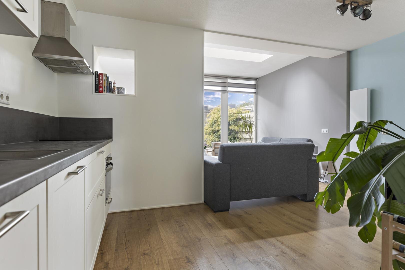 Begane grond: entree/hal, zeer ruime woonkamer van ca. 47 m², verdeeld over de voor- en achterzijde van de woning. Aan de achterzijde heeft de woning een mooie uitbouw met extra licht dankzij de lichtstraat en openslaande deuren naar de achtertuin. De open keuken is in 2022 vernieuwd en beschikt over een moderne keukenopstelling met inductiekookplaat, afzuigkap, combi-oven, koelkast, vriezer en vaatwasser. Een extra hal geeft toegang tot de toiletruimte en trapopgang.