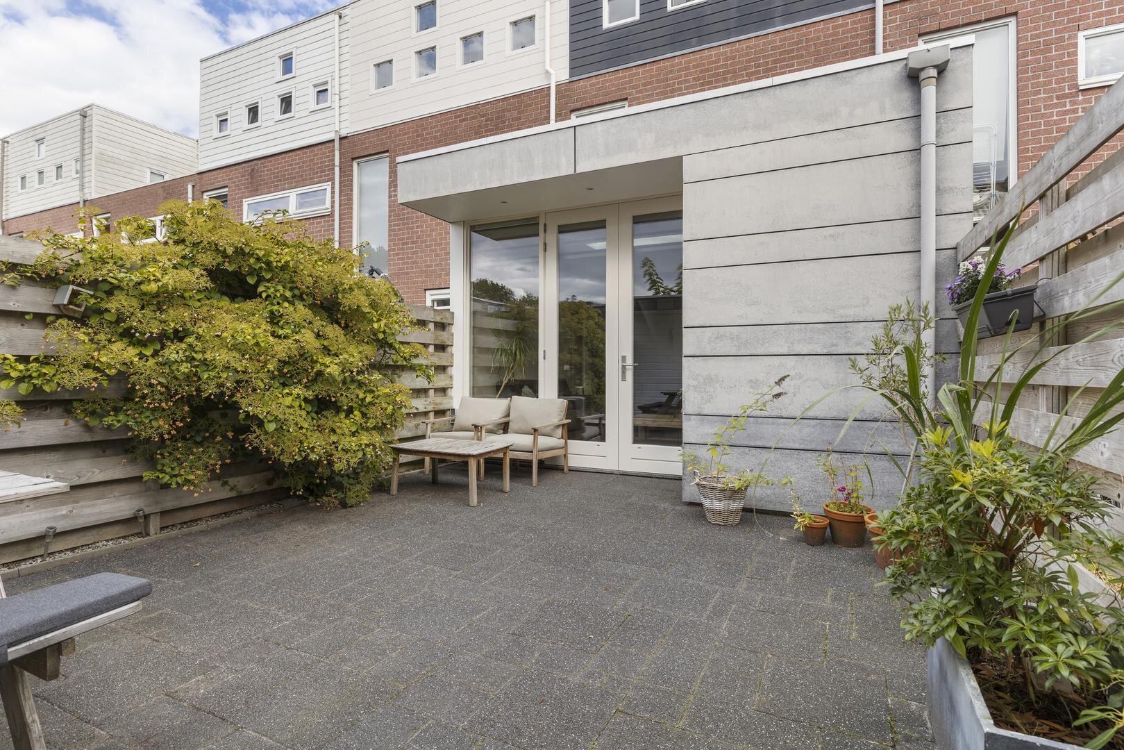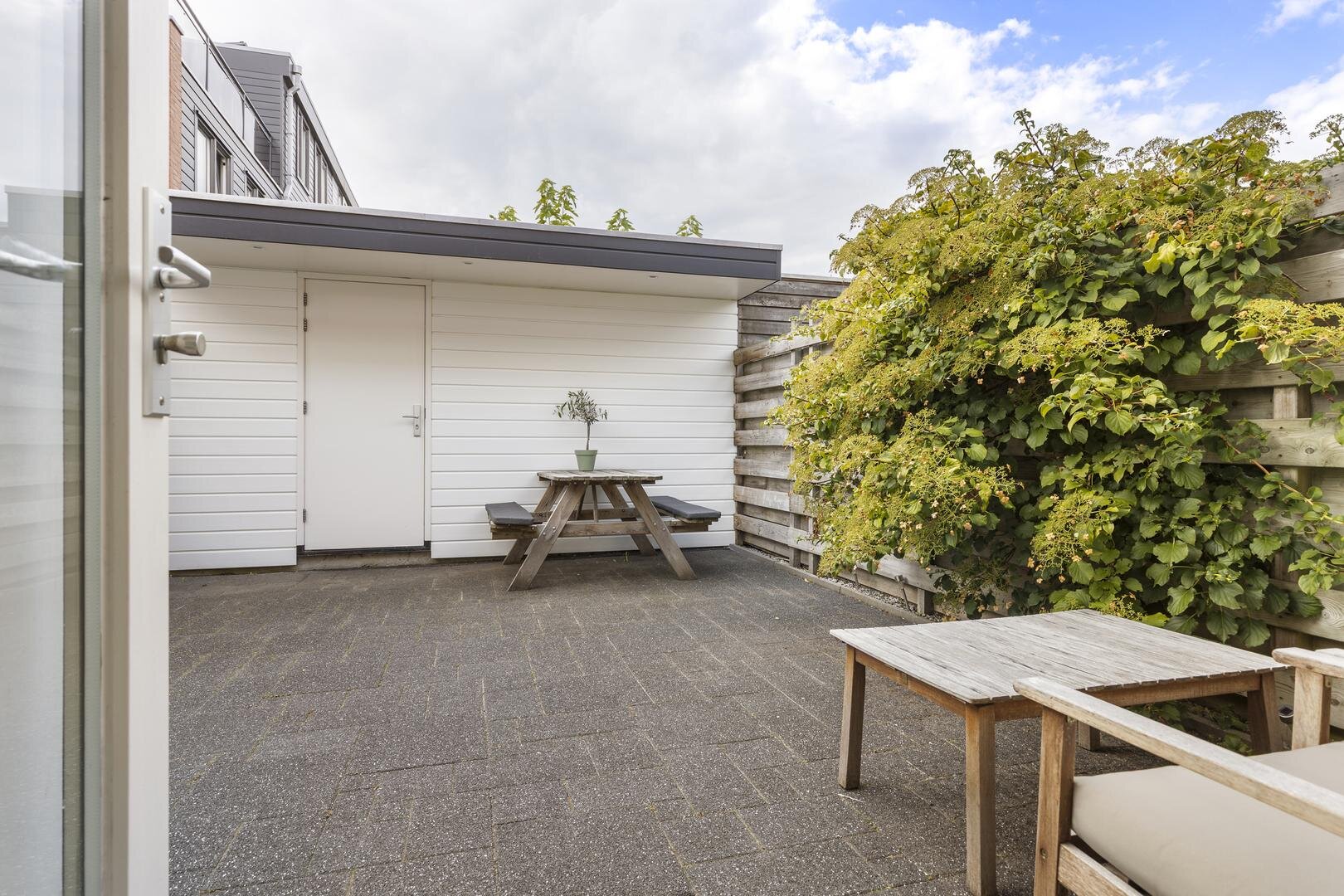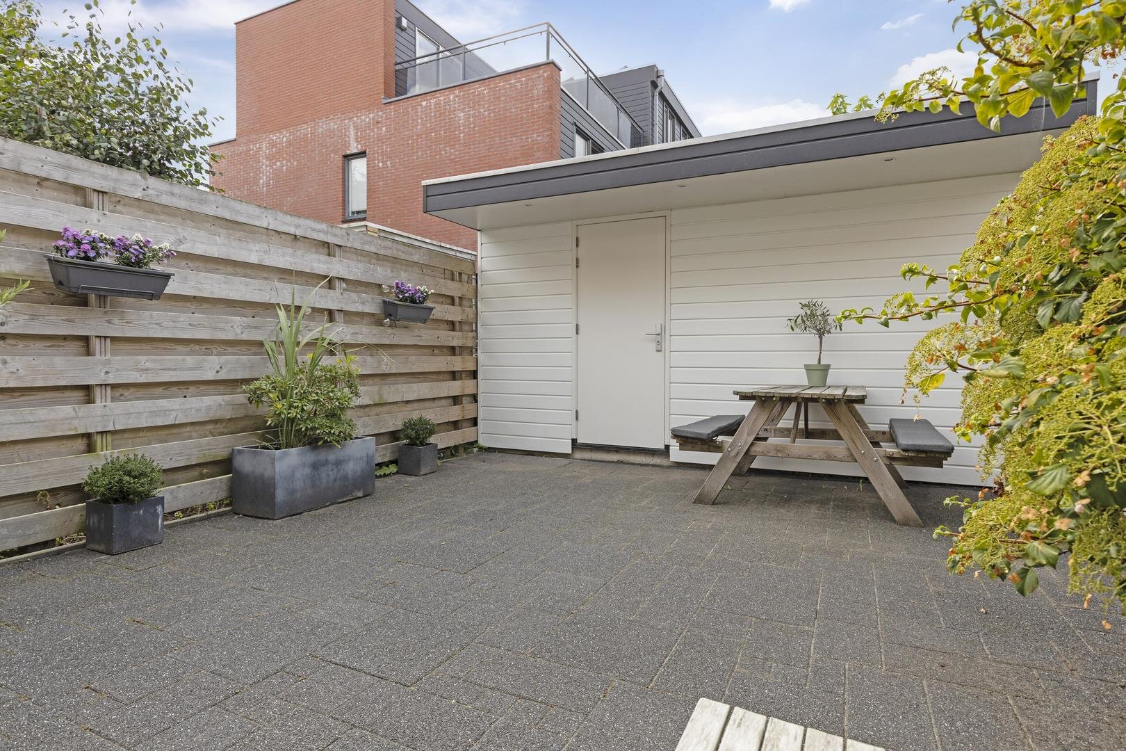 De achtertuin op het westen biedt de mogelijkheid om van de middag- en avondzon te genieten. Het dakterras aan de voorzijde is gelegen op het oosten en dat betekent dat hier de ochtendzon op schijnt. Oftewel: altijd een mogelijkheid om in de zon te zitten! De achtertuin is onderhoudsvrij aangelegd en heeft een ruime berging van ca. 9 m² met toegang tot de brandgang.