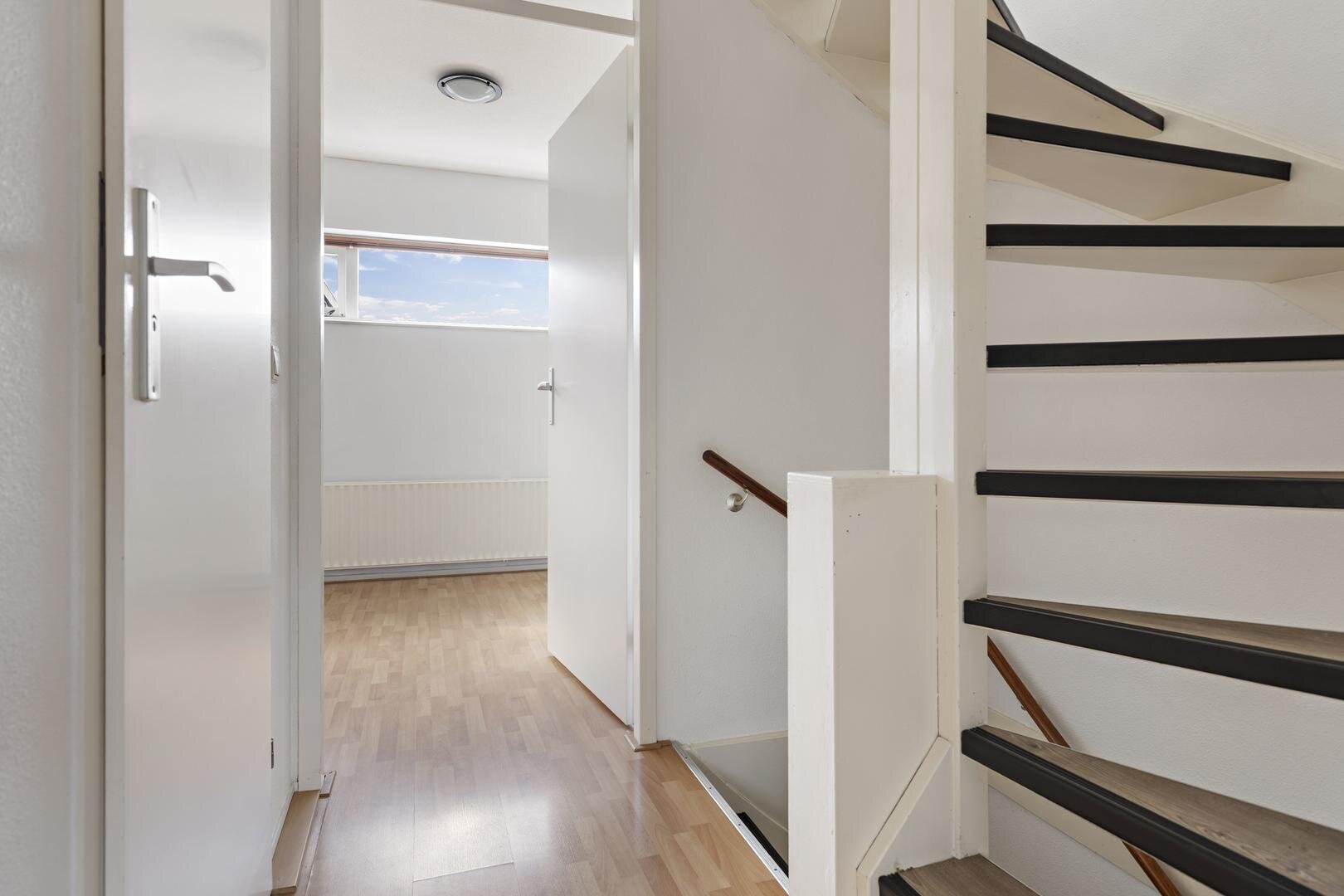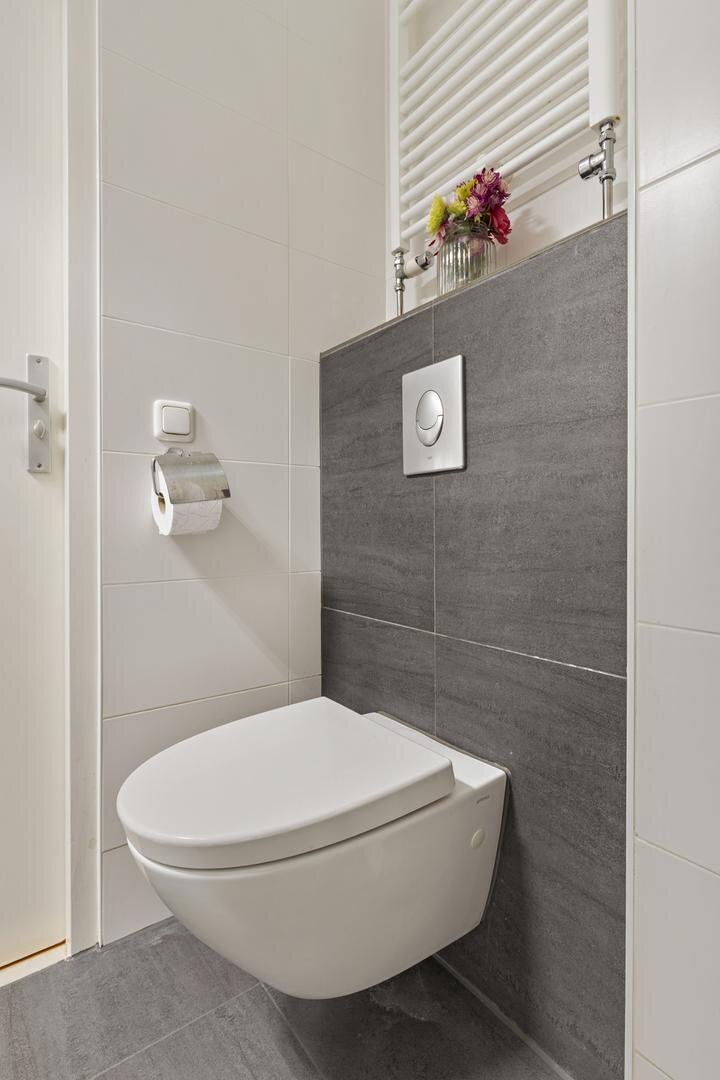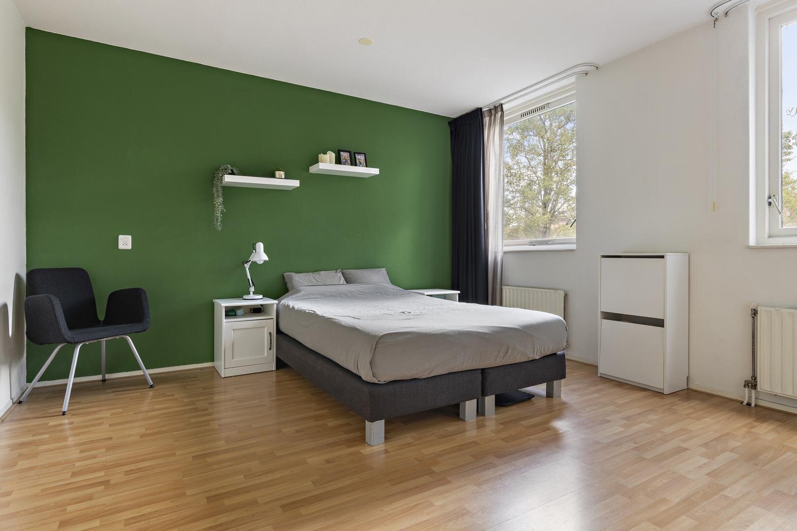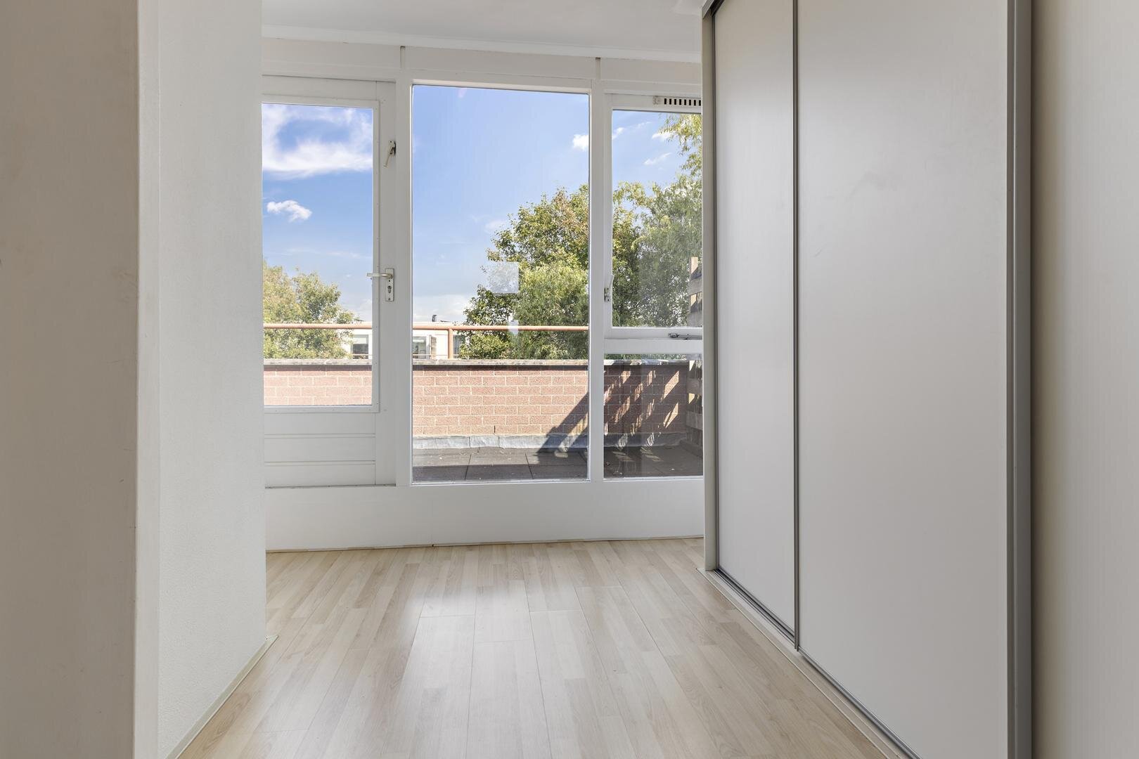 Tweede verdieping: (slaap)kamer van ca. 11 m² met vaste kast voorzien van witgoedaansluiting en cv-opstelling. Vanaf hier bereik je het ruime dakterras op het oosten. De slaapkamer aan de achterzijde is ca. 12 m².