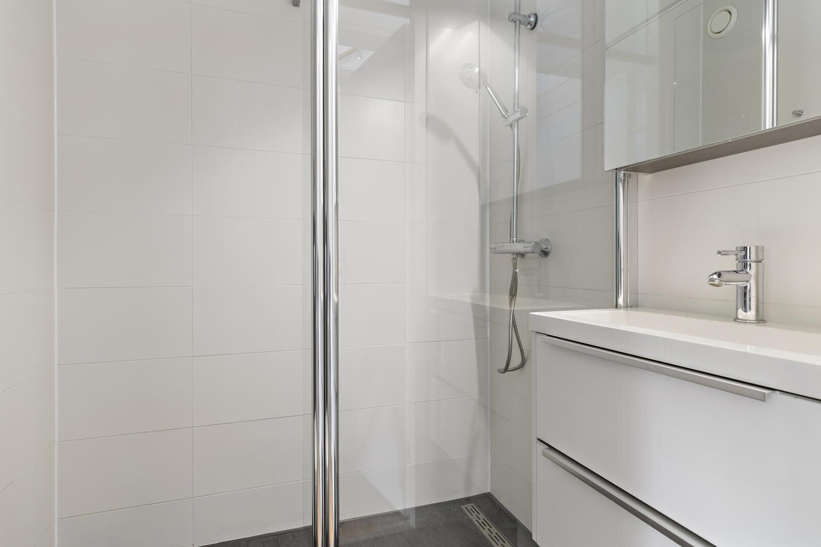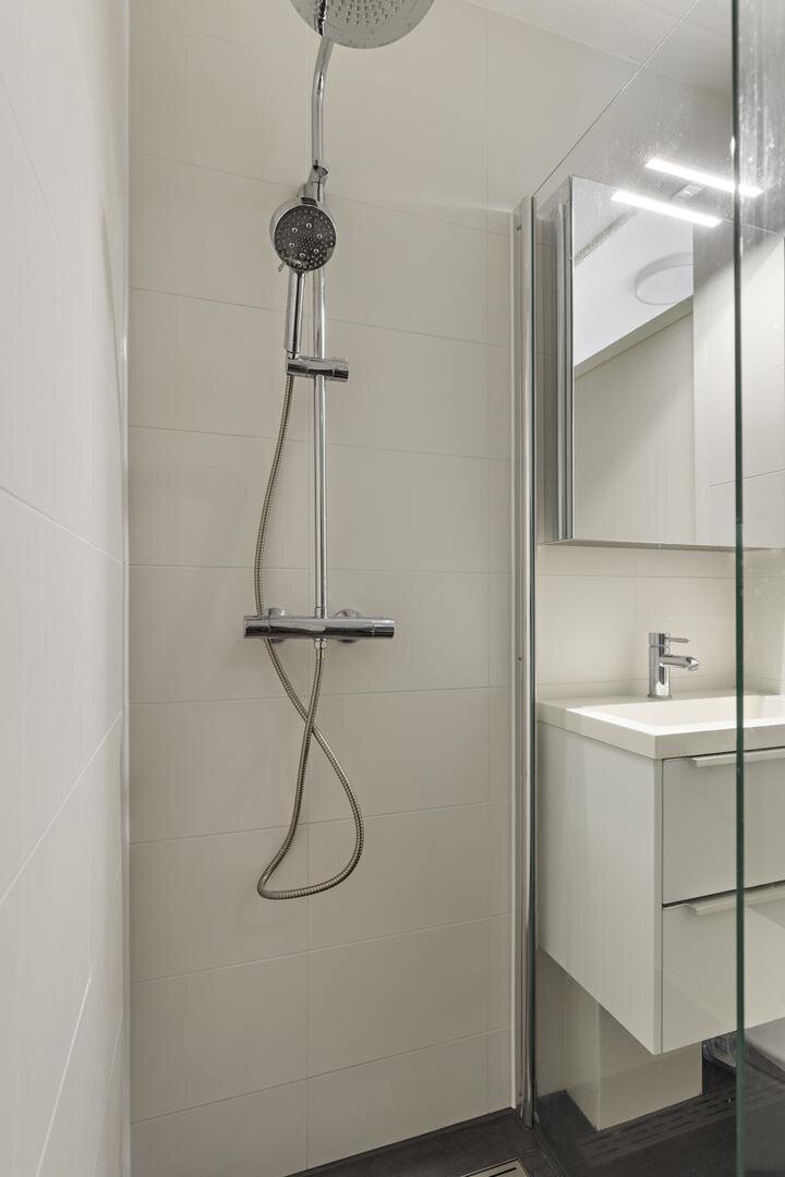 Eerste verdieping: overloop, twee slaapkamers van 18 en 12 m², nette badkamer met douche, wastafelmeubel en tweede toilet.