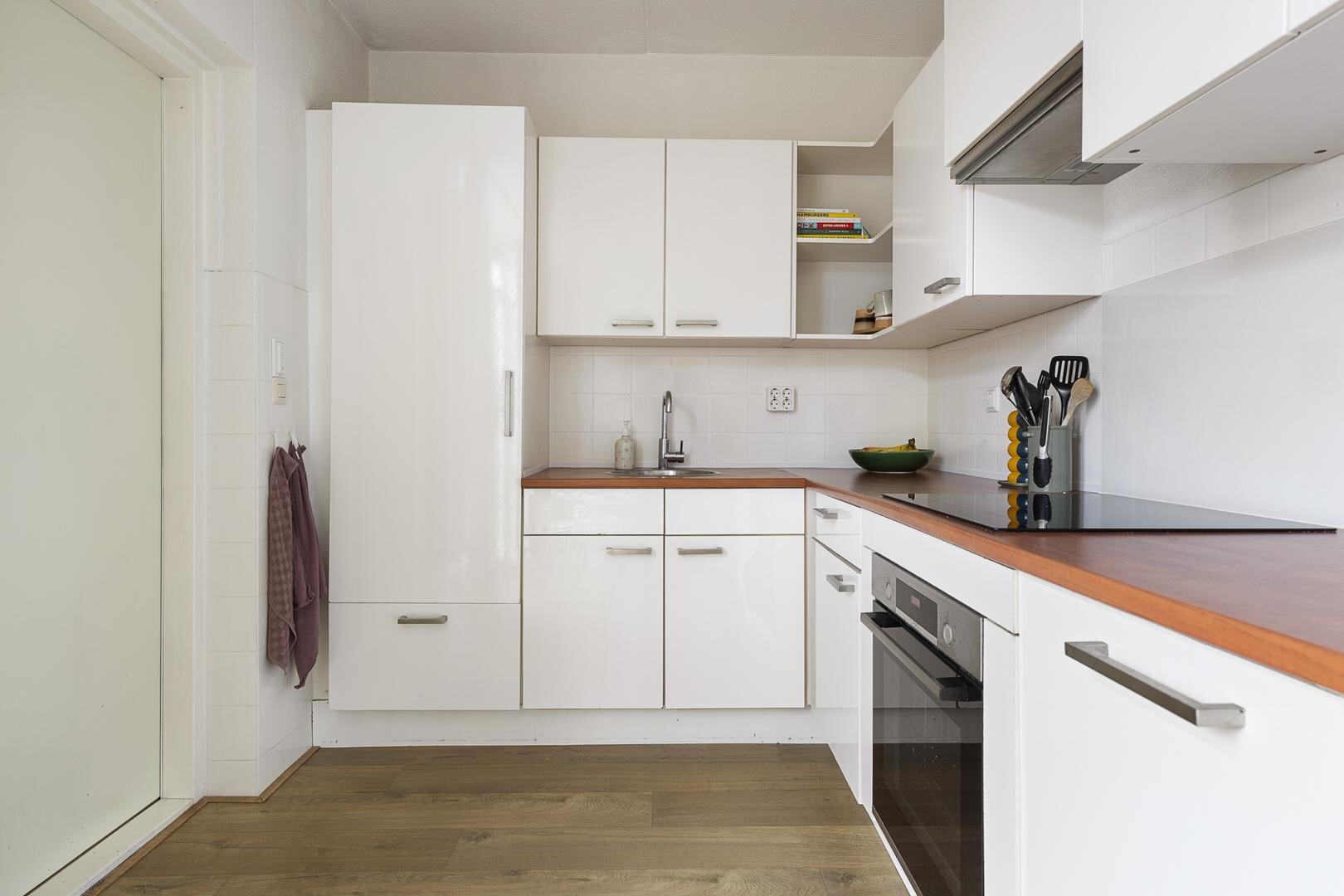 Begane grond: entree/hal; living met lichte straatgerichte woonkamer en tuingerichte eethoek en openslaande deuren naar de achtertuin. De open keuken is voorzien van een nette keukenopstelling met inductiekookplaat, afzuigkap, oven, koelkast en vaatwasser. Totaal woonoppervlakte van de keuken en woonkamer is ca. 34 m². De bijkeuken geeft toegang tot het vernieuwde toilet en achterom/bergruimte met deur naar de tuin.