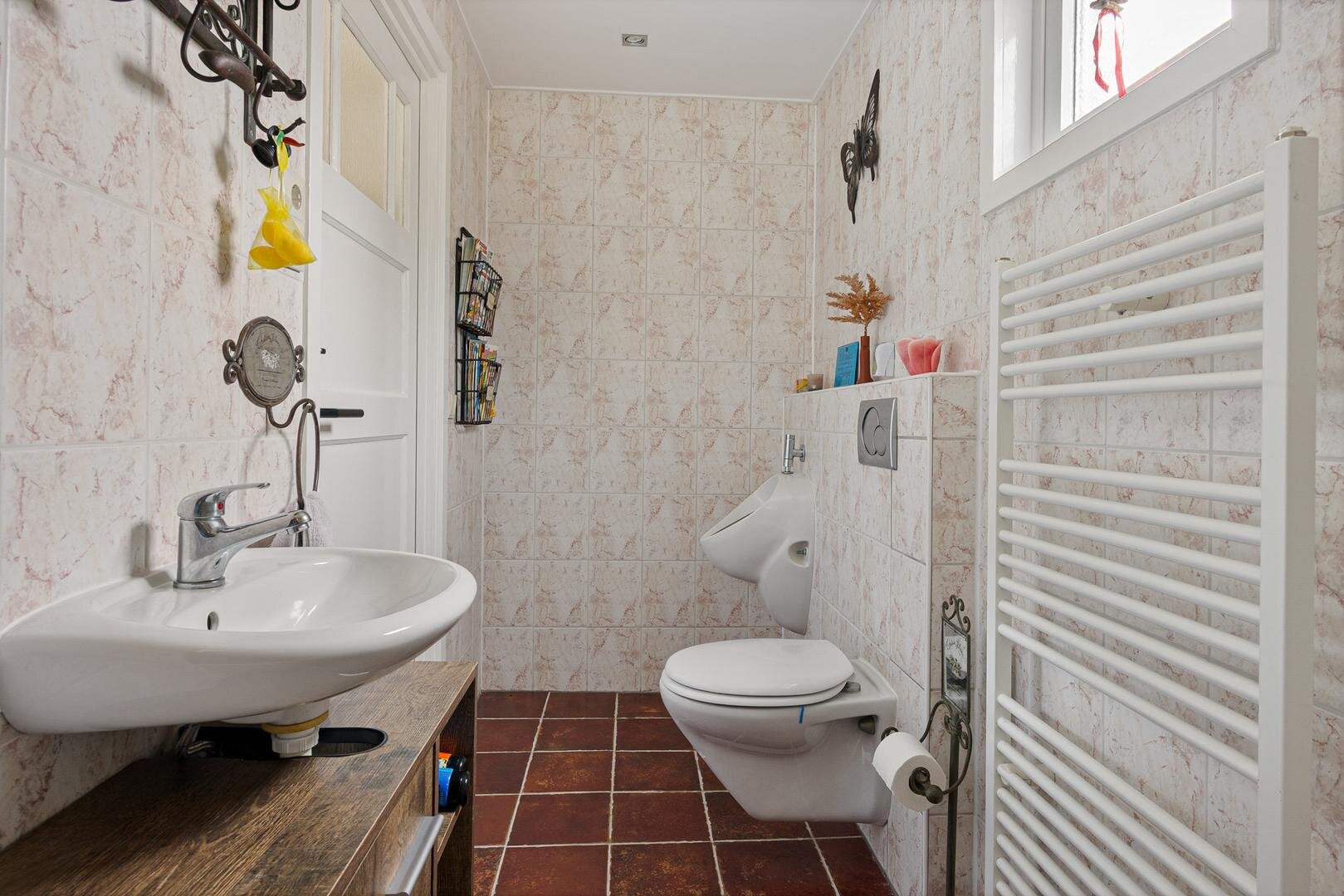 Stap je aan de achterzijde de keuken uit dan bevindt je je in de bijkeuken met witgoedaansluitingen, extra bergruimte en een deur naar buiten. Vanuit hier bereik je ook de badkamer op de begane grond, voorzien van een bad/douche, wastafel, toilet en urinoir.