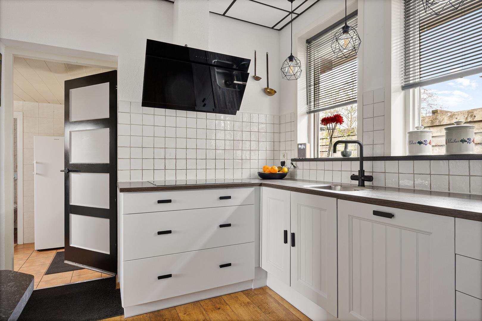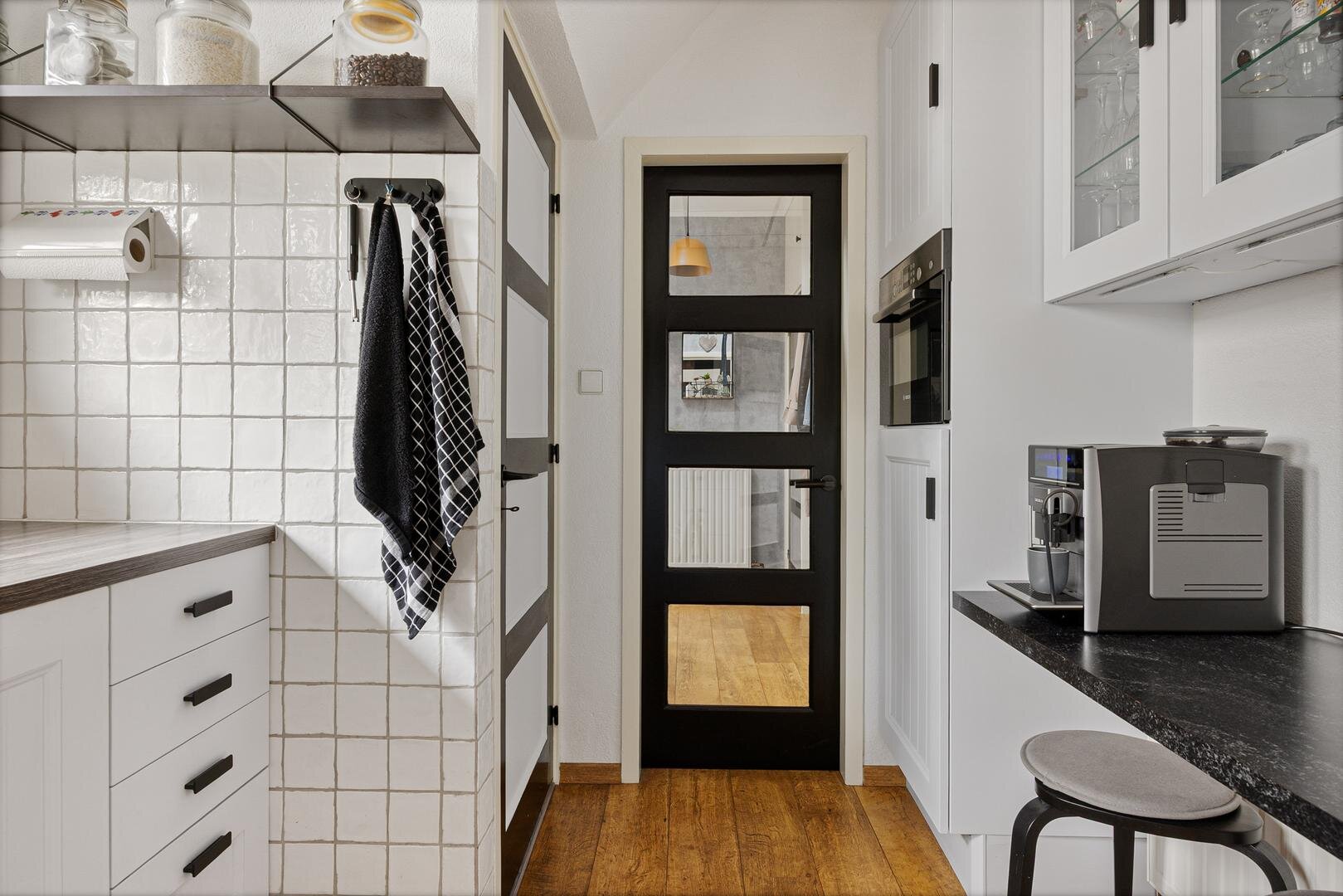 De halfopen keuken sluit mooi aan op de woonkamer en is voorzien van diverse inbouwapparatuur, waaronder een inductiekookplaat, combi-oven, koelkast en kokend water kraan. Vanuit de keuken is er toegang tot de kelder en een doorgang naar de eerder genoemde hal.