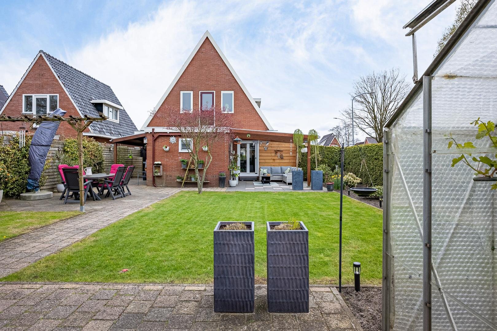 Buiten: De tuin rondom de woning is verzorgd aangelegd en biedt meerdere plekken om te zitten en te genieten van de rust en privacy. De hoekligging zorgt voor een extra ruimtelijk gevoel en veel vrijheid.