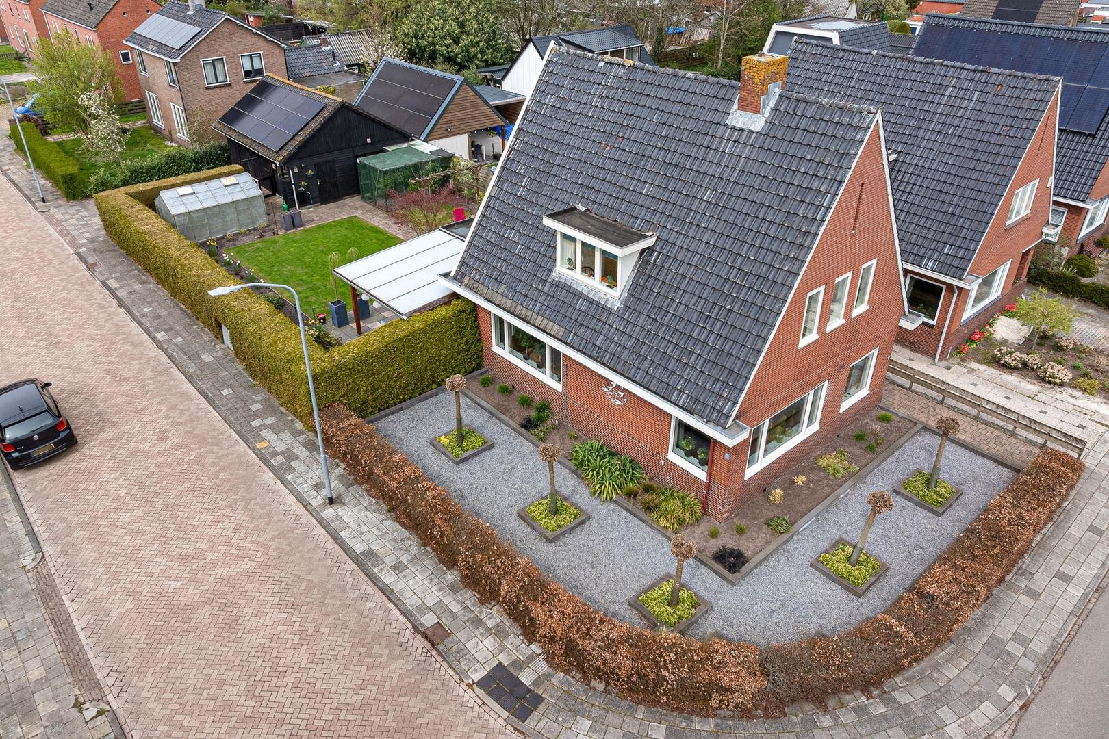 De oprit biedt volop parkeergelegenheid op eigen terrein, met ruimte voor meerdere auto’s, een camper of caravan. De royale dubbele garage/schuur (afm. 6 x 8 meter) met zolder maakt het geheel compleet en is ideaal voor opslag, hobby of het stallen van voertuigen.
