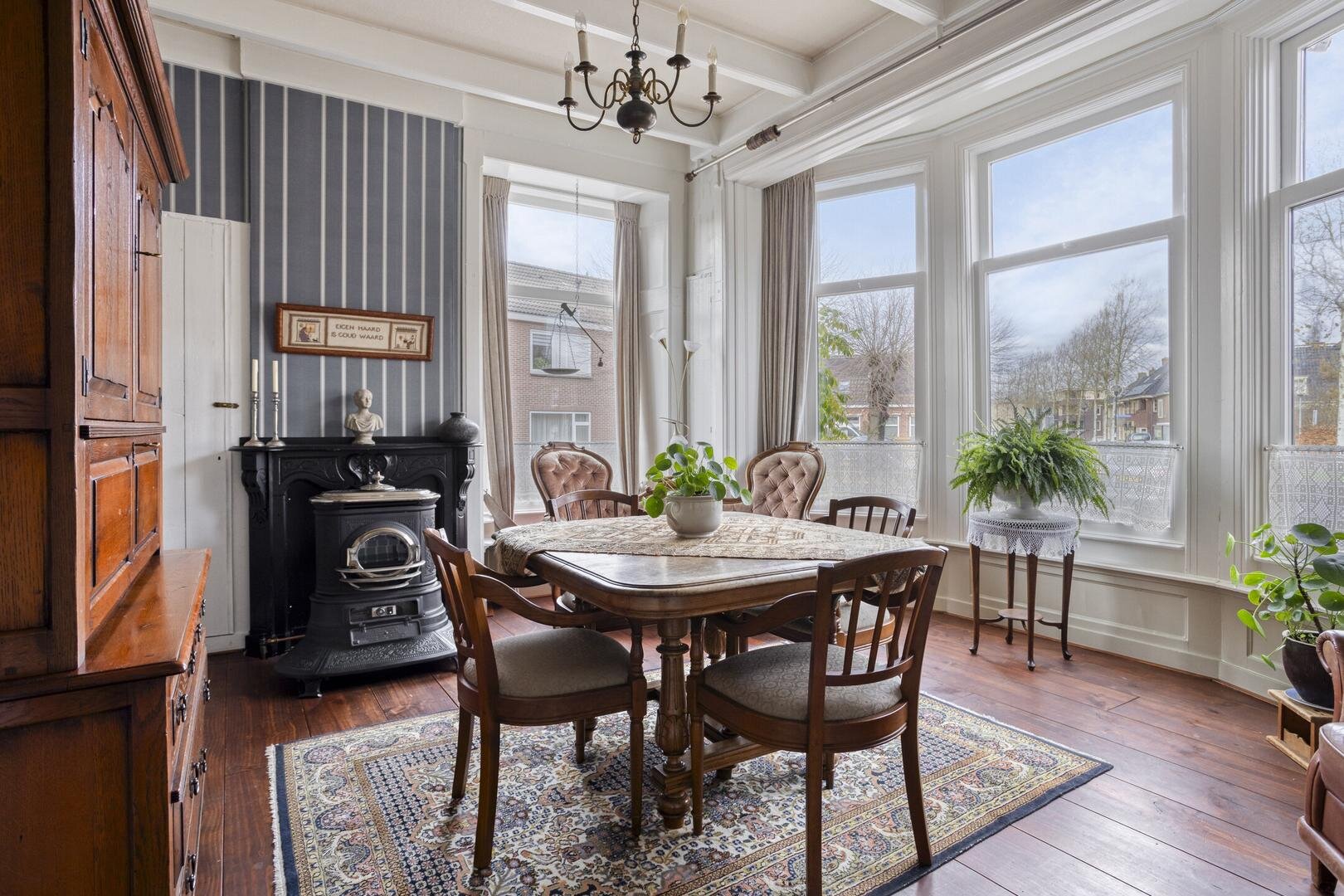 Begane grond: Entree in de hal/gang, met aan weerszijden toegang tot twee stijlvolle woonkamers (ca. 31 en 19 m²) aan de voorzijde. De hoge plafonds, grote raampartijen en de gaskachels passen perfect bij de stijl van het huis. Originele elementen — waaronder voormalige bedsteeruimten — zijn nog aanwezig en geven de ruimtes een rustige, authentieke sfeer.