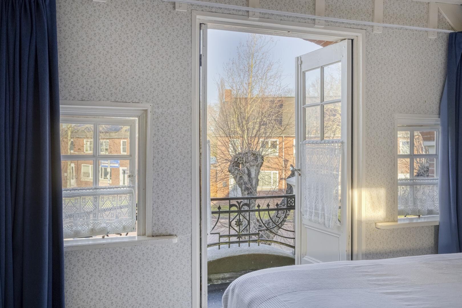Eerste verdieping: Op de verdieping bevindt zich momenteel een royale multifunctionele ruimte, bijvoorbeeld te gebruiken als werk- of hobbykamer, en voorzien van een sfeervolle bedstee. Aan de westzijde ligt een fijne slaapkamer met inbouwkast, toegang tot het balkon en opnieuw authentieke details.