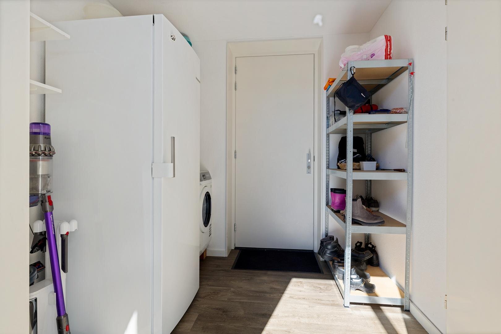 Vanuit de eerder genoemde hal is de praktische bijkeuken bereikbaar met extra bergruimte en witgoedaansluitingen. Ook functioneert deze ruimte als binnendoor naar de aangebouwde garage.