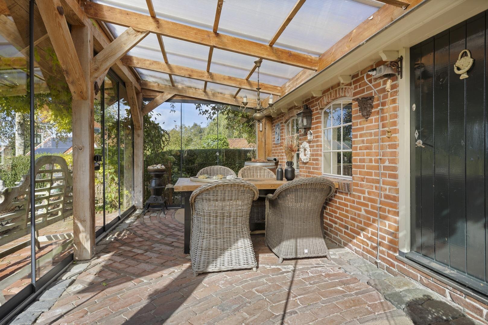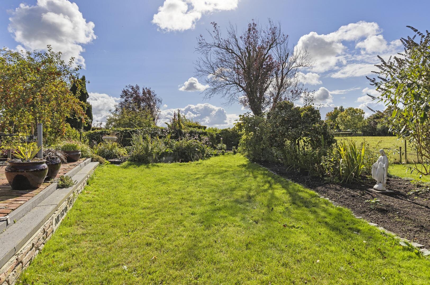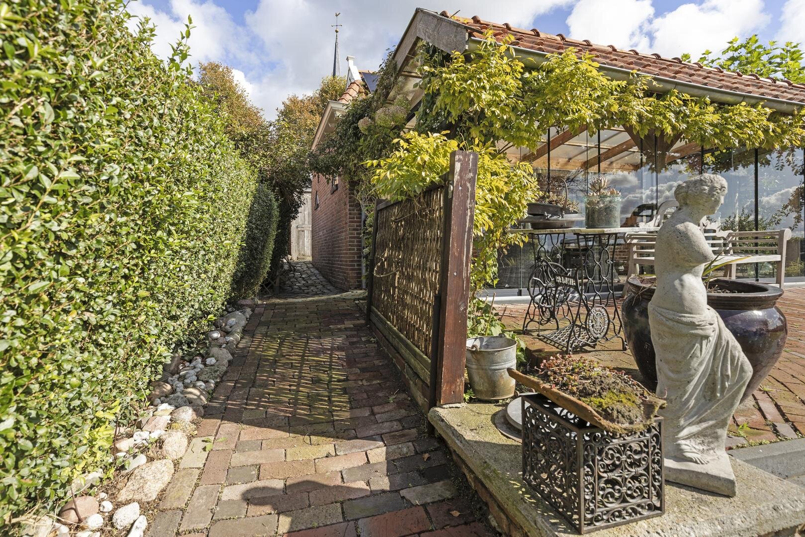 De achtertuin is werkelijk schitterend! Het grote terras is deels overdekt door de luxe tuinkamer en verder is de tuin mooi groen. De ligging op het zuidwesten biedt de gehele dag de zon en er is vrij uitzicht over de weilanden. Je kunt hier dan ook in alle privacy buiten zitten.