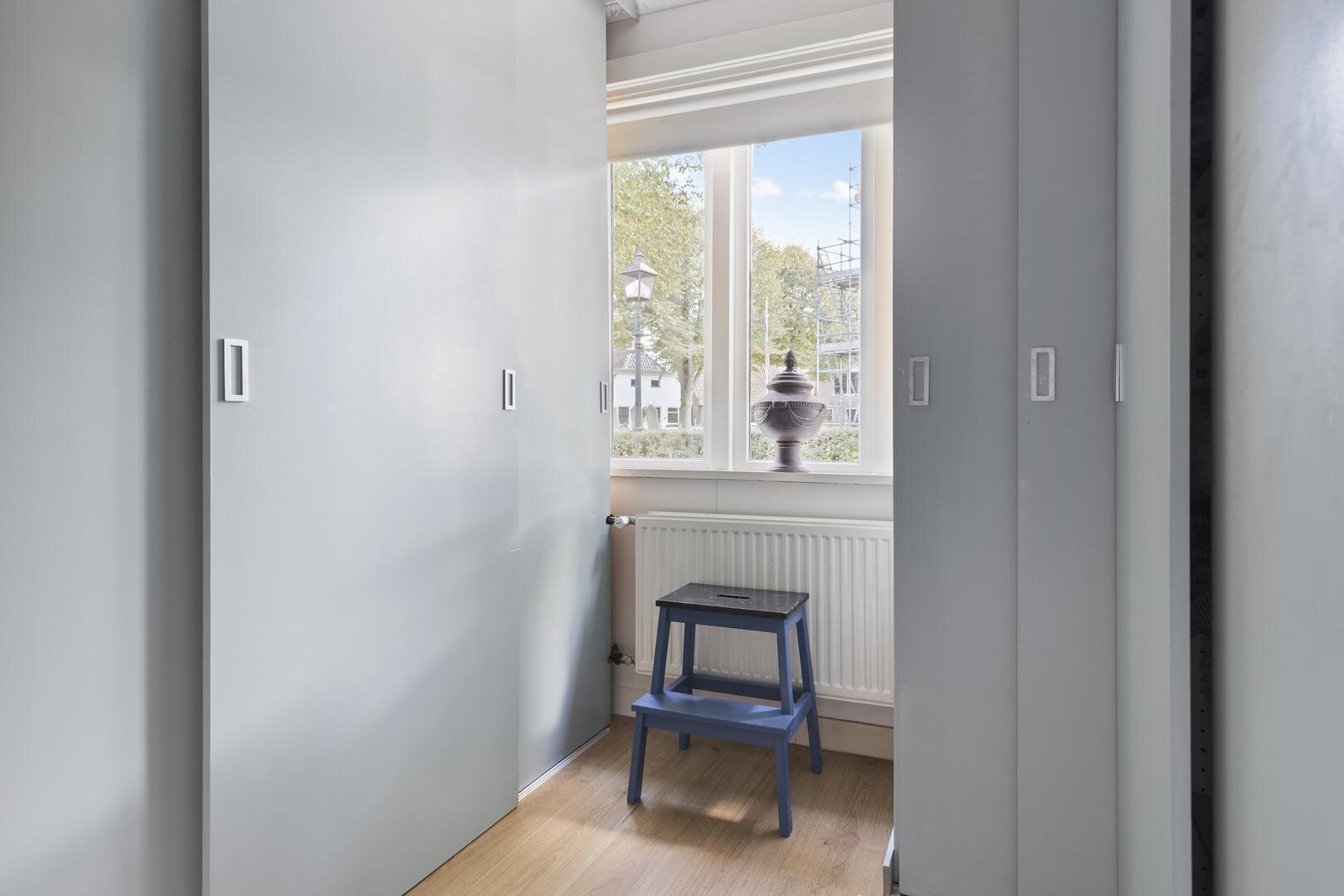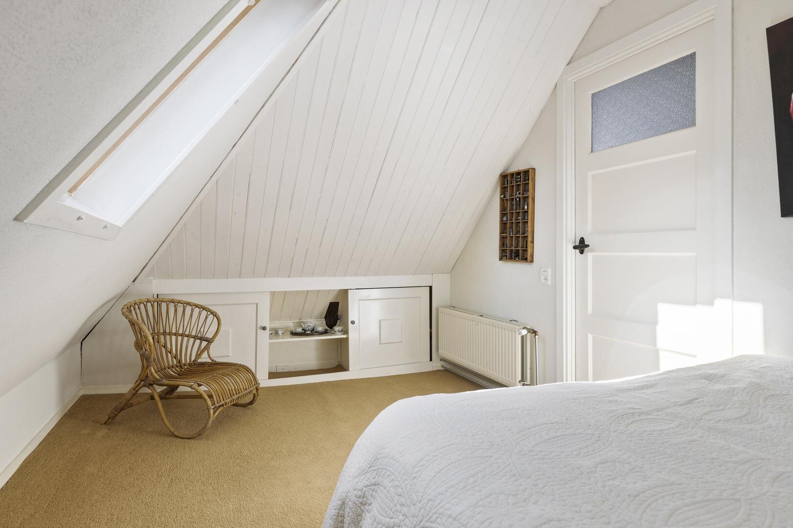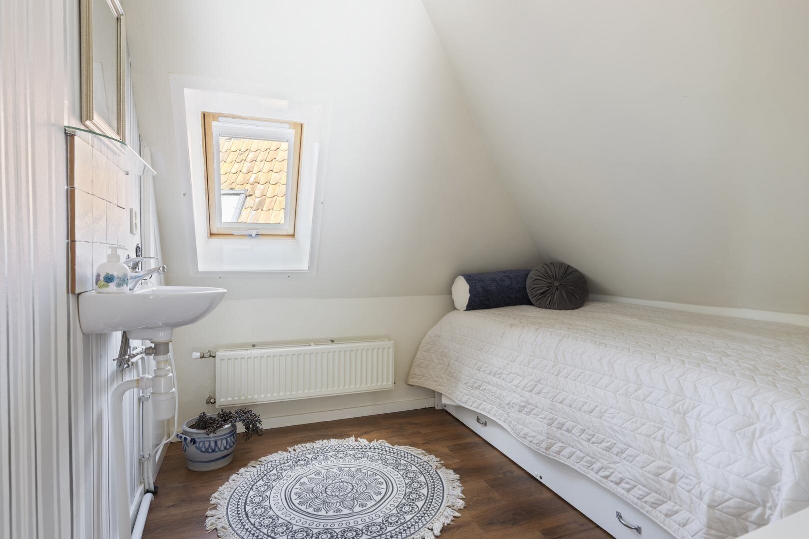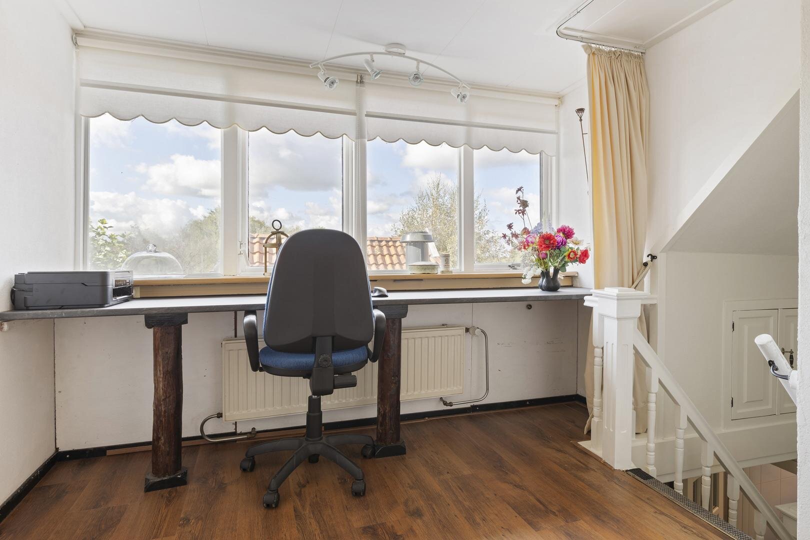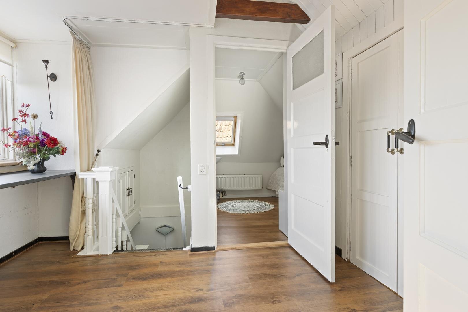 Eerste verdieping: overloop met dakkapel waardoor hier een prachtige werkplek is gerealiseerd en verder is er nog extra kastruimte aanwezig, slaapkamer van ca. 5 m² en slaapkamer van ca. 4 m² met beiden een vaste kast.