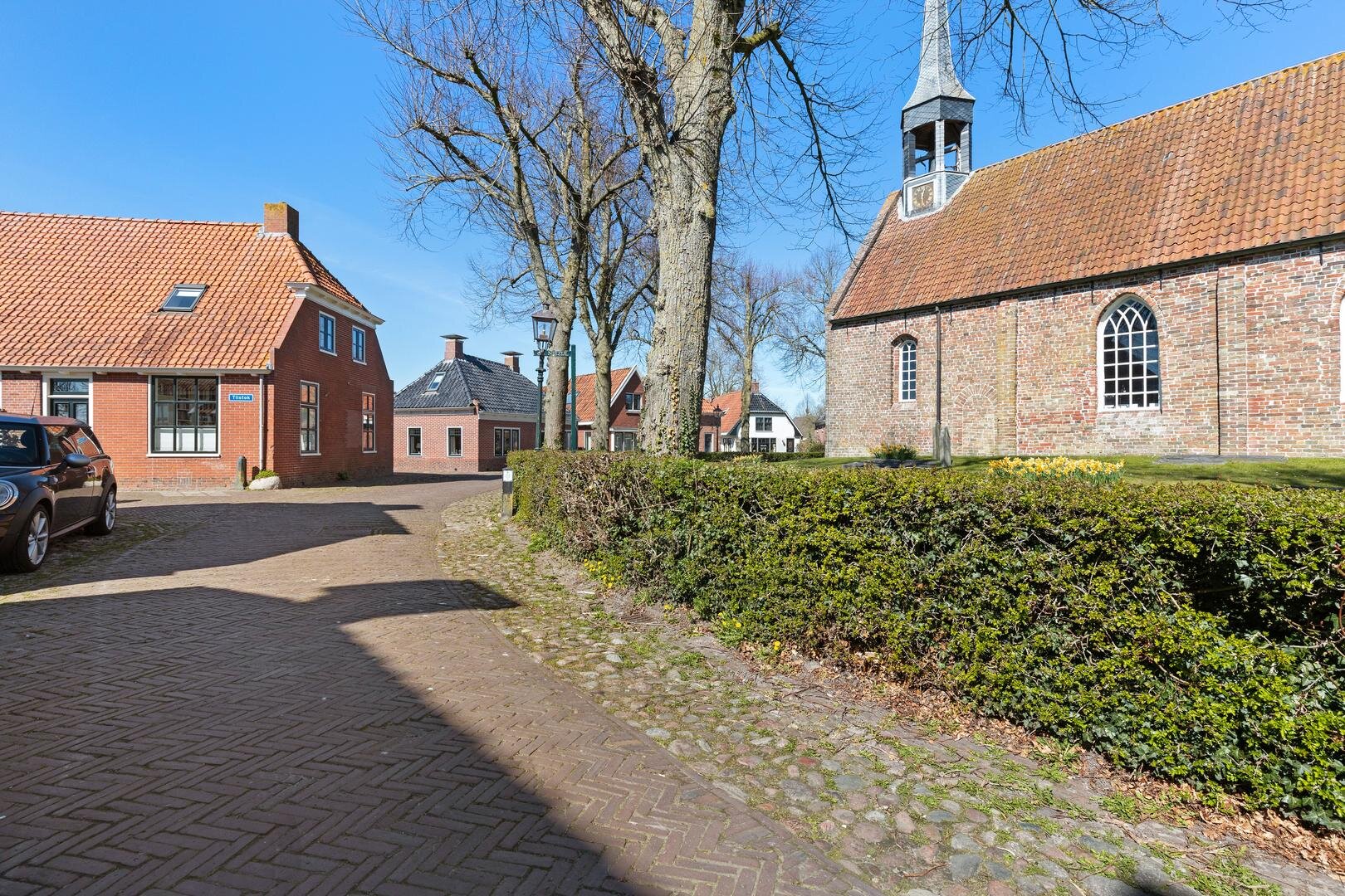 - aan de voorkant uitzicht op het 14e-eeuwse kerkje;