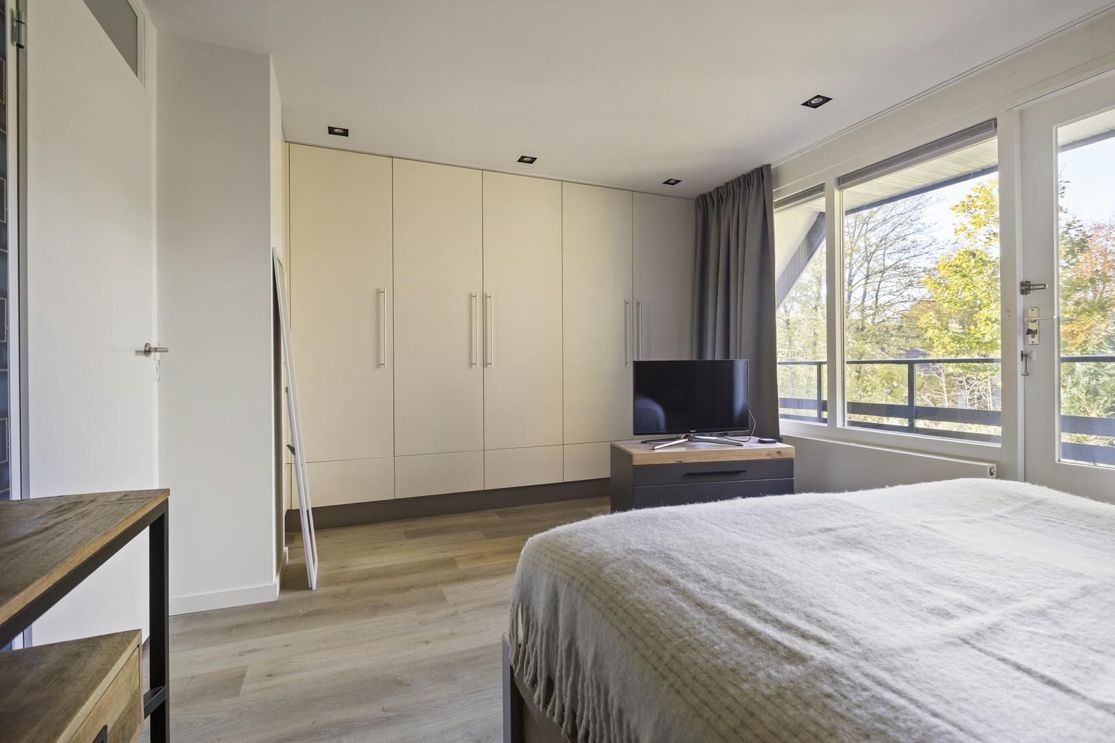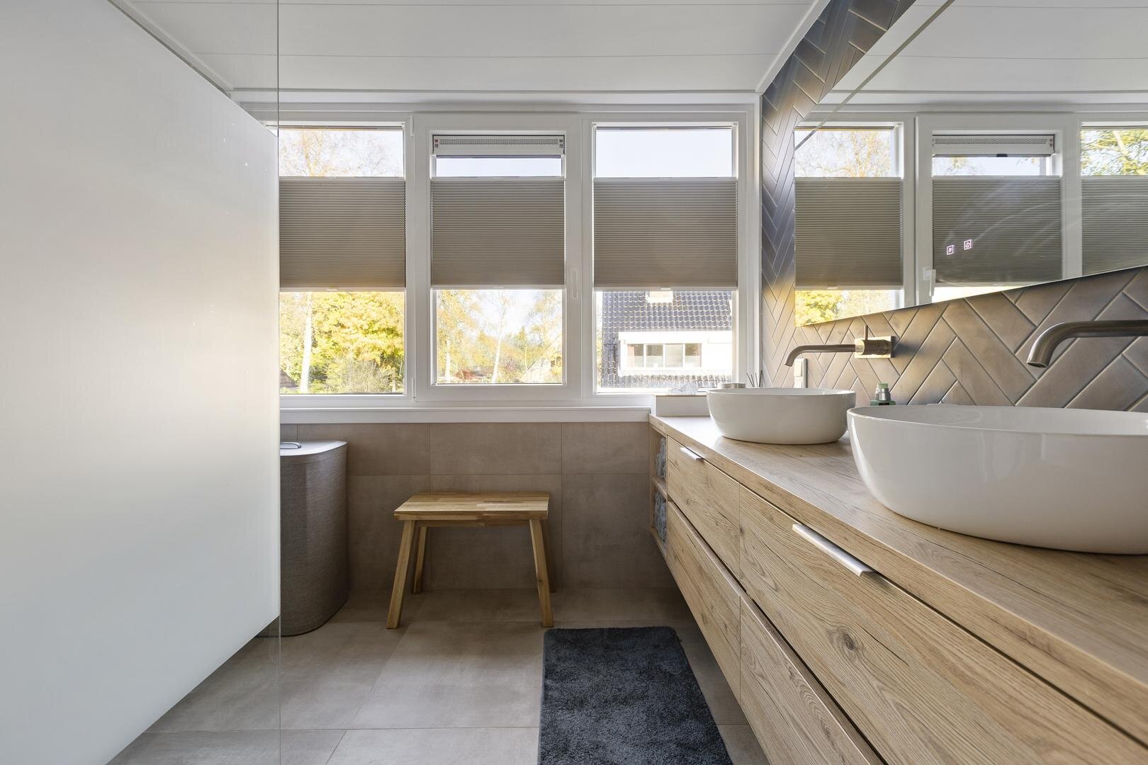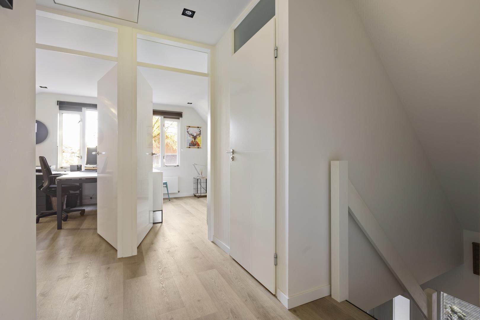 Op de verdieping zijn drie verzorgde, licht afgewerkte slaapkamers. De slaapkamer aan de voorzijde beschikt over een sfeervol inpandig balkon (loggia) — een heerlijke plek om in alle rust te genieten van ochtendzon en uitzicht op het groen. De moderne en complete badkamer (2021) is luxe uitgevoerd en voorzien van een (kunststof) dakkapel voor extra ruimte en licht. Je vindt hier een royale inloopdouche, dubbel wastafelmeubel, vloerverwarming en een design-radiator.