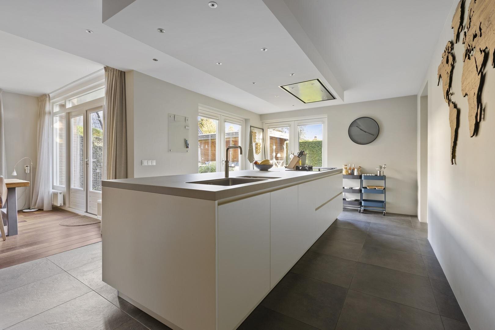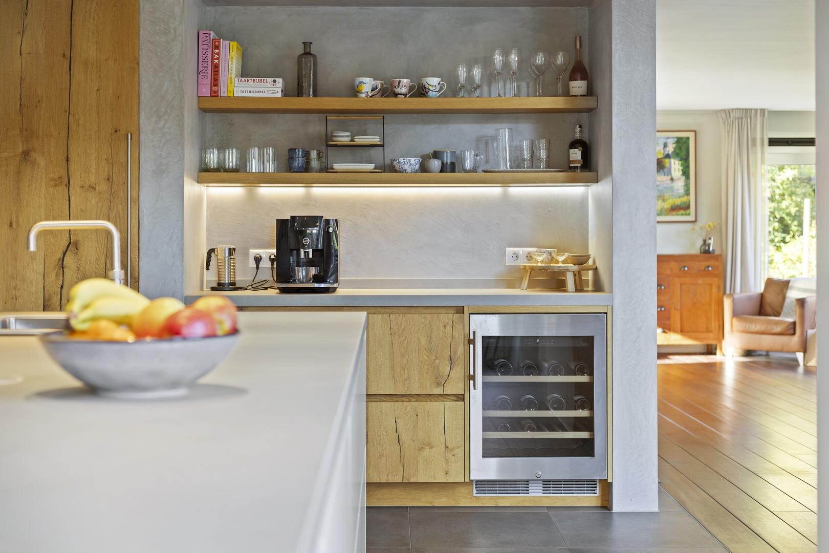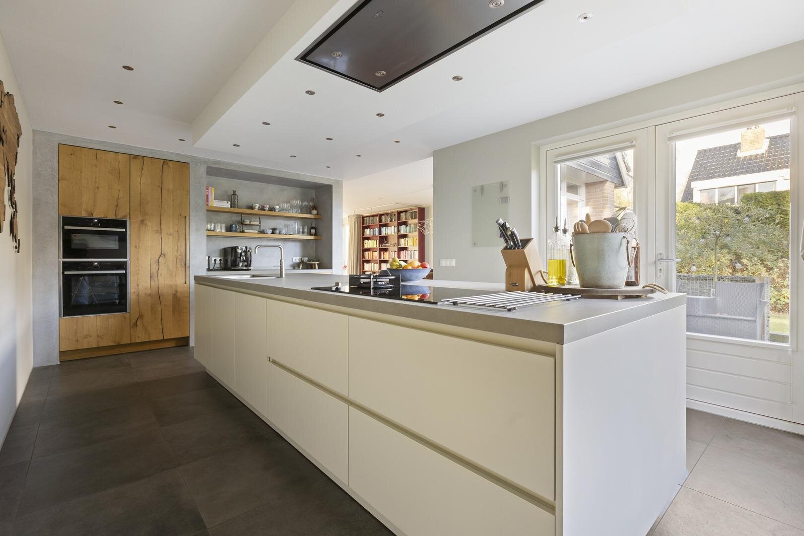 De woonkamer staat in open verbinding met de luxe leefkeuken (2017) welke het hart van het huis vormt. Deze ruime keuken is voorzien van een stijlvol kook- en spoeleiland en uitgerust met hoogwaardige inbouwapparatuur (Neff), waaronder een inductiekookplaat met wokbrander, combi-oven, oven, vaatwasser, koelkast, Quooker en wijnklimaatkast.