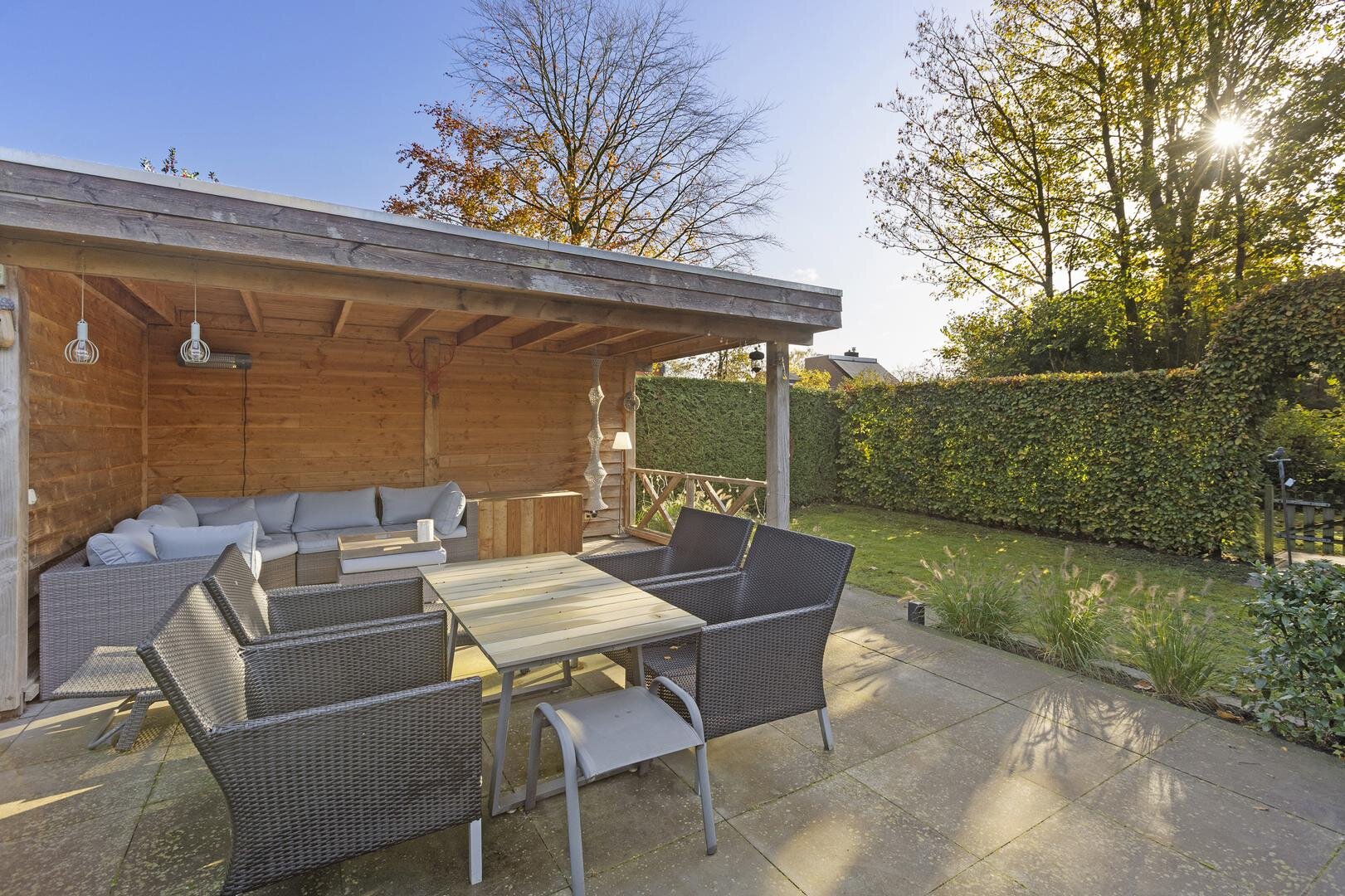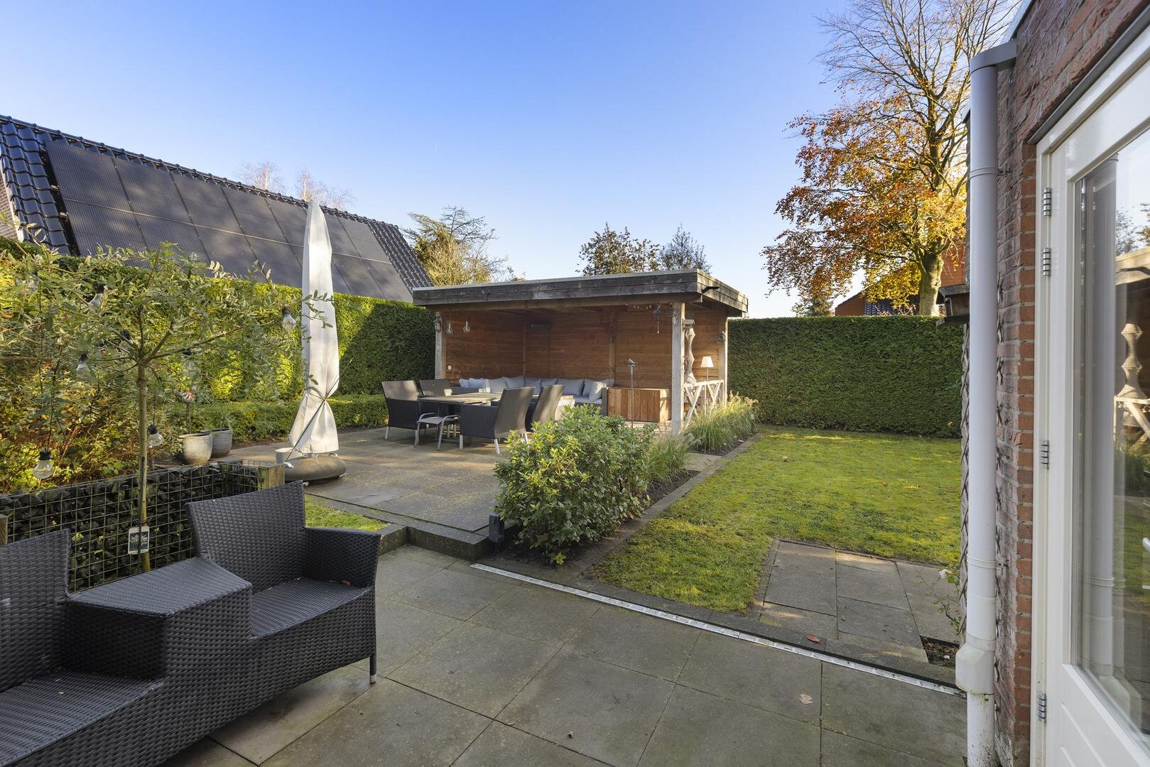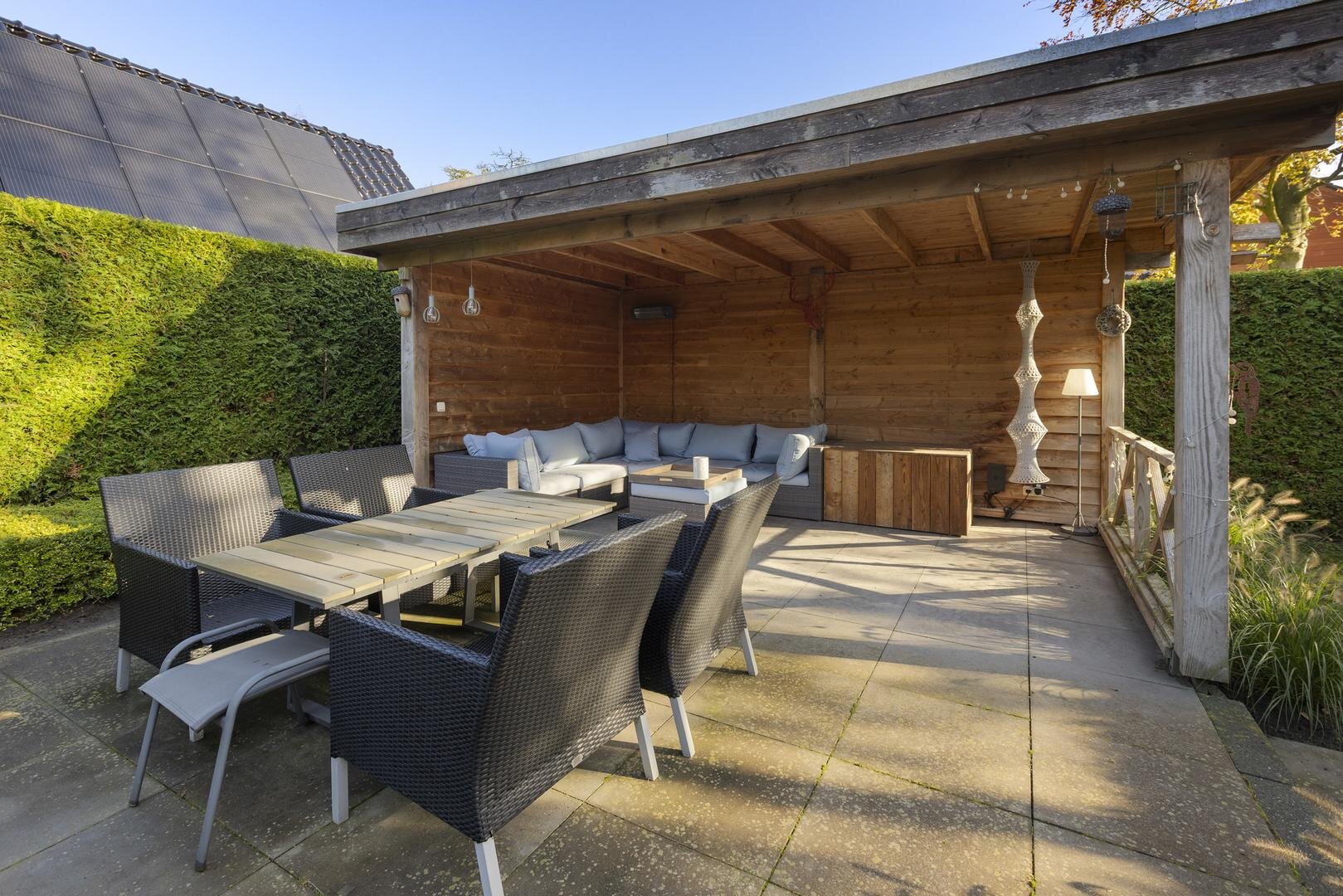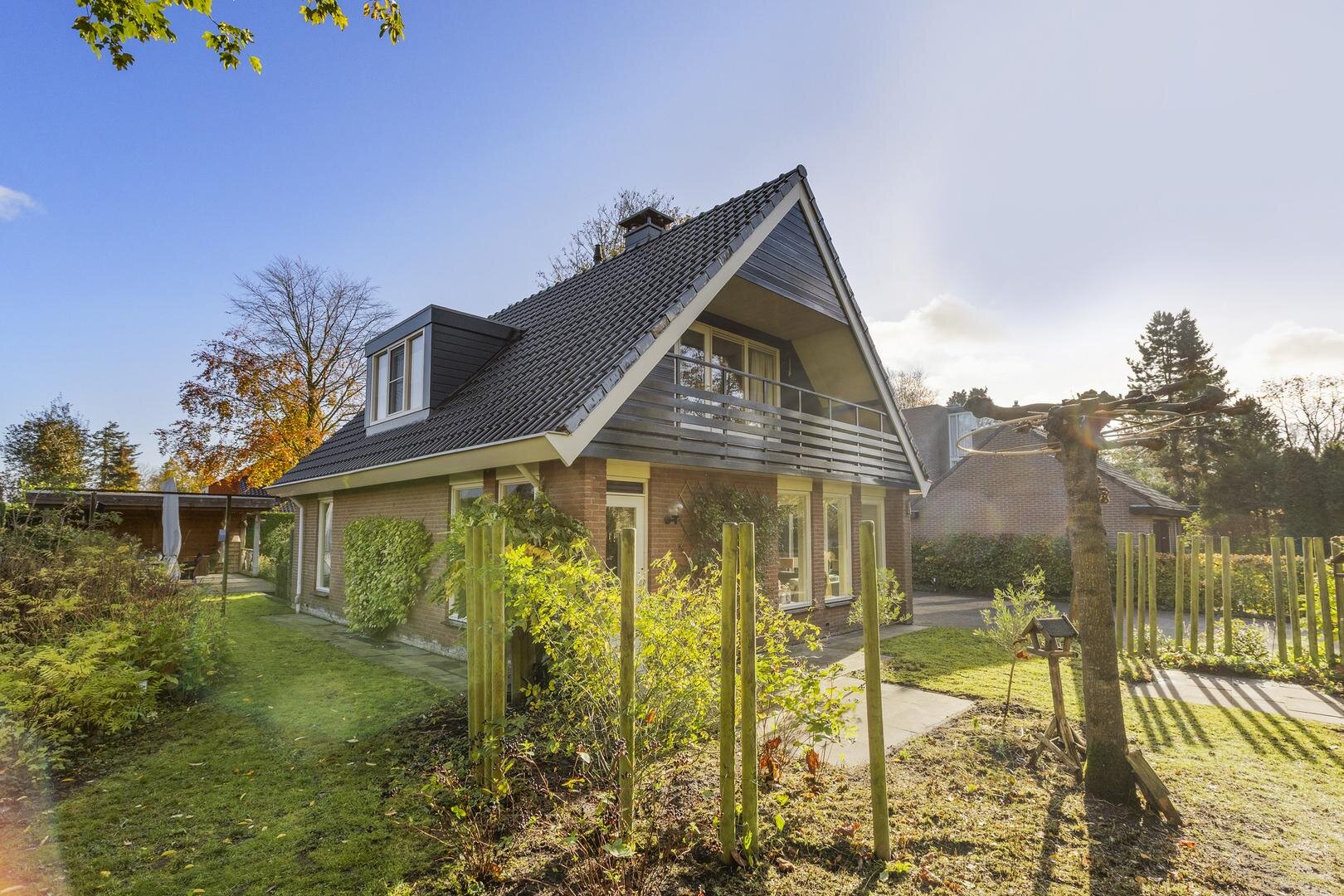 De tuin rondom de woning biedt volop privacy en veelzijdige zitplekken. Van het overdekte terras tot een zonnig lounge-gedeelte en het inpandige balkon op de verdieping — er is altijd een fijne plek om te genieten. De houten berging zorgt voor extra opbergruimte; de oprit met ruimte voor meerdere auto's en een laadpaal maakt de woning helemaal compleet.