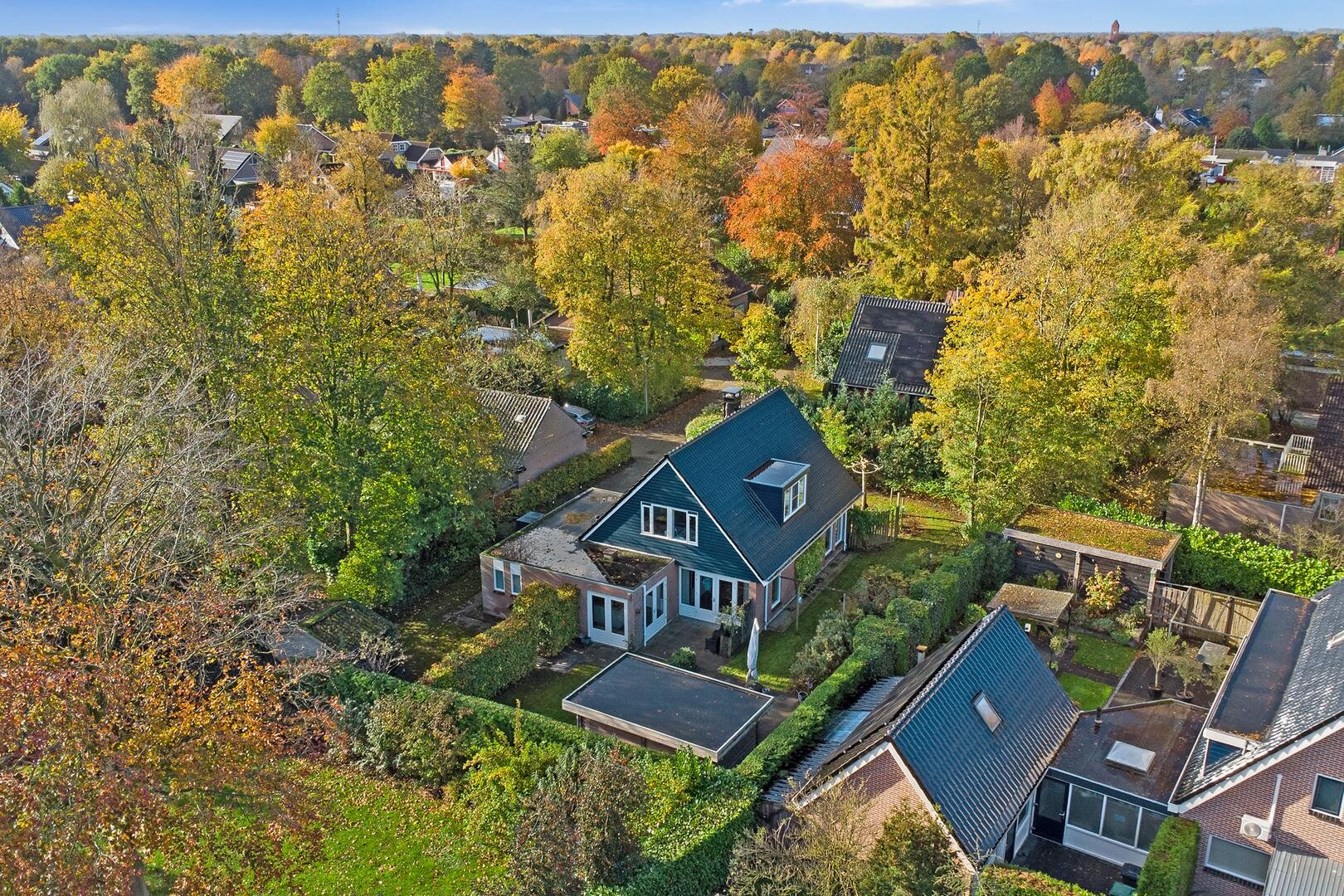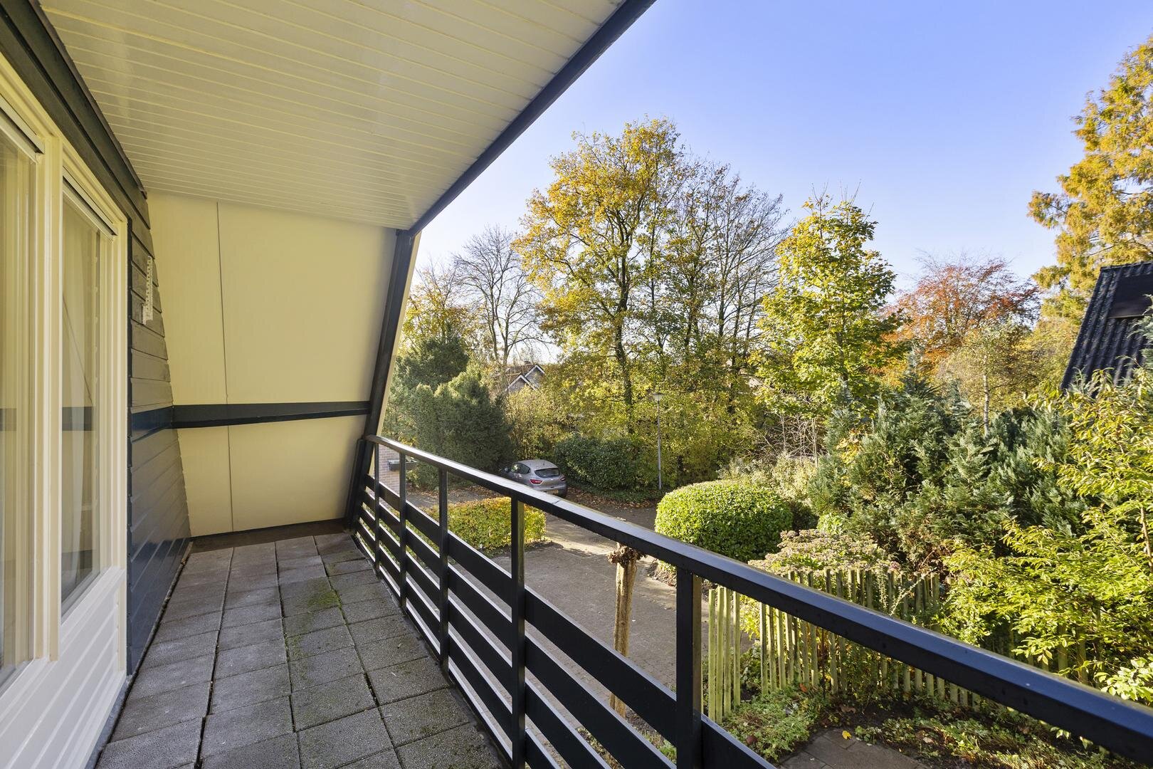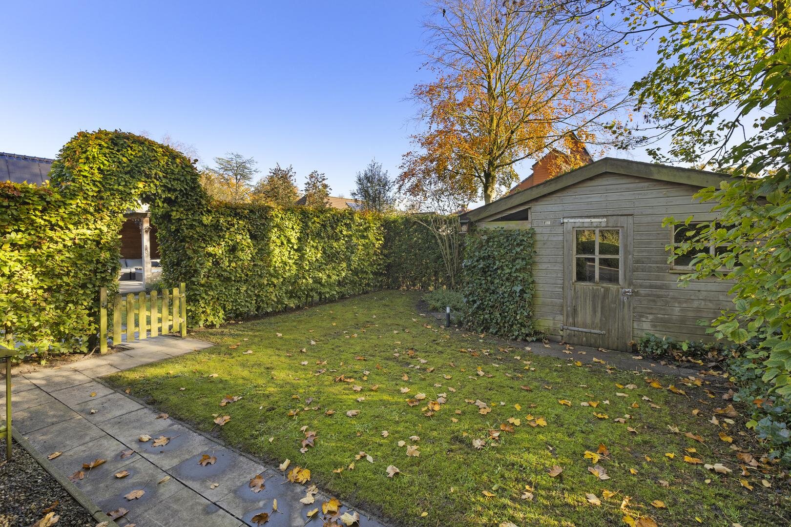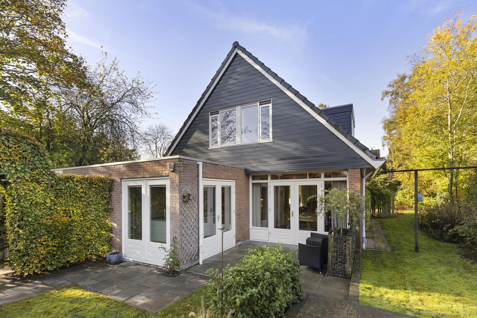 De tuin rondom de woning biedt volop privacy en veelzijdige zitplekken. Van het overdekte terras tot een zonnig lounge-gedeelte en het inpandige balkon op de verdieping — er is altijd een fijne plek om te genieten. De houten berging zorgt voor extra opbergruimte; de oprit met ruimte voor meerdere auto's en een laadpaal maakt de woning helemaal compleet.