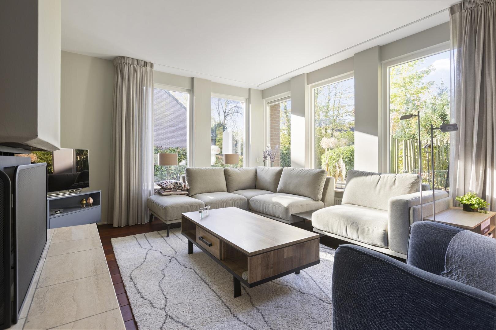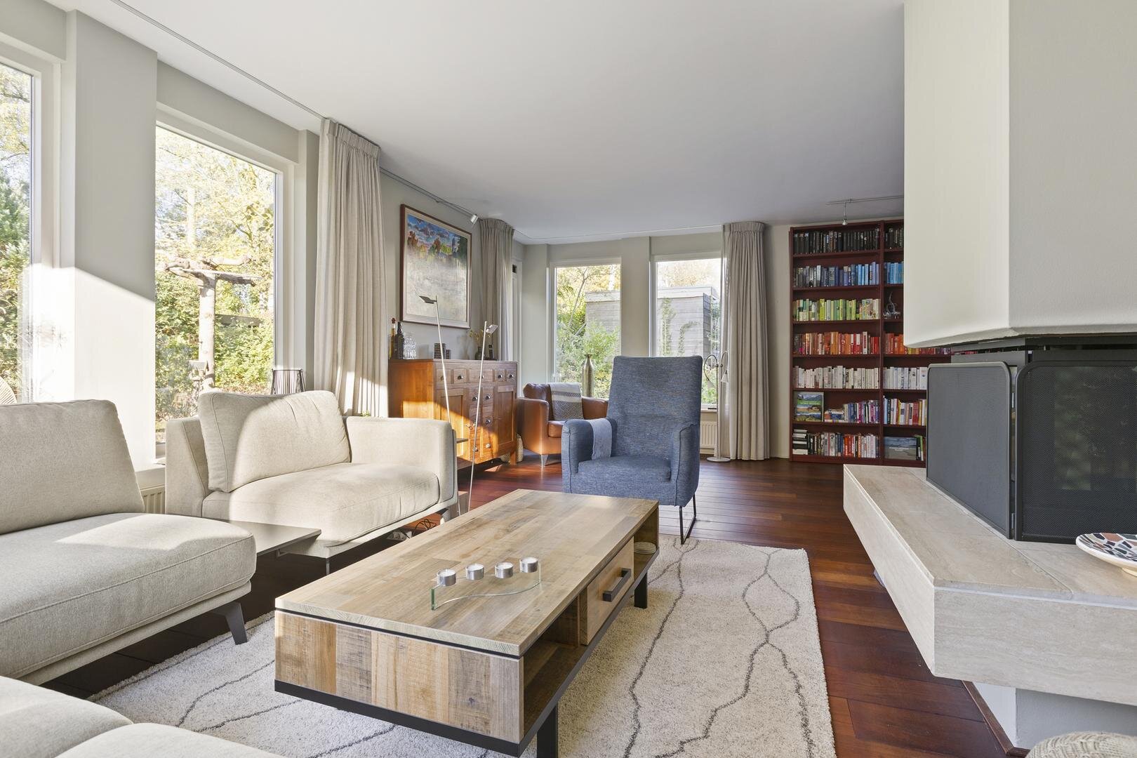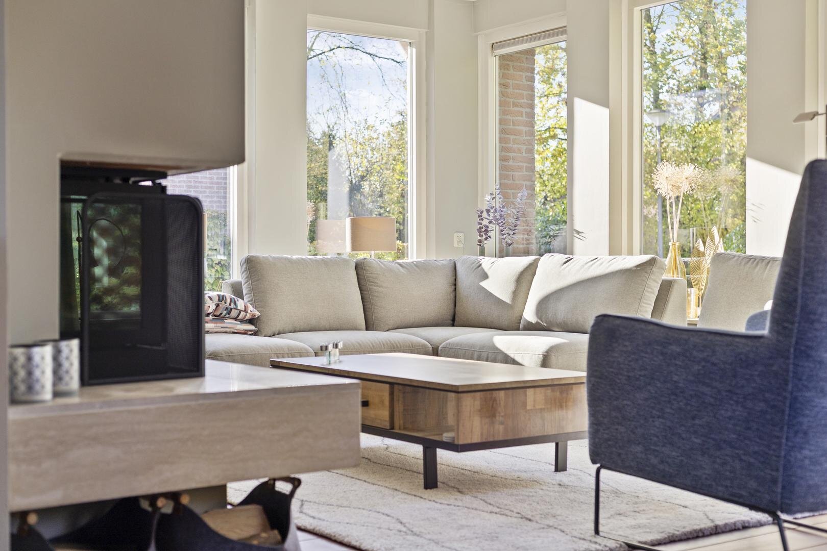 Via de overdekte entree kom je binnen in de ruime hal met modern toilet en vernieuwde meterkast; de L-vormige woonkamer voelt warm en uitnodigend door o.a. de ruime opzet en de mooie lichtinval dankzij de openslaande deuren aan de achterzijde en de tuindeur aan de voorzijde waardoor veel verbinding met de tuin — binnen en buiten lopen prachtig in elkaar over. Op koelere dagen zorgt de sfeervolle inzethaard voor extra warmte en een aangename sfeer.