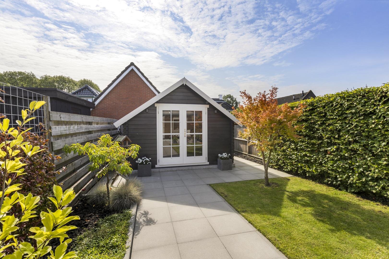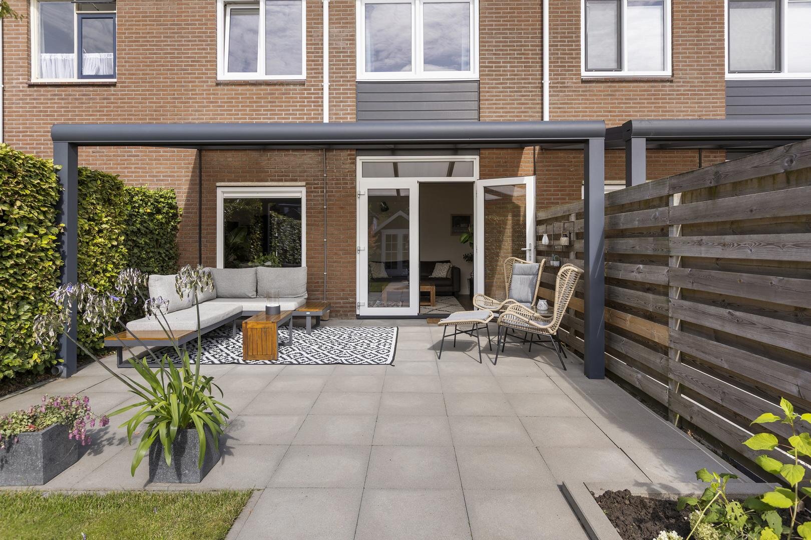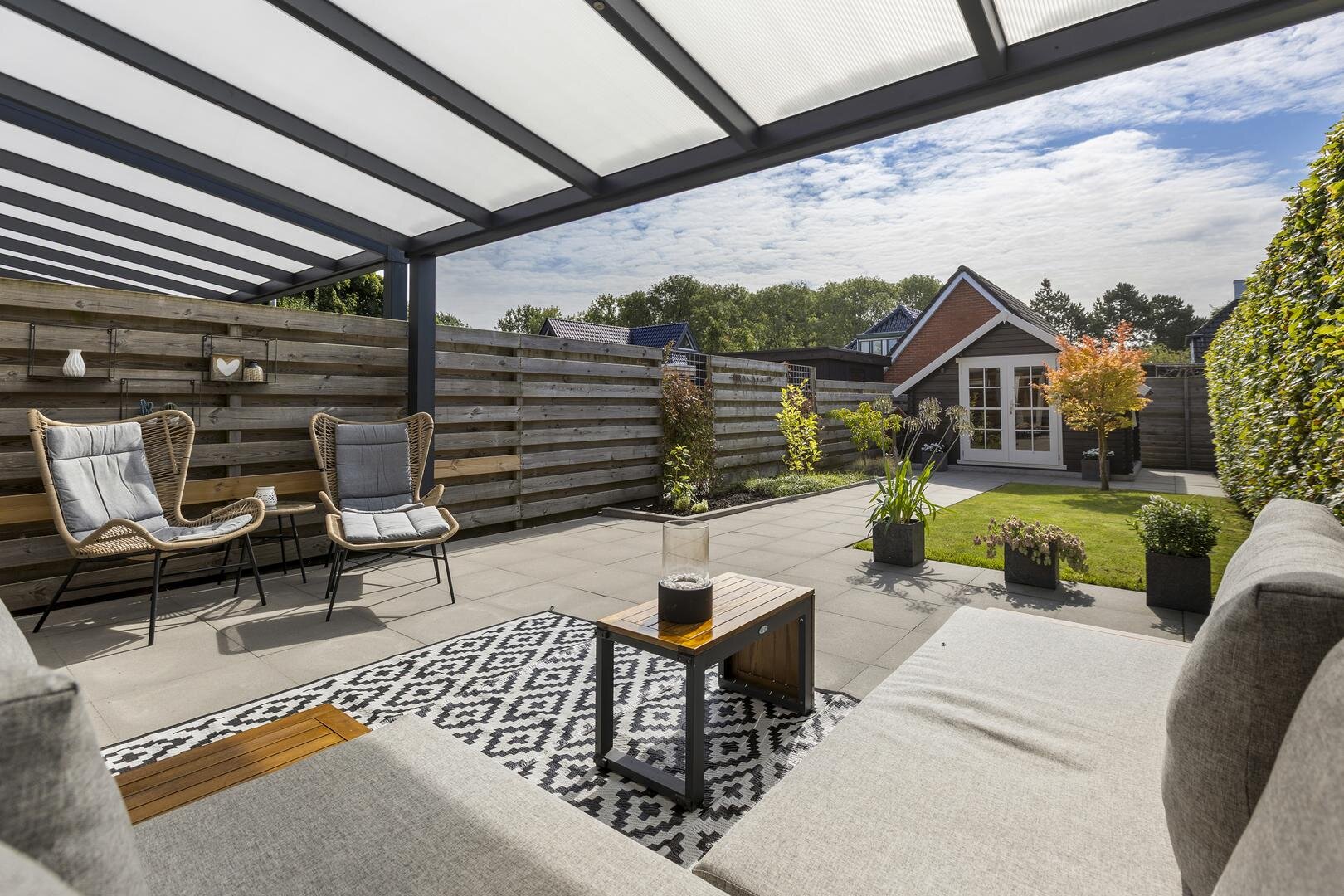De zonnige achtertuin met achterom ligt gunstig op het zuidoosten, waardoor u een groot deel van de dag van de zon kunt genieten. De stijlvolle tuinberging en bestrating geven een luxe uitstraling.