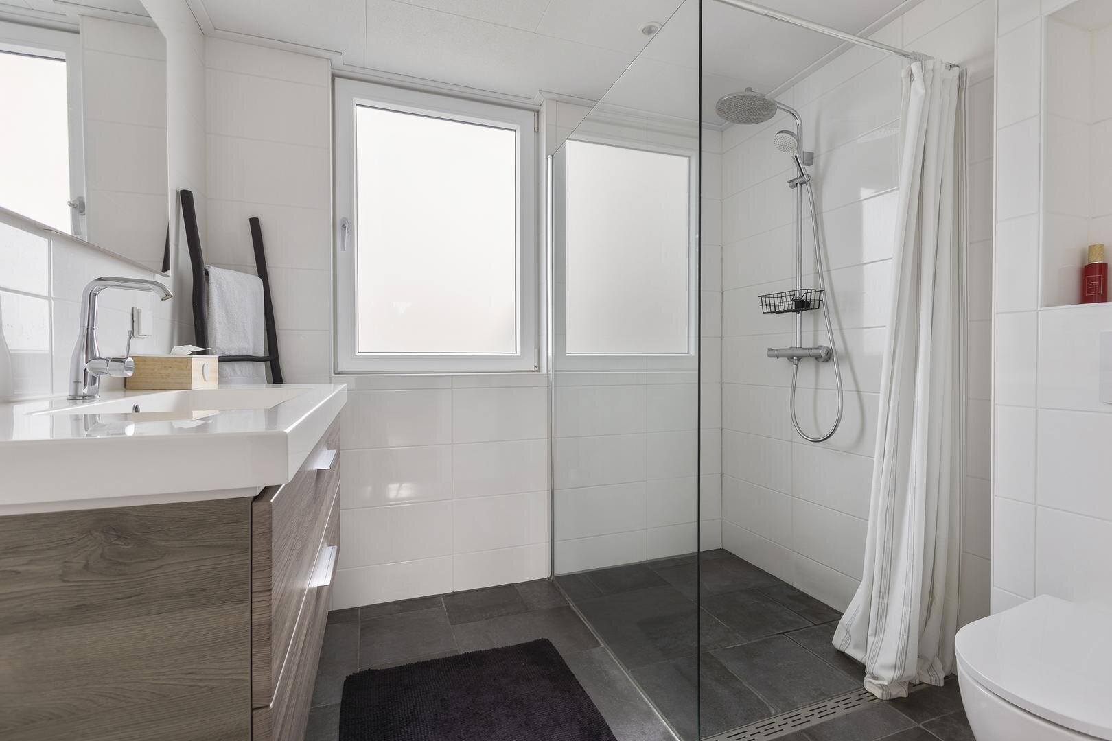 Overloop; 3 slaapkamers en een moderne badkamer. De slaapkamers zijn ruim van formaat en beschikken allemaal over veel lichtinval. De badkamer is praktisch en compleet ingericht met een royale inloopdouche, een hangend toilet en een fraai wastafelmeubel.