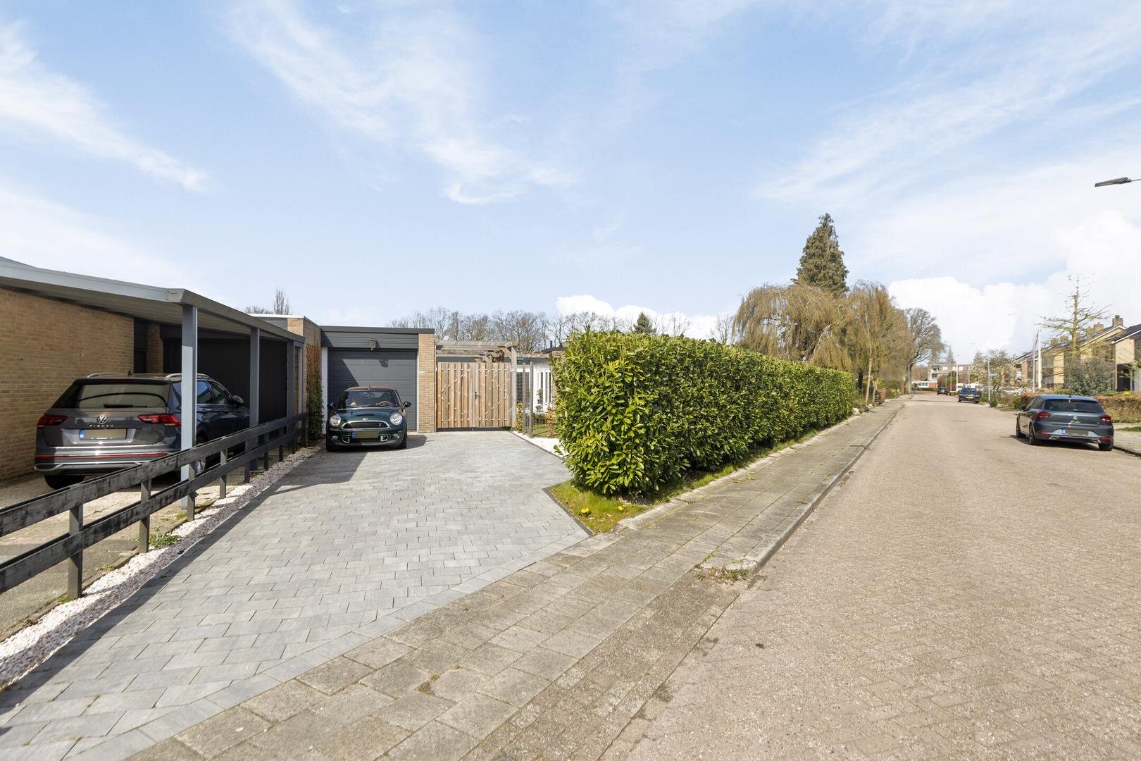 Aangebouwde garage van circa 29 m² en een berging. De oprit biedt ruimte voor meerdere auto’s op eigen terrein.