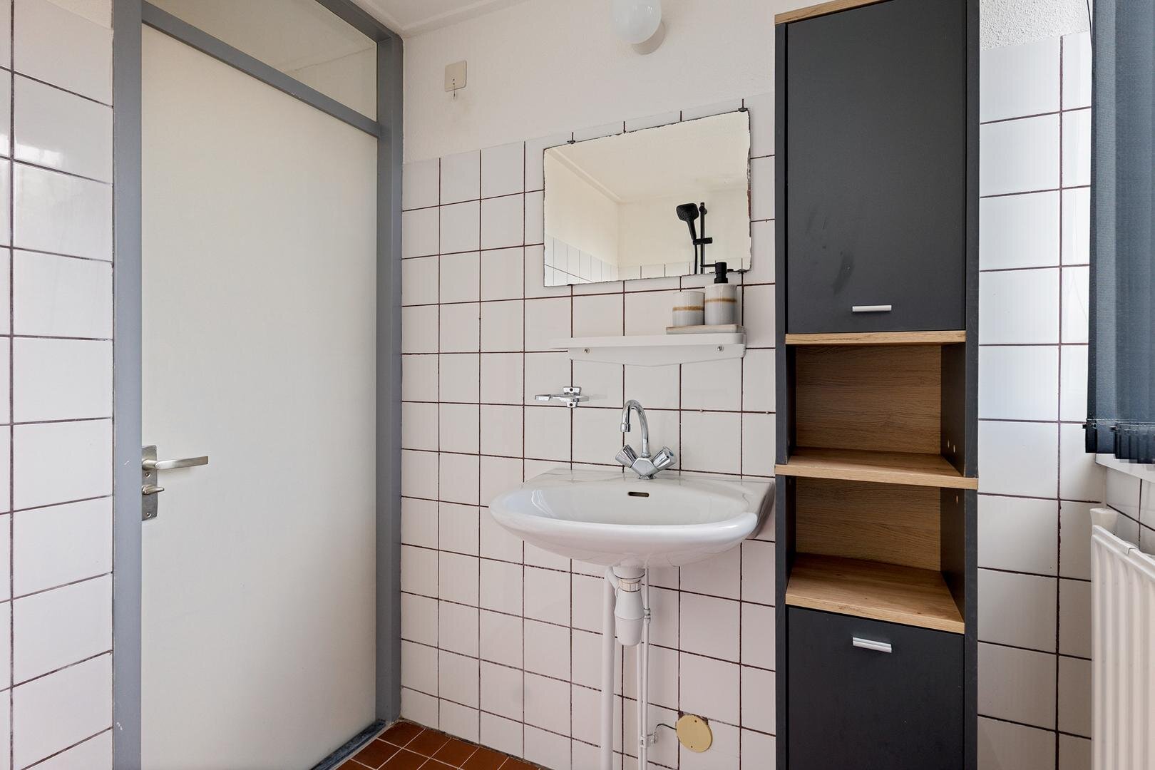 Begane grond: entree via de voordeur; hal met meterkast en trapopgang; toiletruimte met toilet en fontein; lichte woon-/eetkamer met open keuken (totaal ca. 36 m²); trapkast; bijkeuken met opstelling van de cv-ketel en witgoedaansluitingen.