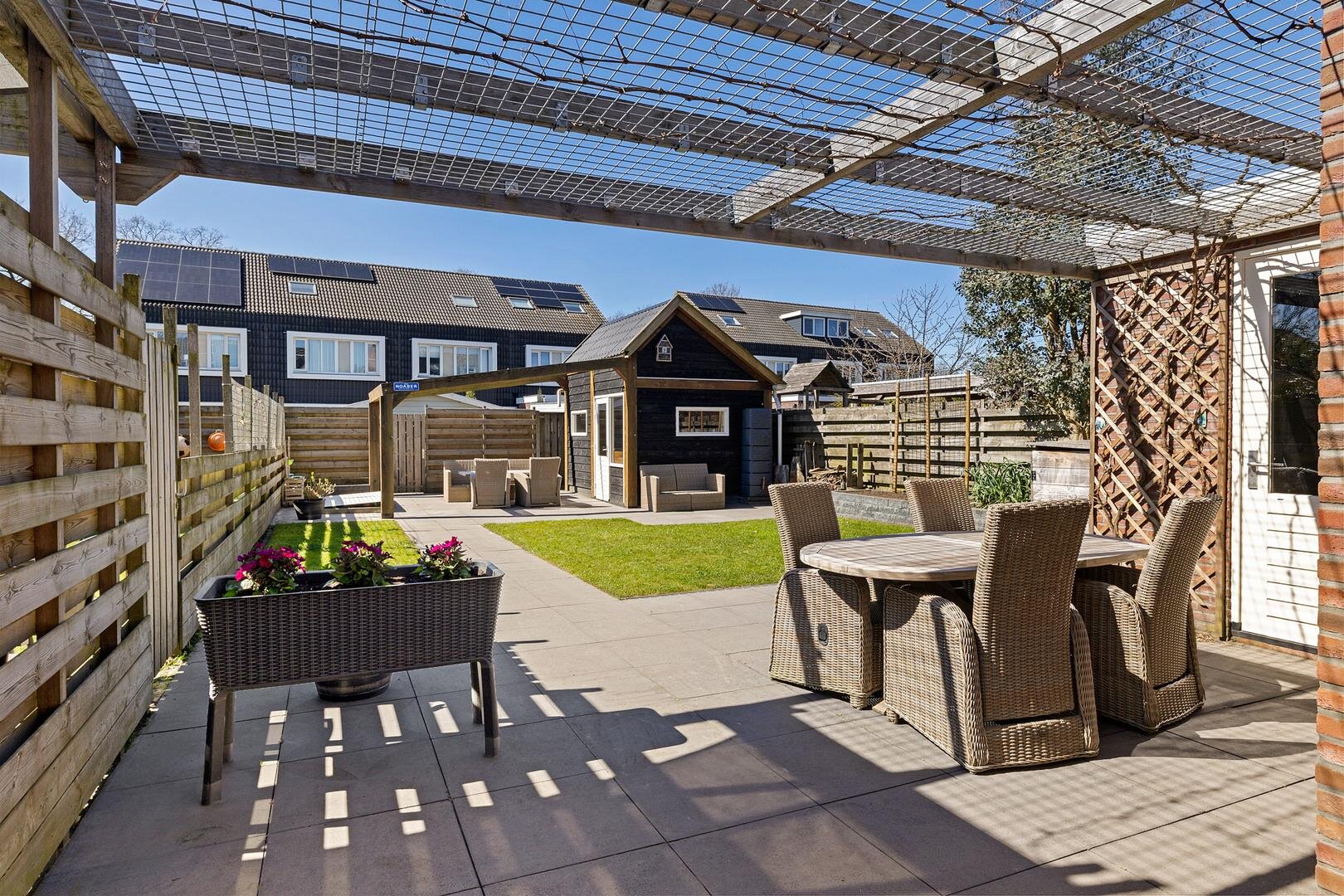 De achtertuin is een van de sterke punten van deze woning: verrassend diep, verzorgd aangelegd en gelegen op het westen, waardoor je hier volop geniet van de middag- en avondzon. In de tuin staat een vrijstaand, geïsoleerd tuinhuis met elektra en wateraansluiting — ideaal als hobbyruimte of werkplek.