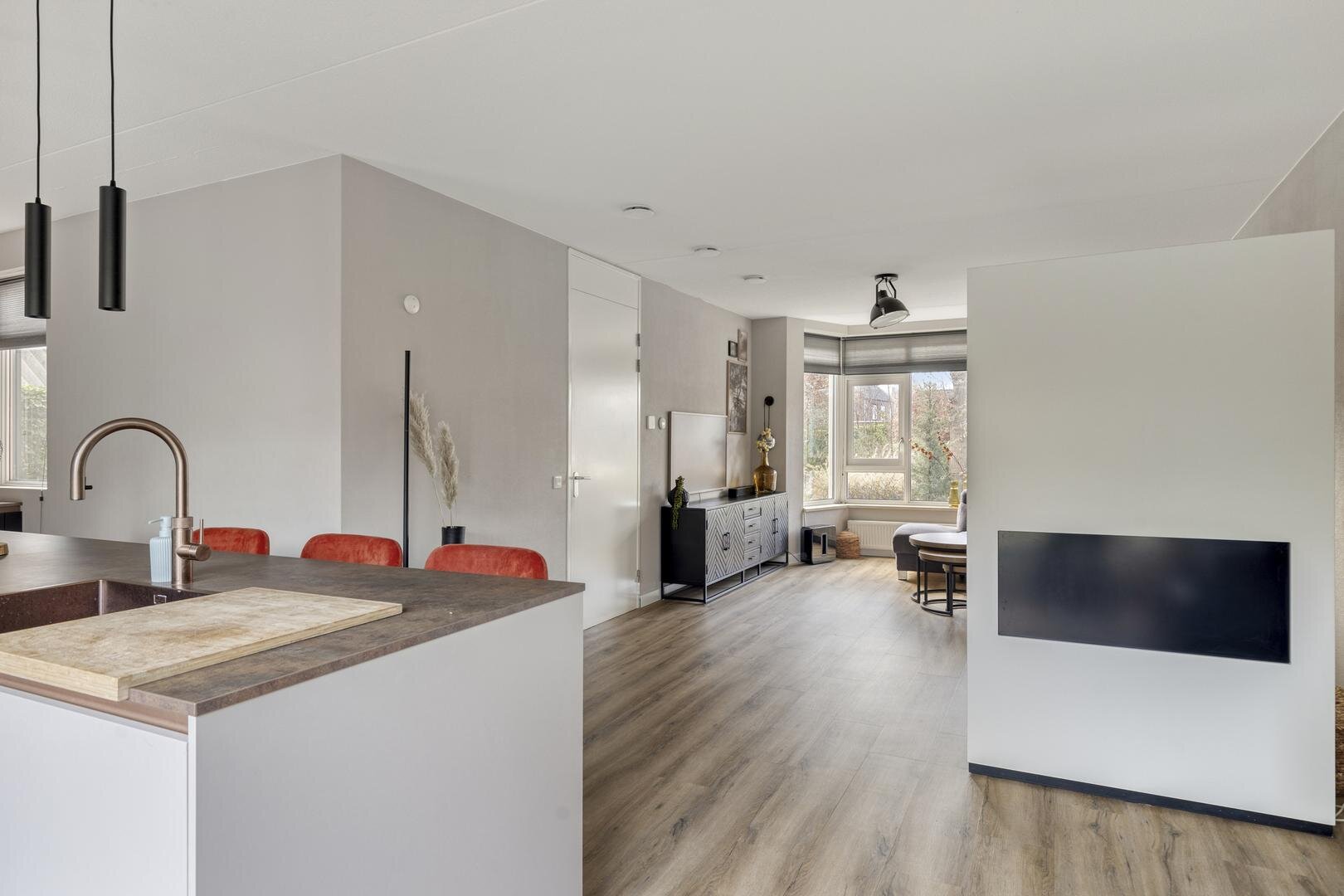 Begane grond: Via de entree met modern toilet bereik je de zeer ruime en lichte living, verdeelt in een woonkamer aan de straatzijde, een centraal gelegen keuken en een tuingerichte eetkamer. De totale afmeting van deze ruimte is maar liefst 62 m² en aan de achterzijde zijn 2 schuifpuien aanwezig waardoor er volop verbinding is met de tuin. De erker aan de voorzijde zorgt voor een prettige lichtinval en als gevolg van de ligging tegenover een groenstrook ervaar je hier ook opvallend veel privacy. Centraal in de ruimte is de keuken gepositioneerd, een combinatie van een groot kook-/spoeleiland en een kastenwand met 'koffiecorner'. De keuken is in 2024 geplaatst, uitgevoerd in een moderne stijl en o.a. voorzien van inductiekookplaat met veldafzuiging, vaatwasser, Quooker, oven en koelkast. Vanuit de eetkamer is de bijkeuken bereikbaar, die tevens dienst doet als entree vanaf de oprit.