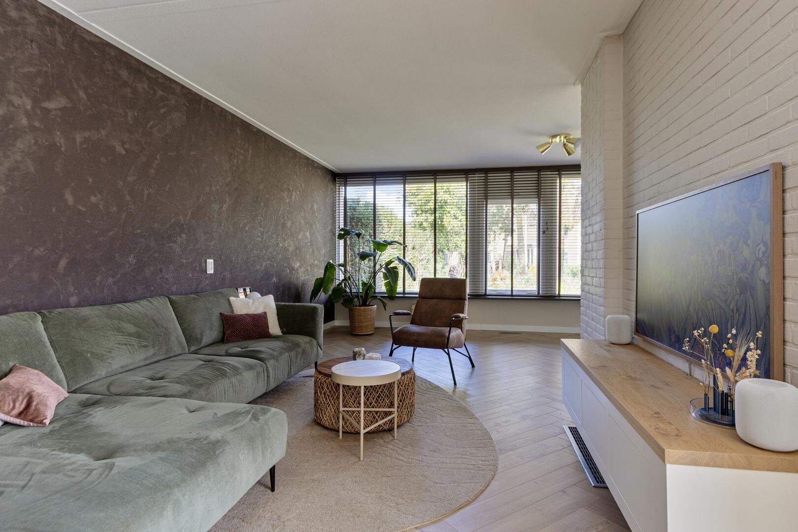 De woonkamer is bereikbaar vanuit de hal en vormt het centrale punt van de woning. De ruimte is ruim opgezet en beschikt over een mooie raampartij met zicht op de tuin, wat zorgt voor een prettige verbinding met buiten. De woonkamer is praktisch in te delen met een zit- en eetgedeelte en is voorzien van een visgraatvloer. De keuken (2015) sluit hierop aan en is voorzien van een vaatwasser, combi-oven, inductiekookplaat en afzuigkap. Vanuit de keuken is de bijkeuken bereikbaar.