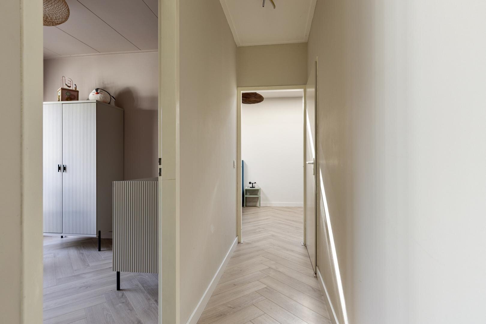 Aan de achterzijde van de woning bevinden zich de overige vertrekken. Hier vind je een slaapkamer van circa 9 m² en een tweede slaapkamer van circa 18 m². De badkamer is circa 1 jaar geleden vernieuwd, modern uitgevoerd en voorzien van een regendouche met handdouche, een wastafel, toilet en mechanische ventilatie.