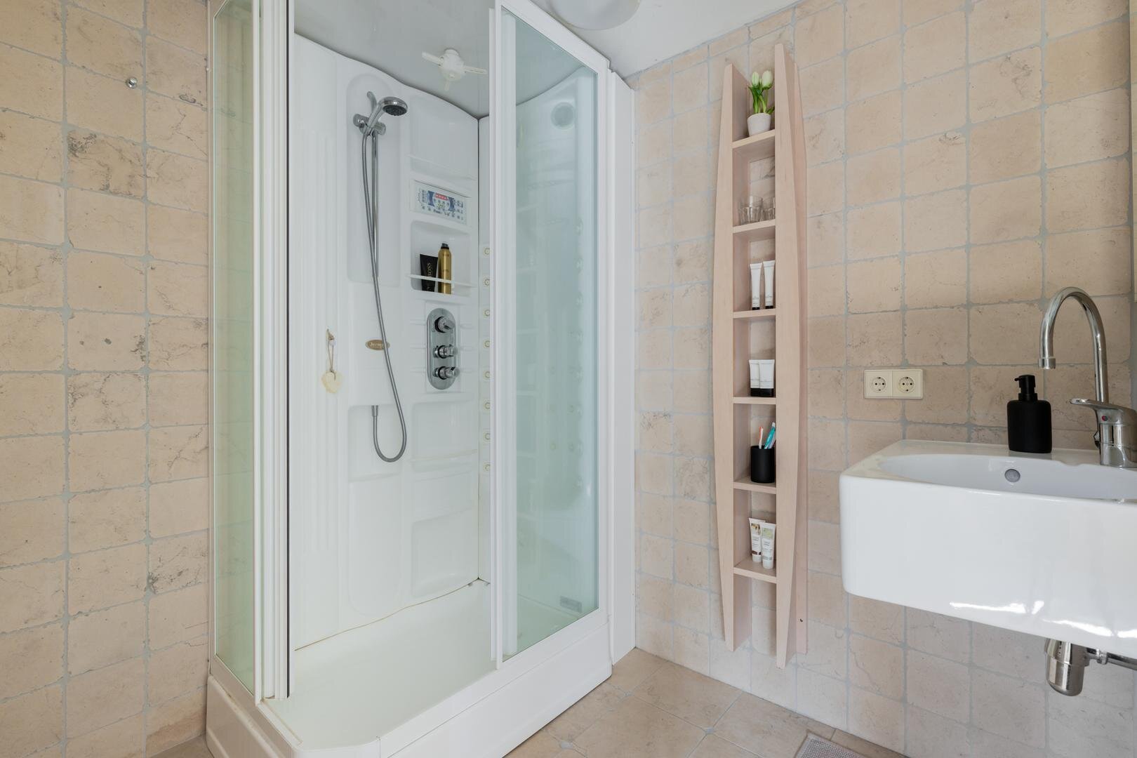 Entree/hal met open verbindingen naar de begane grond en de woonverdieping. Op de begane grond is het toilet gesitueerd alsmede een separate wasruimte. Aan de achterzijde bevindt zich een ruime kamer (ca. 16 m²) die zich uitstekend leent als slaapkamer, werkruimte of praktijk aan huis. De kamer beschikt over een eigen badkamer met douche en wastafel.
