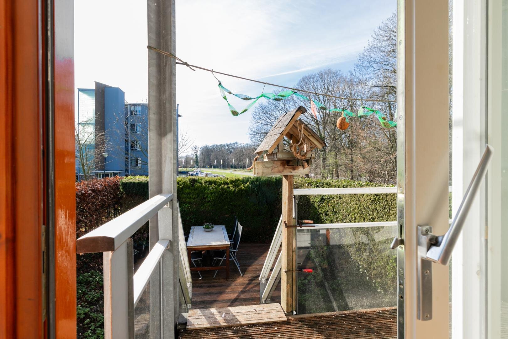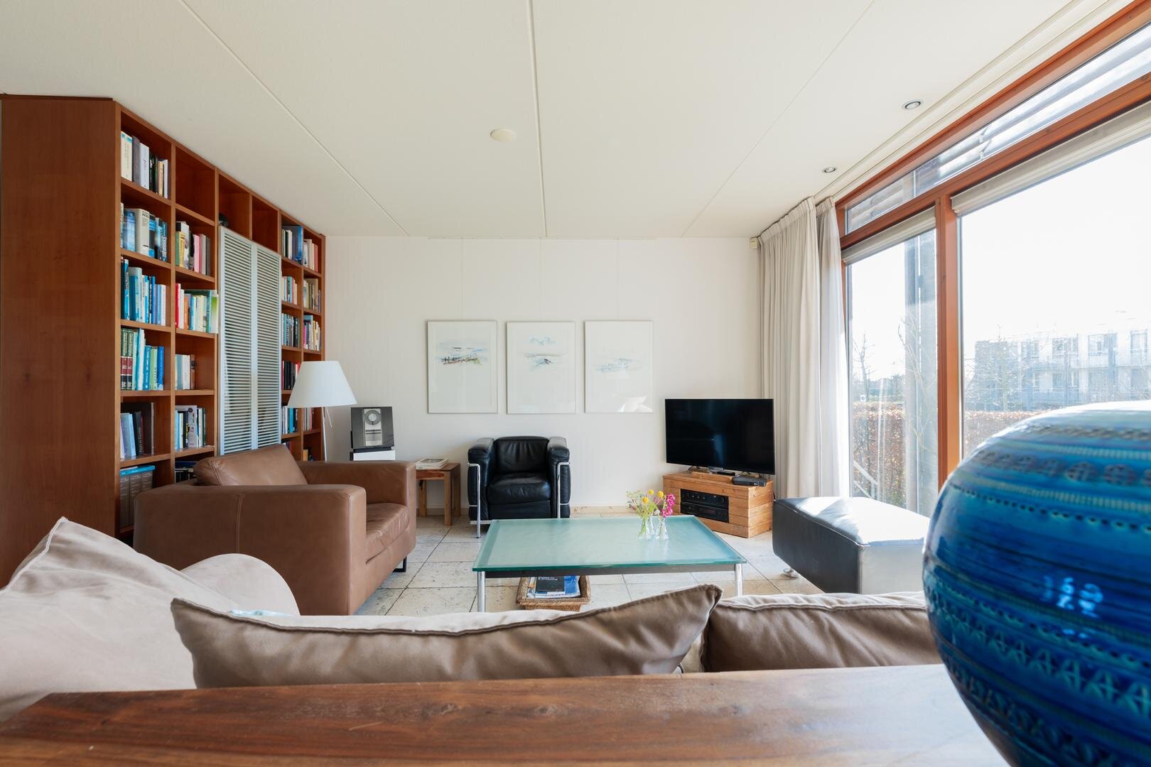 De woonverdieping is licht en ruim opgezet, met grote raampartijen en een prachtig uitzicht over het water en het groen. De woonkamer staat in open verbinding met de keuken en vormt samen een fijne, open leefruimte van zo'n 60 m². Via de openslaande deuren stap je zo het vlonderterras aan het water op — een heerlijke plek om te ontspannen en te genieten van de omgeving.