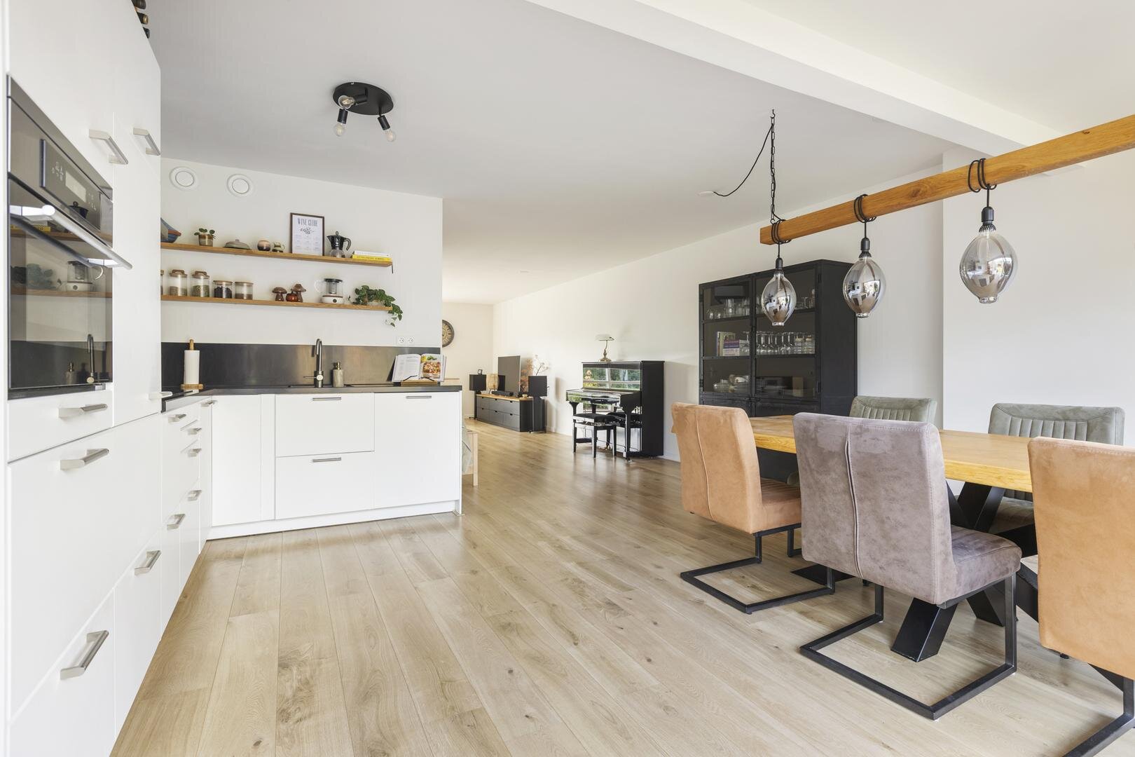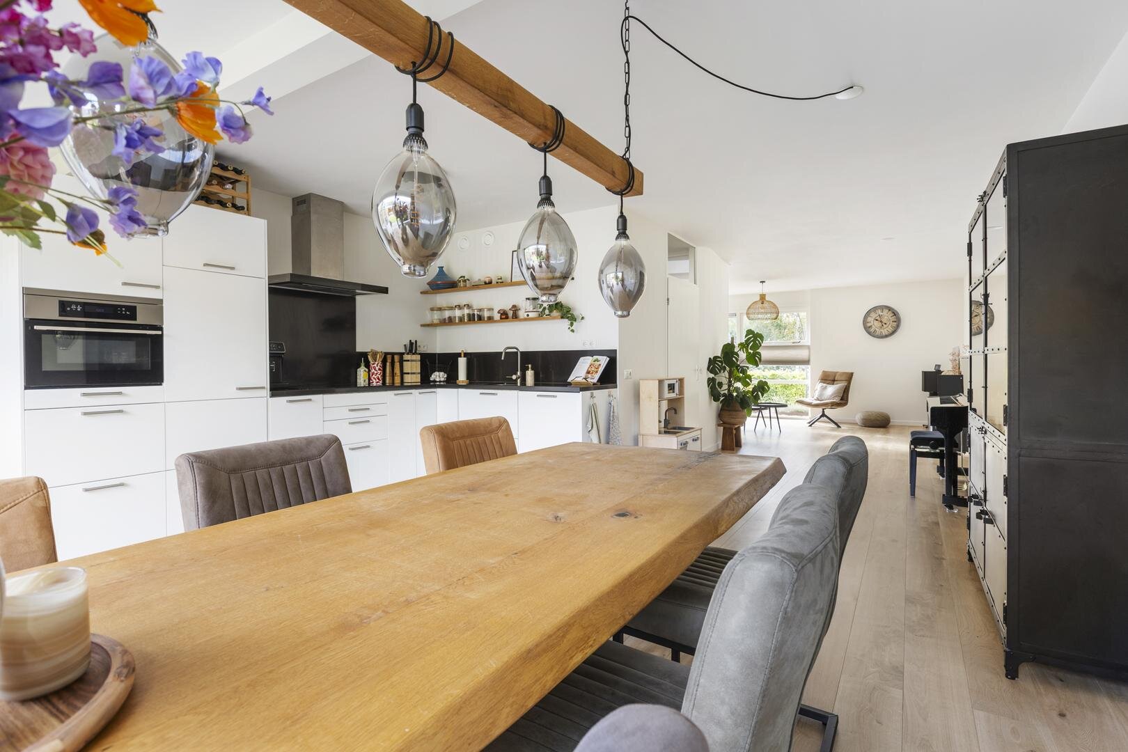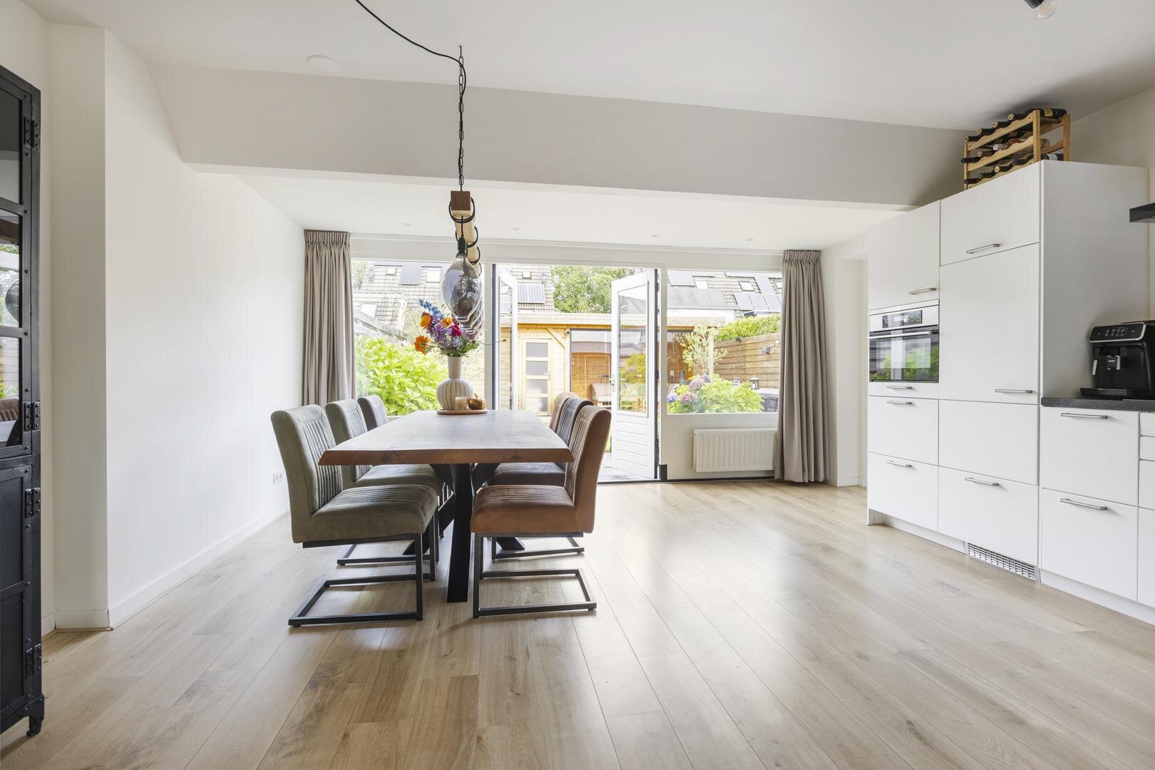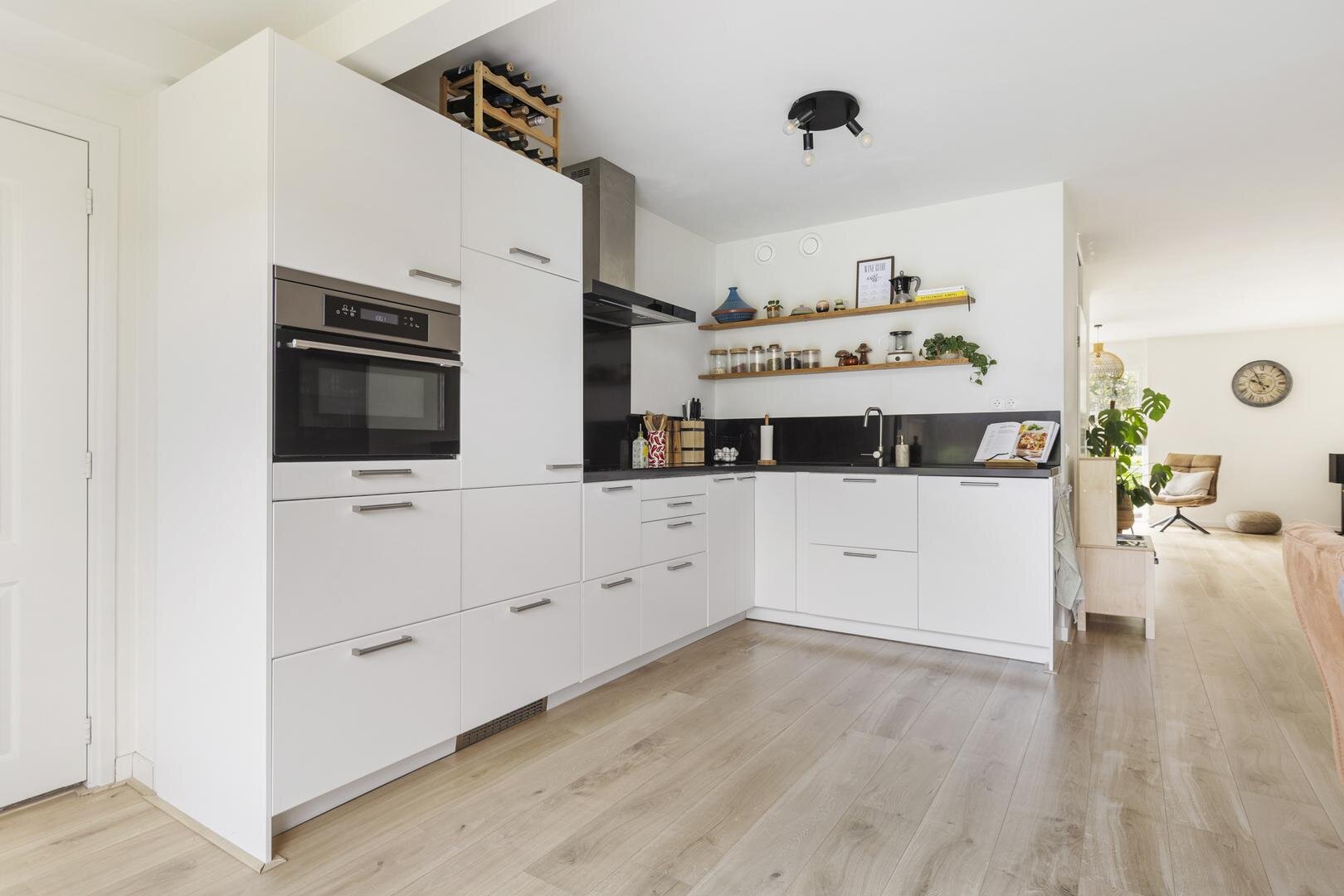 Begane grond: entree/hal, moderne toiletruimte (2021), royale en lichte woonkamer met aansluitend een eetkamer (totaal ca. 46 m²), open keuken van ca. 7 m² met een moderne keukenopstelling uit 2021 en voorzien van inductiekookplaat, afzuigkap, combi-oven, koelkast en vaatwasser. Vanuit de keuken kom je in de bijkeuken van ca. 7 m² met witgoedaansluiting en deur naar zowel de achtertuin als de berging van ca. 10 m² met toegang naar de oprit.