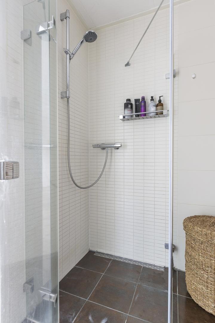 Eerste verdieping: overloop, drie slaapkamers van ca. 13, 9 en 7 m², nette badkamer met inloopdouche, wastafelmeubel en tweede toilet (sanibroyeur).